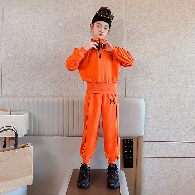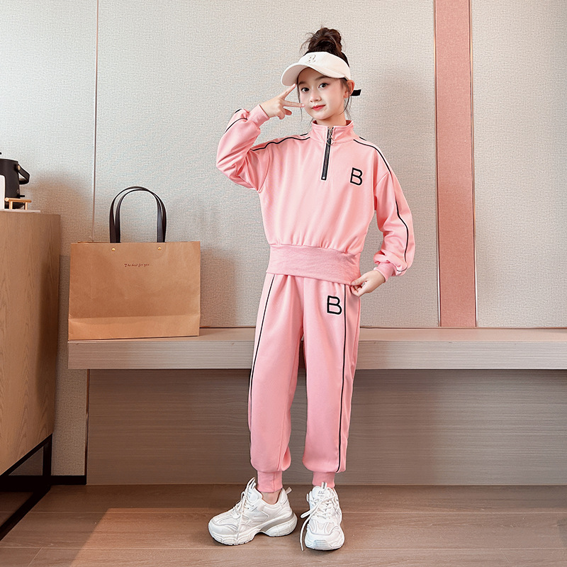 Zhongda 소녀의 유행 서양 스타일 캐주얼 운동복 세트 하프 지퍼 칼라 탑 레그 바지 스포츠 투피스 세트