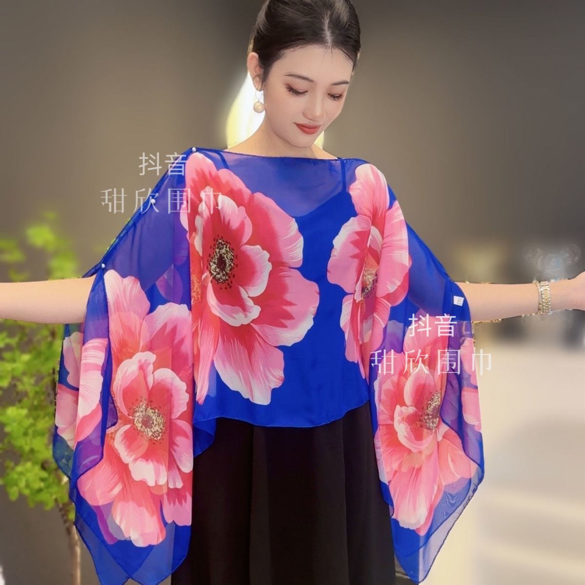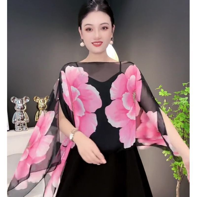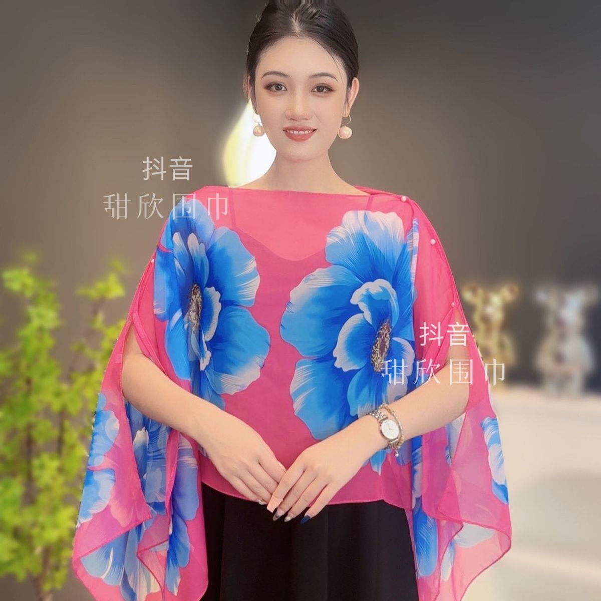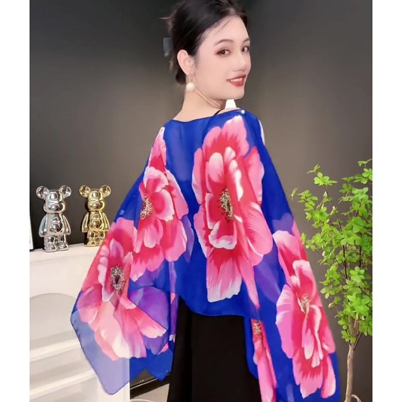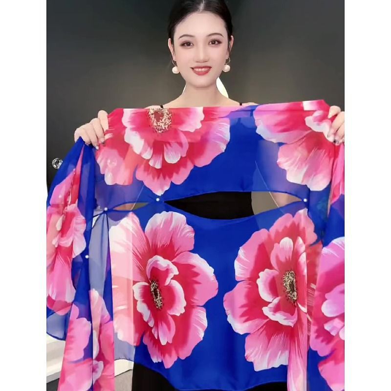[레트로 숄] 여름 밝은 색 큰 꽃 패션 펄 숄 선 스크린 셔츠 기질 우아한 여행 필수