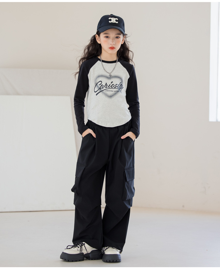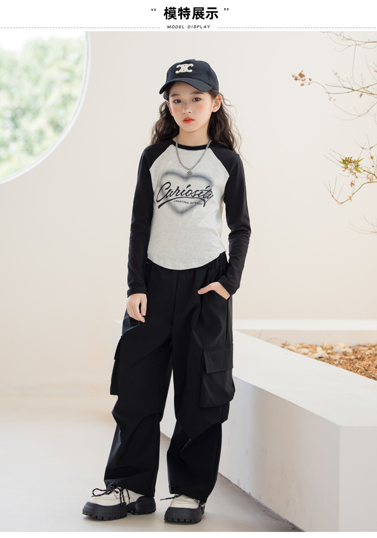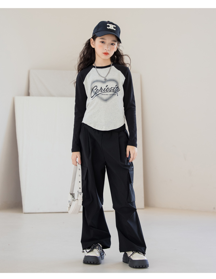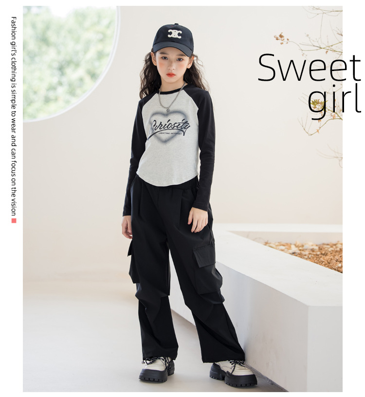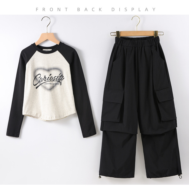 여아 작업복 정장 2025 봄 긴팔 티셔츠 + 와이드 팬츠 투피스 세트 아우터 레이어링 셔츠 큰 아동복