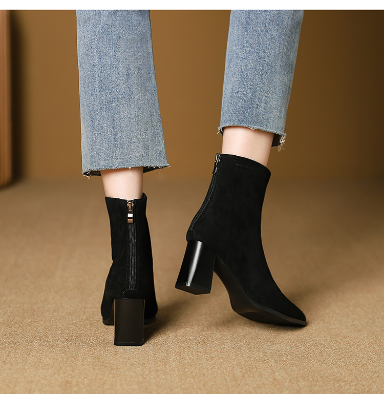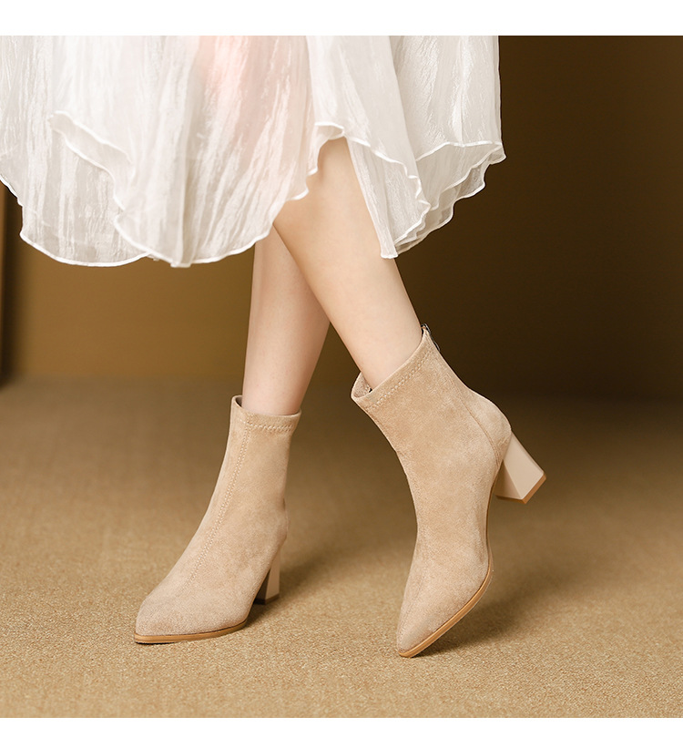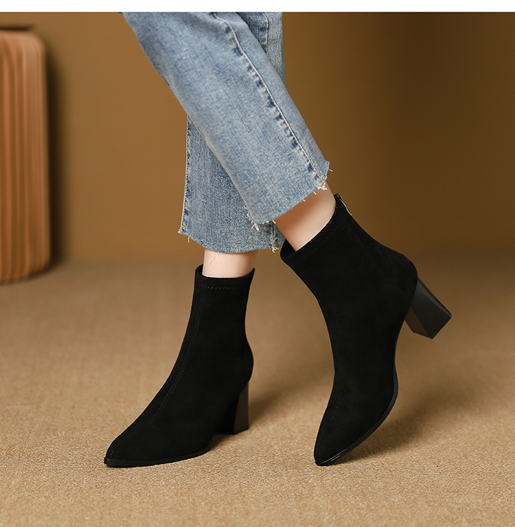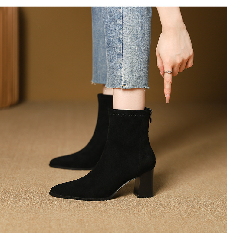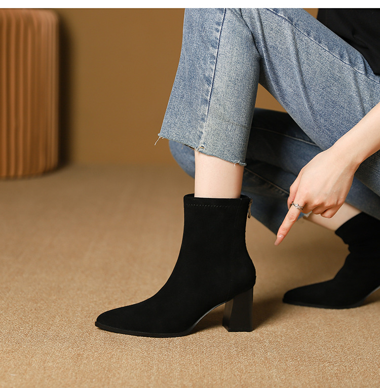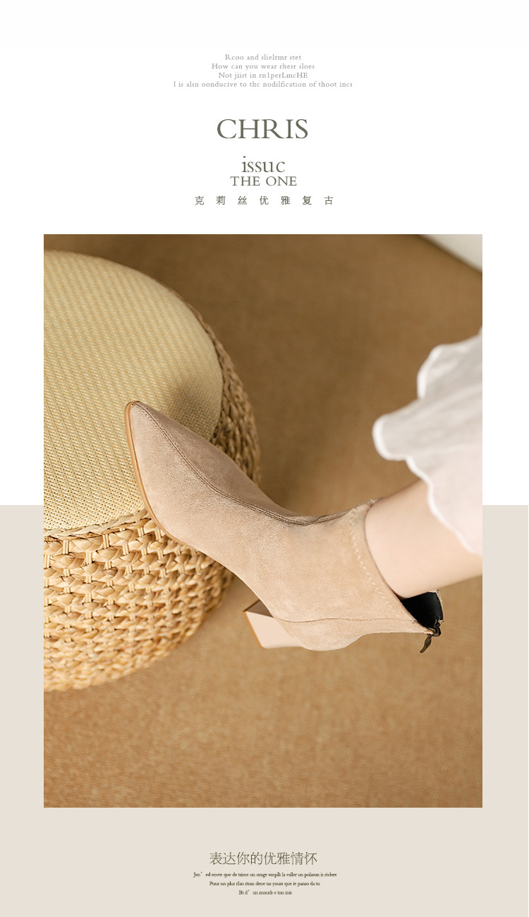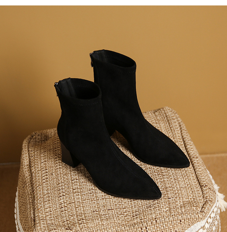 스웨이드 뾰족한 하이힐 앵클 부츠 여성용 뾰족한 부츠 후면 지퍼 앵클 부츠 봄과 가을 싱글 부츠 여성용 청키 힐 부츠