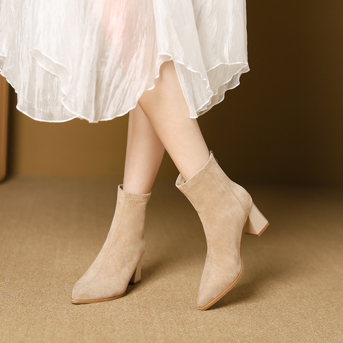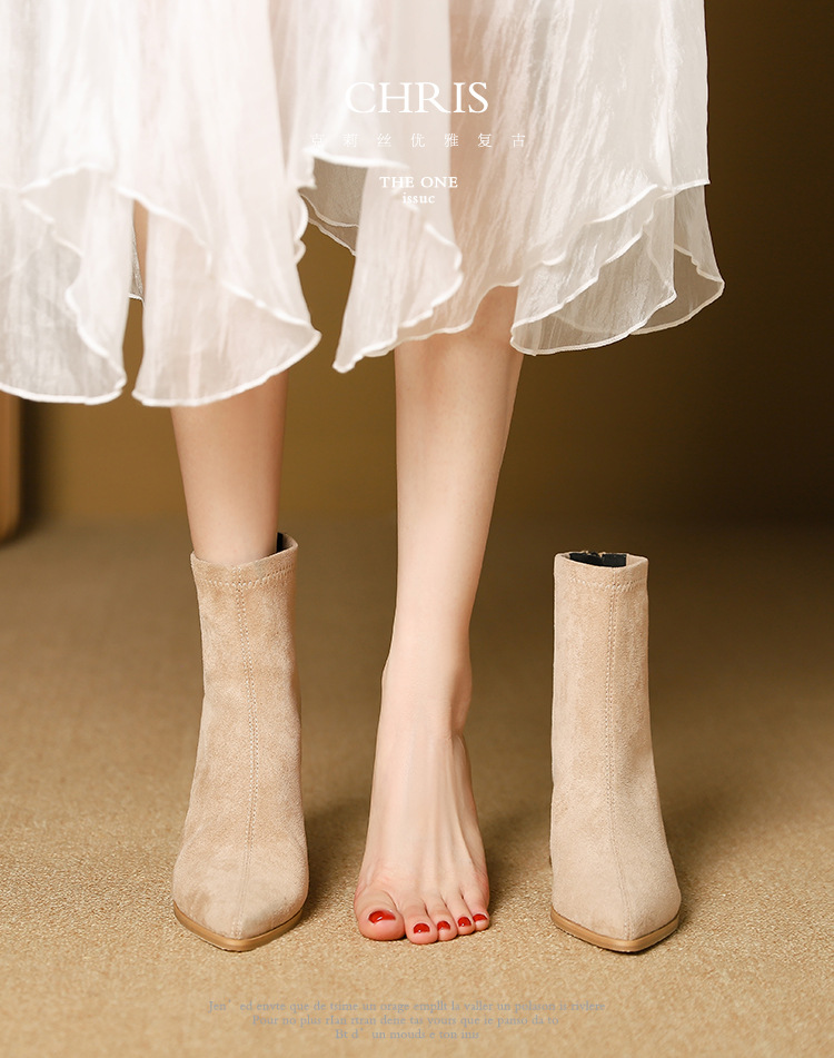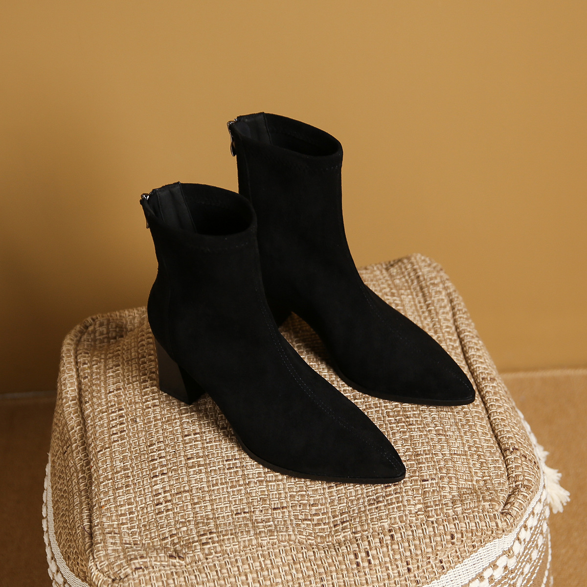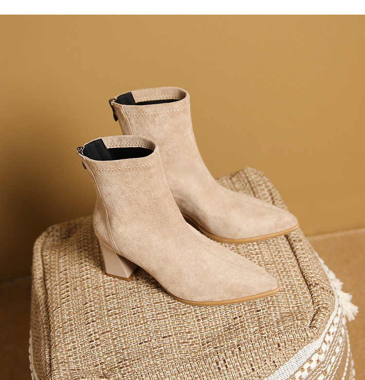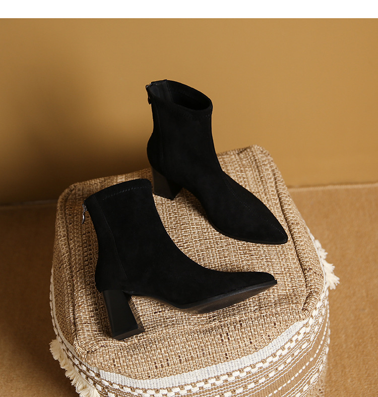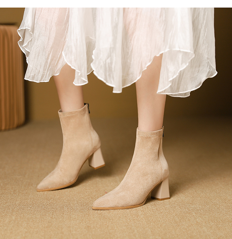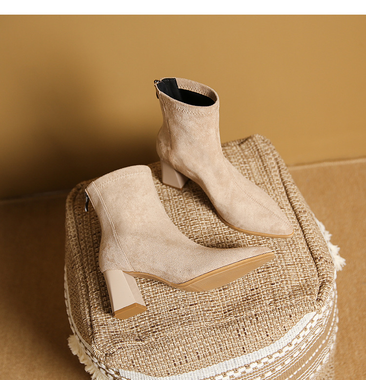 스웨이드 뾰족한 하이힐 앵클 부츠 여성용 뾰족한 부츠 후면 지퍼 앵클 부츠 봄과 가을 싱글 부츠 여성용 청키 힐 부츠