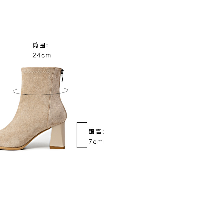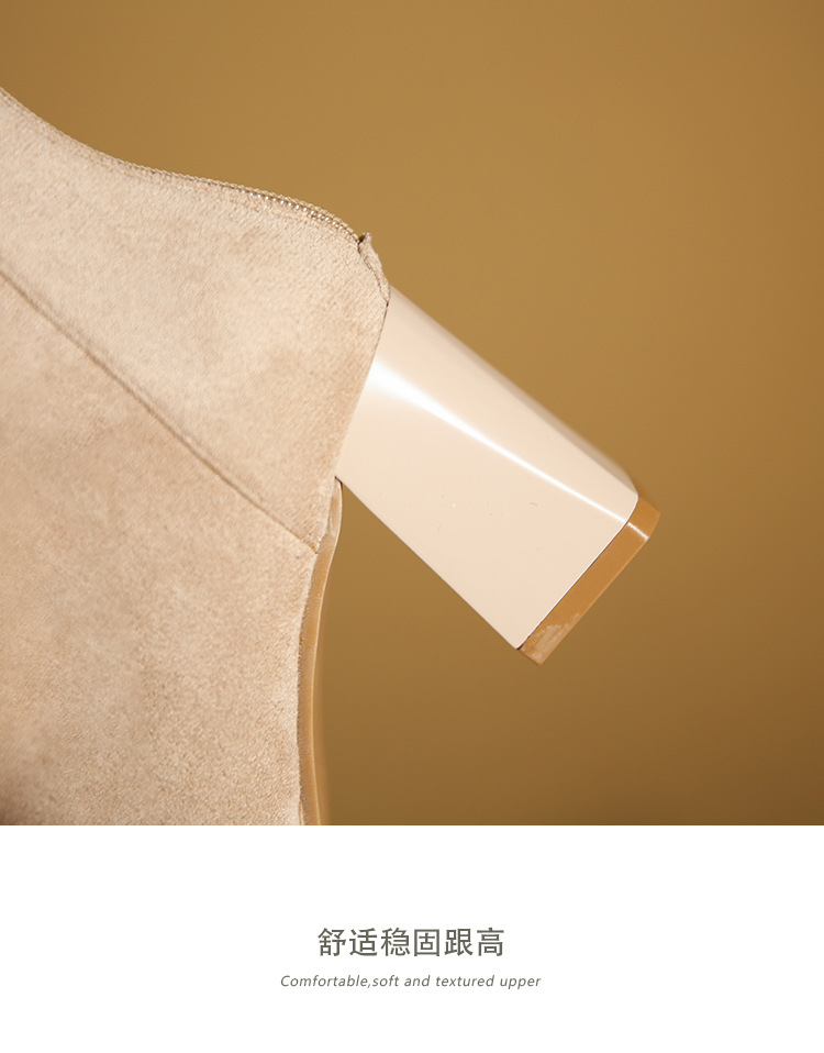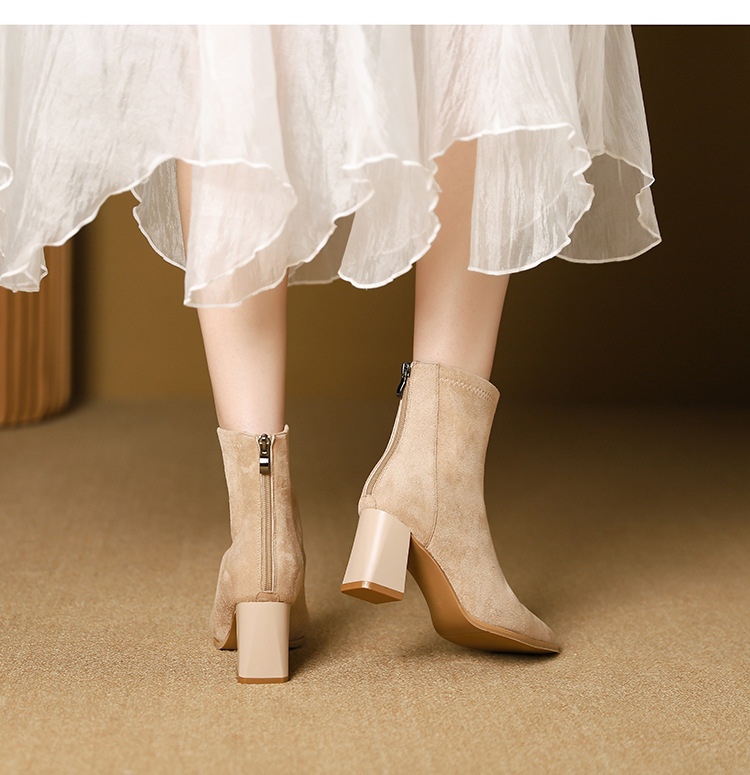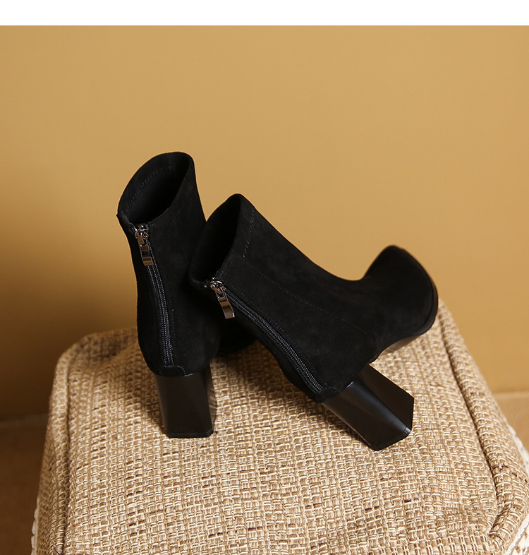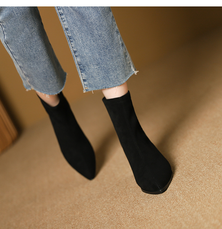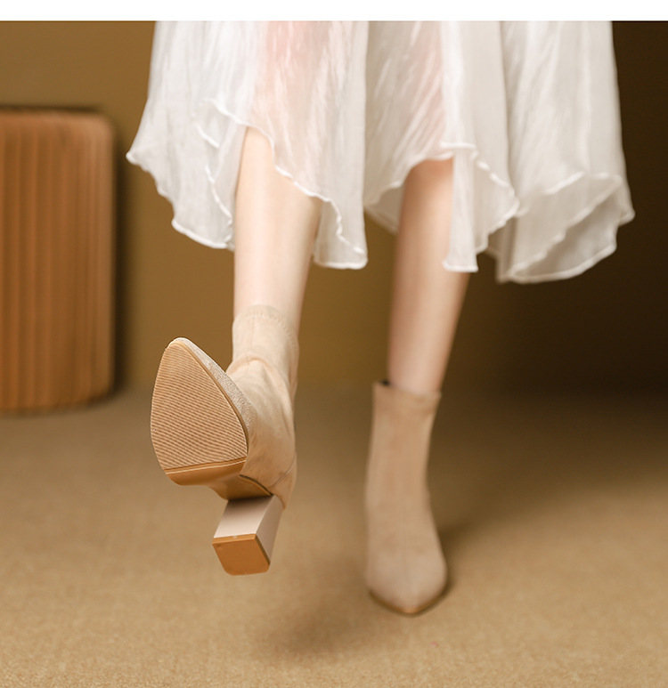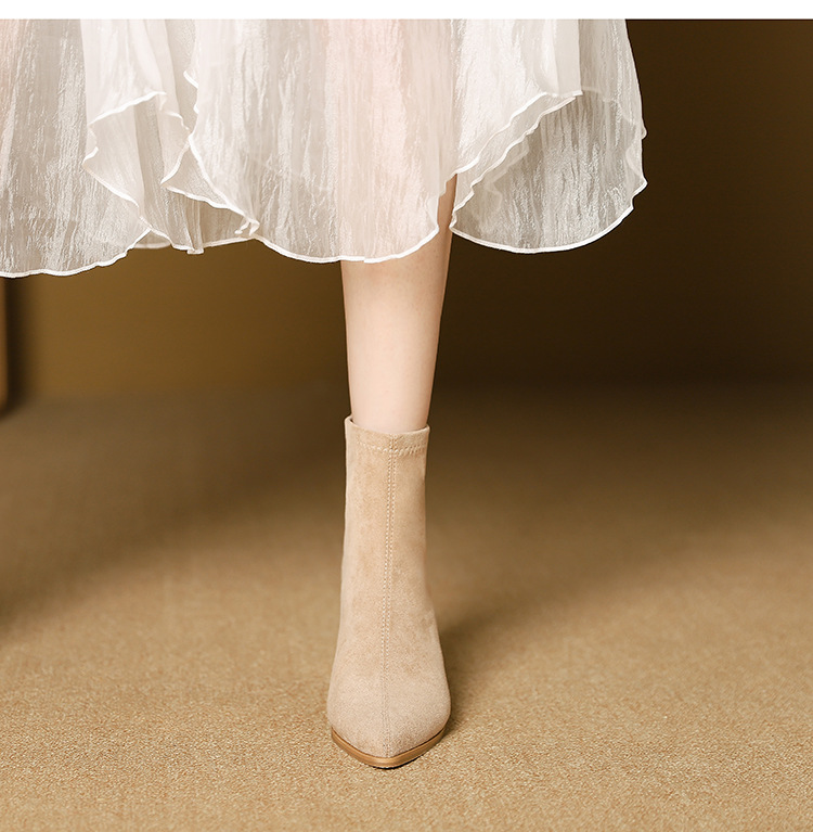 스웨이드 뾰족한 하이힐 앵클 부츠 여성용 뾰족한 부츠 후면 지퍼 앵클 부츠 봄과 가을 싱글 부츠 여성용 청키 힐 부츠