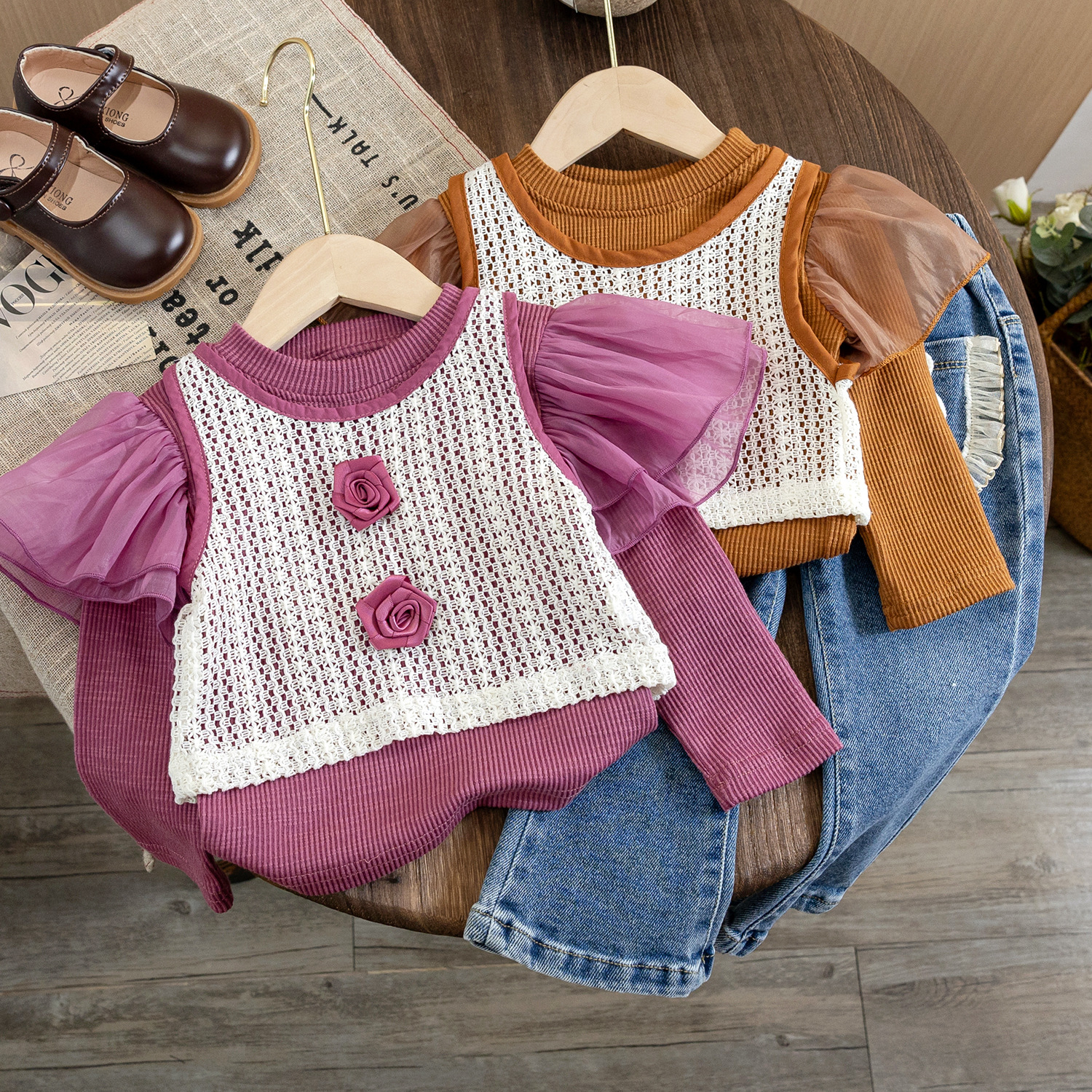 女童秋季套装2023新款女宝宝洋气马甲打底衫儿童春秋牛仔裤三件套