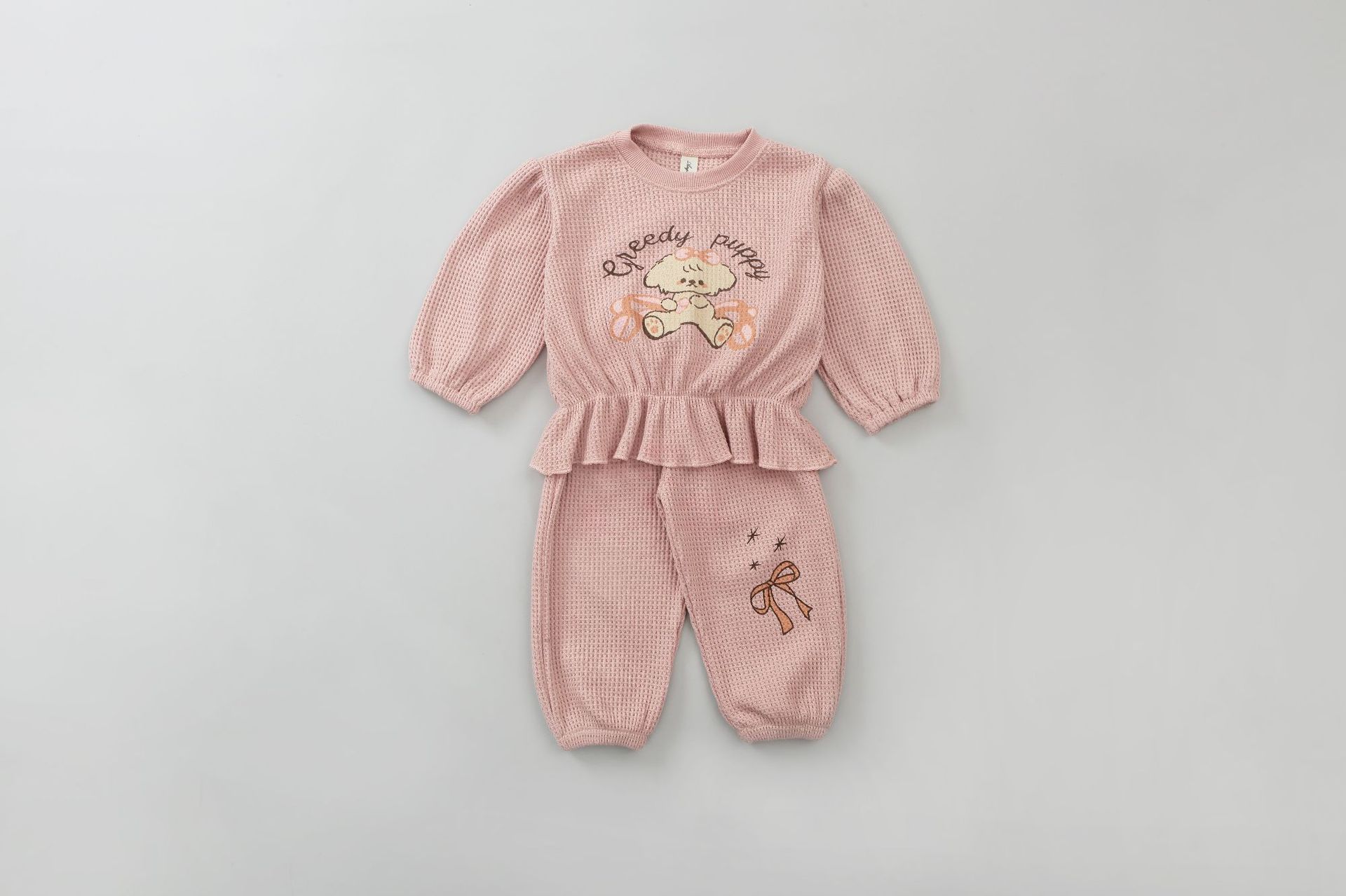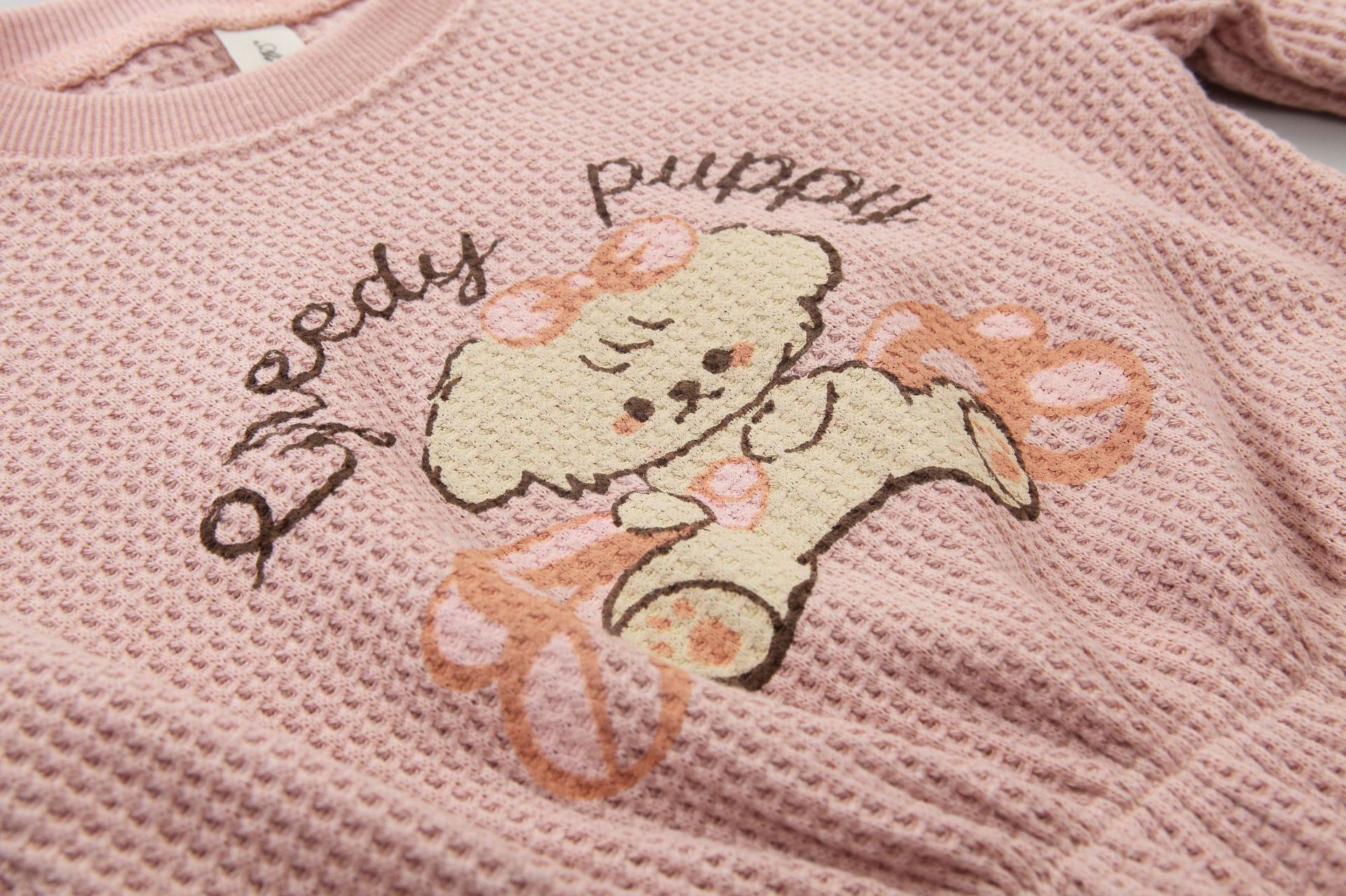2025년 가을 신상 한국 스타일 여아 세트, 달콤한 퍼프 소매, 귀여운 만화 캐릭터, 레깅스, 와플 패턴 투피스 세트