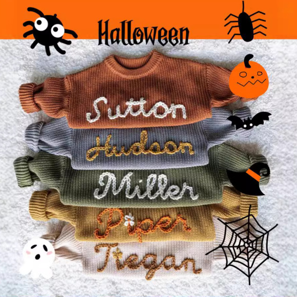 一件起订手工绣名字跨境现货万圣诞节 婴幼童纯棉A类针织圆领毛衣