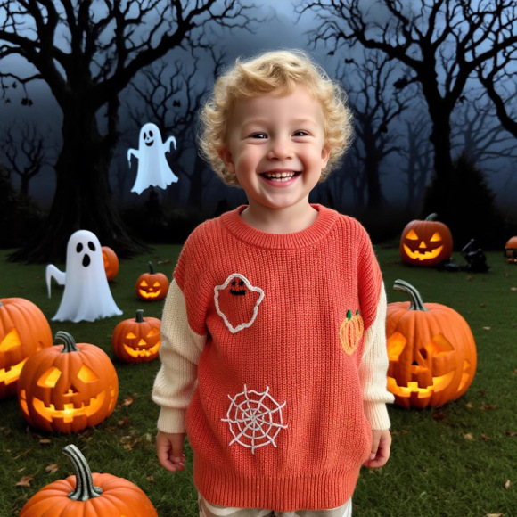 一件起订手工图案绣花跨境现货万圣节 婴幼童纯棉A类针织圆领毛衣