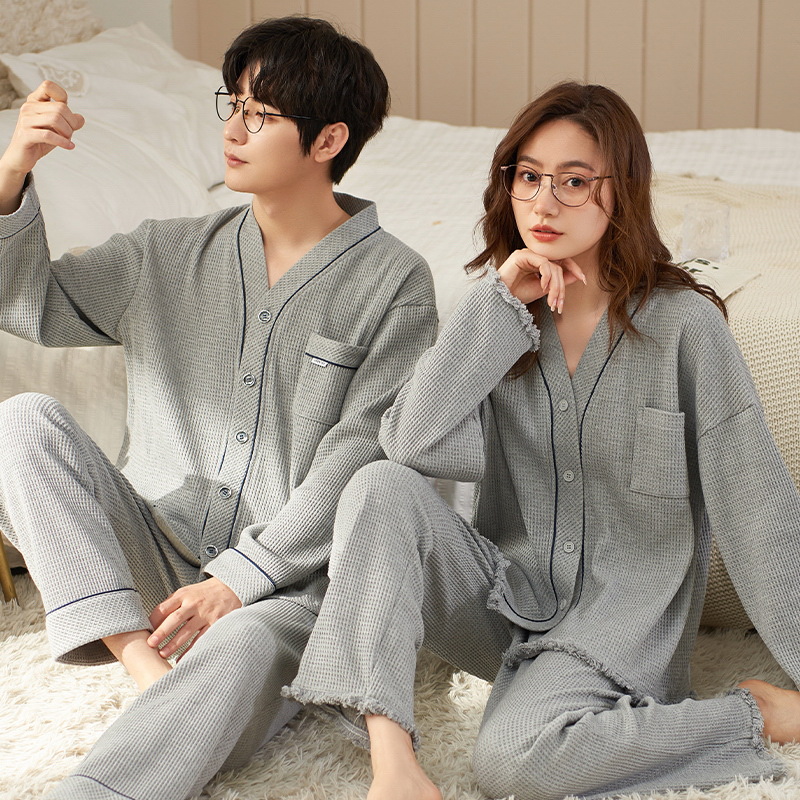 가을 커플 잠옷 남자와 여자의 와플 면 긴 소매 바지 가디건 귀여운 간단한 캐주얼 가정 의류 여성