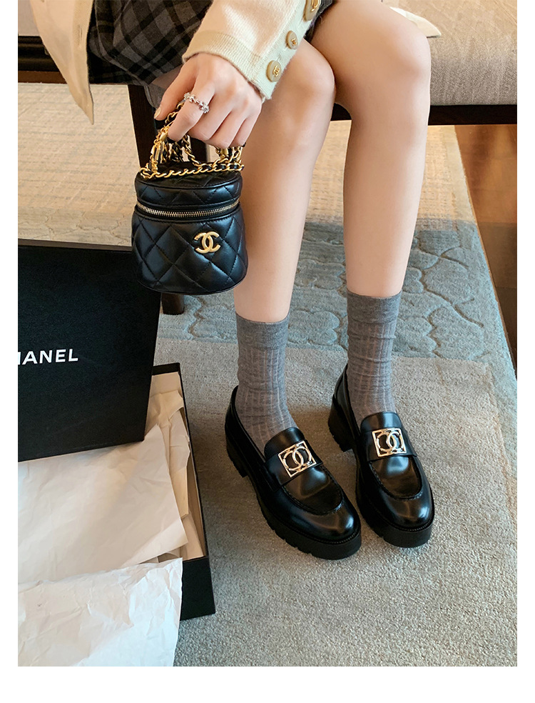 재고 있음 영국 대학 스타일 캐주얼 다재다능하고 패셔너블한 더블 C 금속 버클 라운드 투 두꺼운 밑창 두꺼운 굽 로퍼 작은 가죽 신발