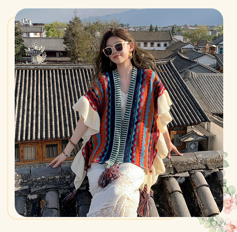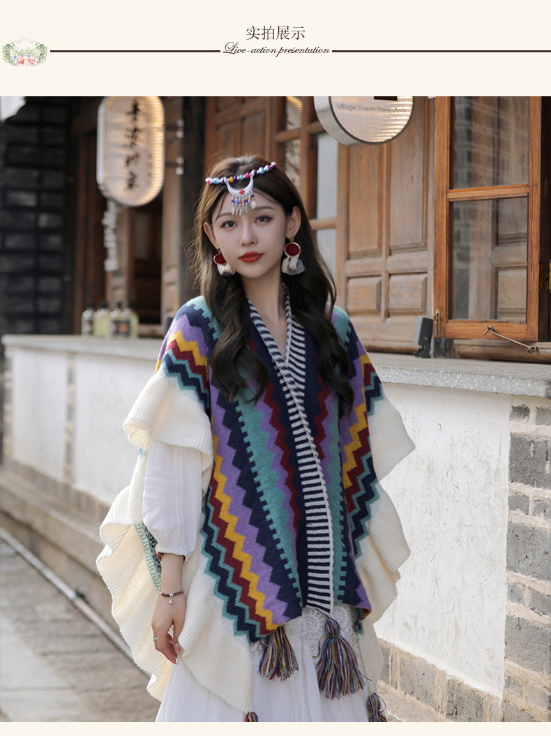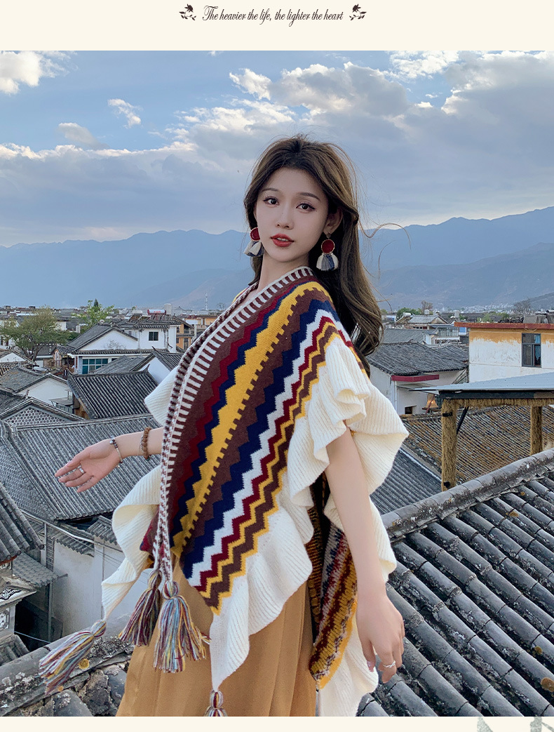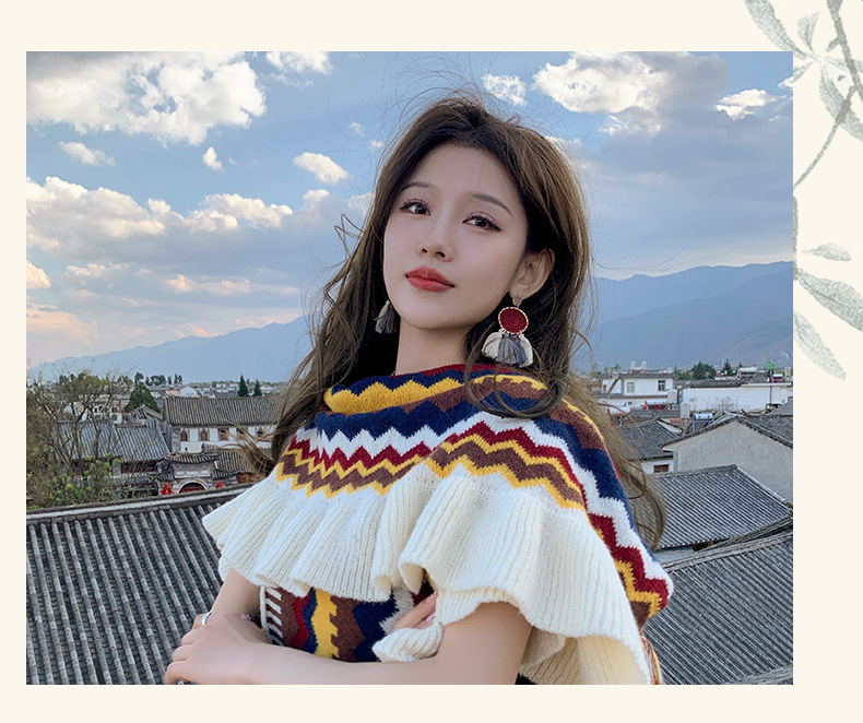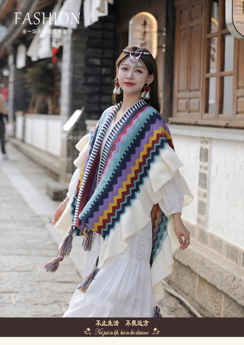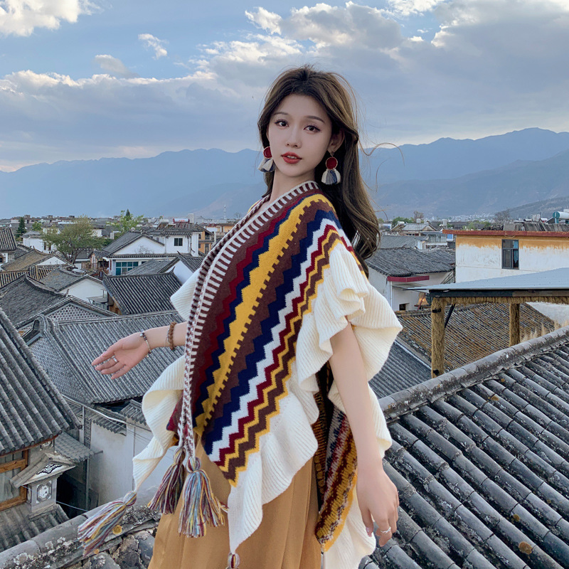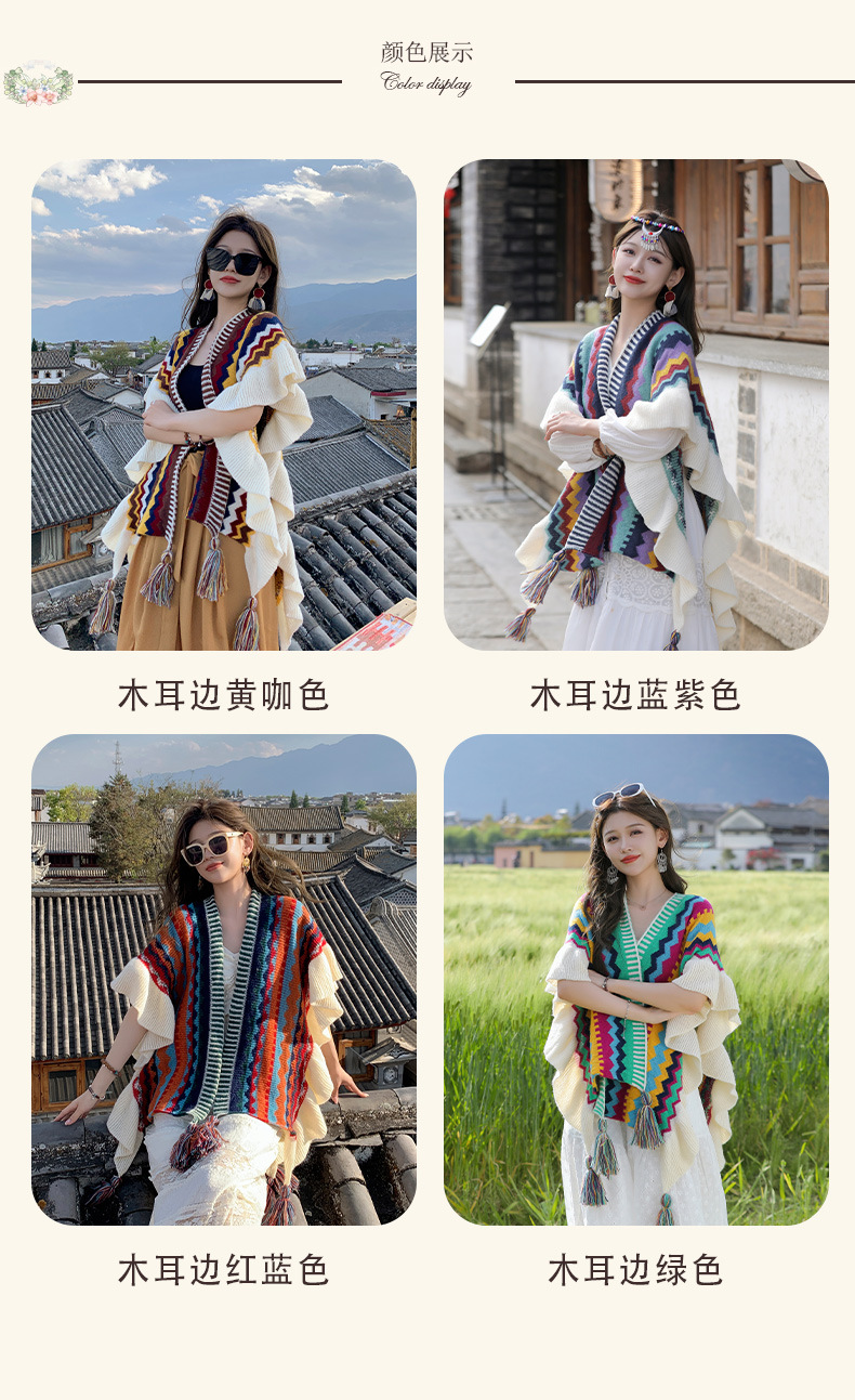 윈난 리장 달리 여행복 보헤미안 스타일 에스닉 스타일 숄 여성용 착용 나무 귀 테 니트 망토스토어 가기