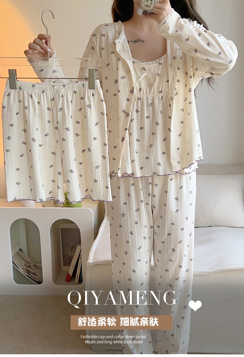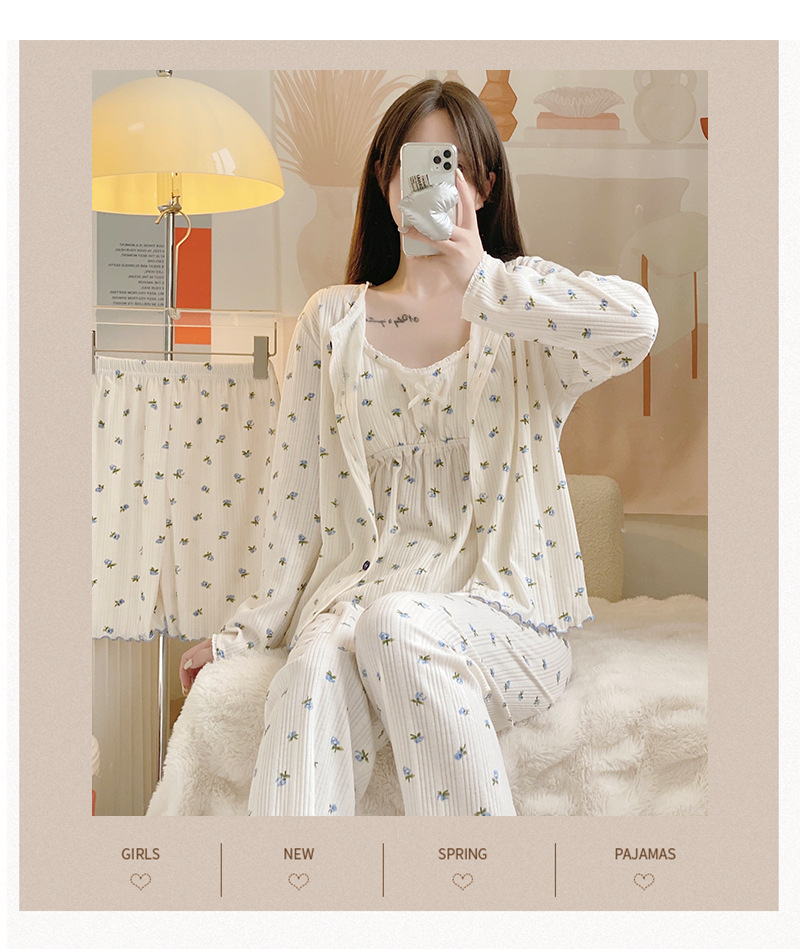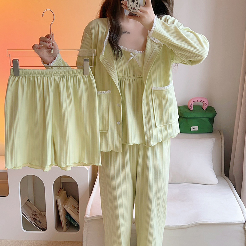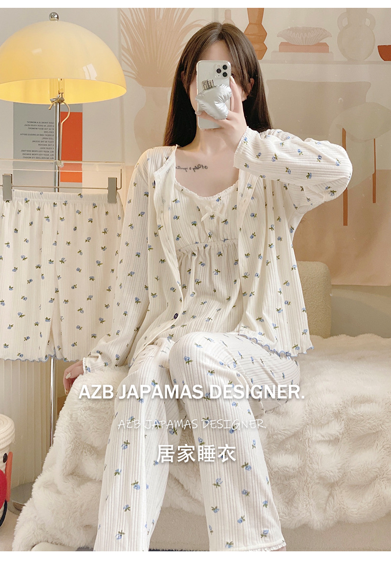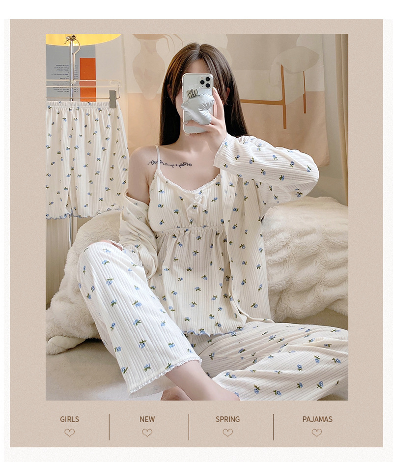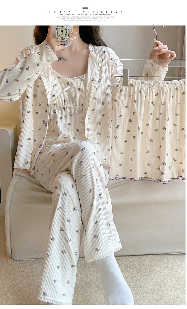 잠옷 여자의 봄과 가을 가슴 패드 달콤한 귀여운 소녀의 4 피스 세트 여름 느슨한 긴팔 가정 옷 겨울스토어 가기