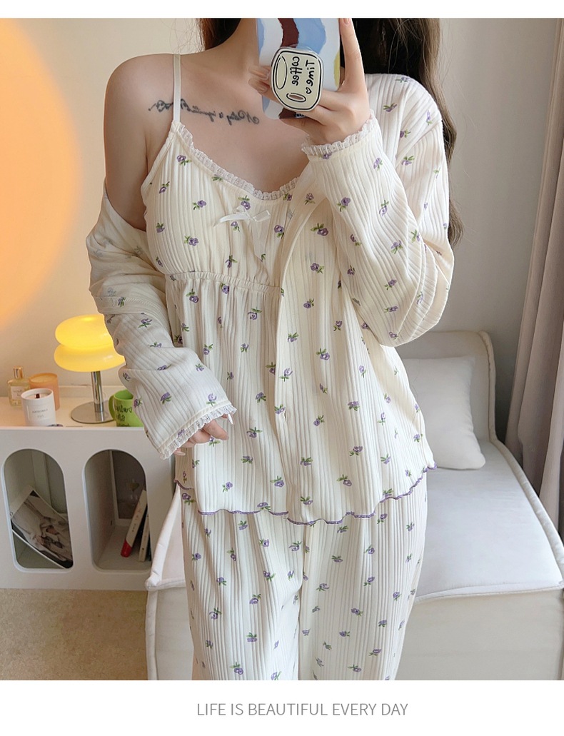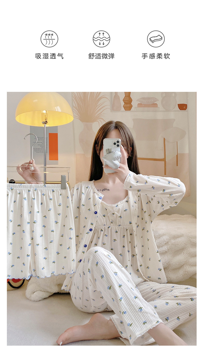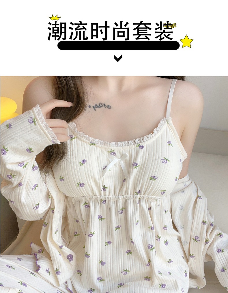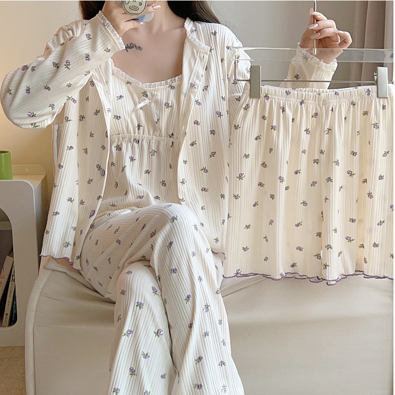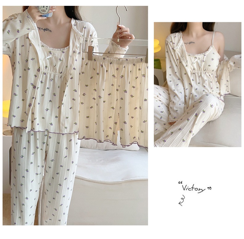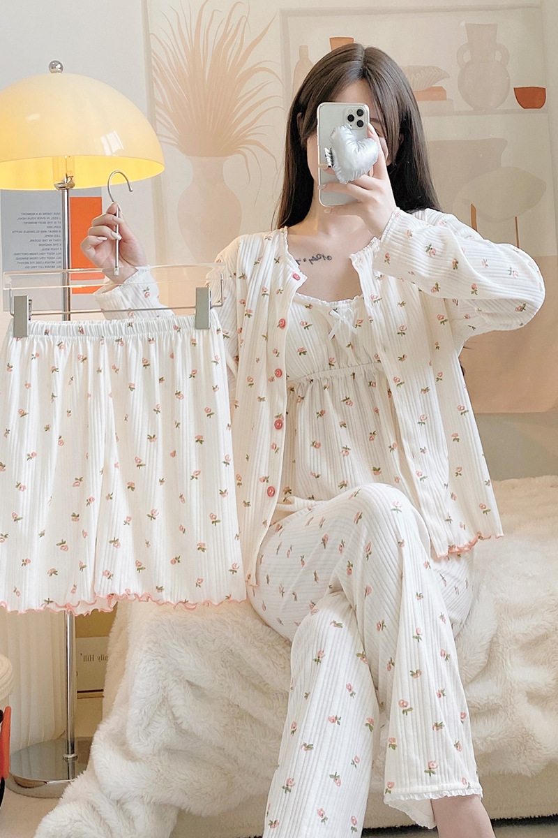 잠옷 여자의 봄과 가을 가슴 패드 달콤한 귀여운 소녀의 4 피스 세트 여름 느슨한 긴팔 가정 옷 겨울스토어 가기