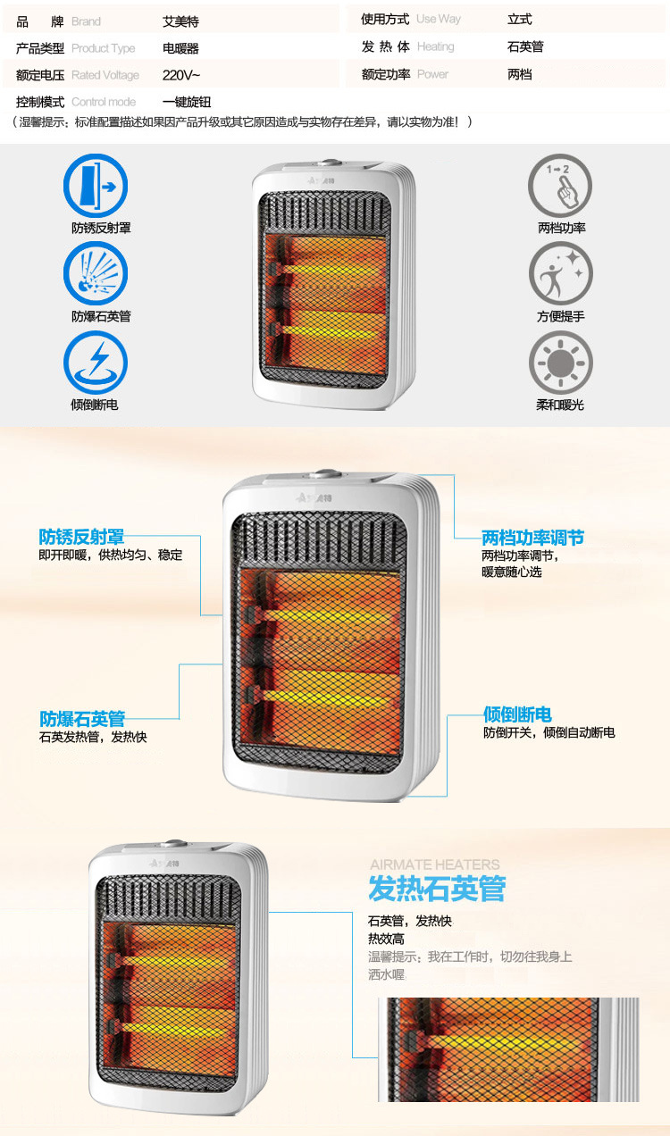 에밋 히터 석영 튜브 소형 태양열 히터 가정용 전기 난방 고속 난방 HQ8082/HQ12009B