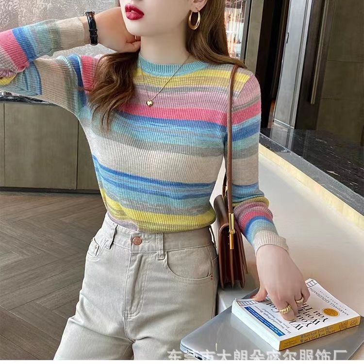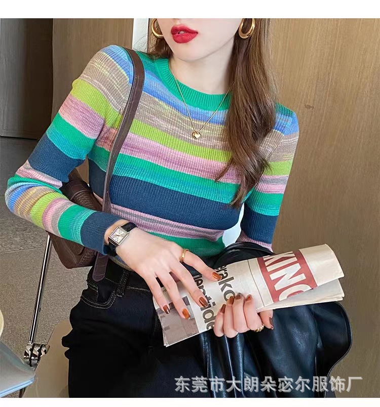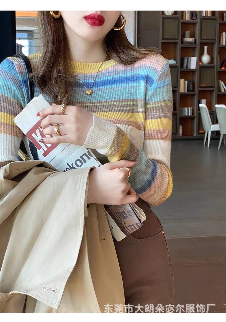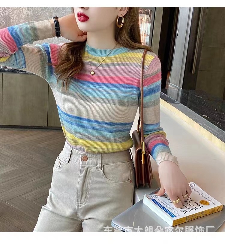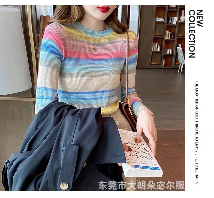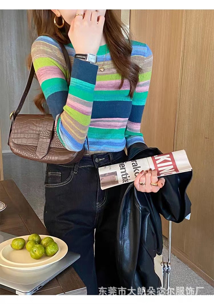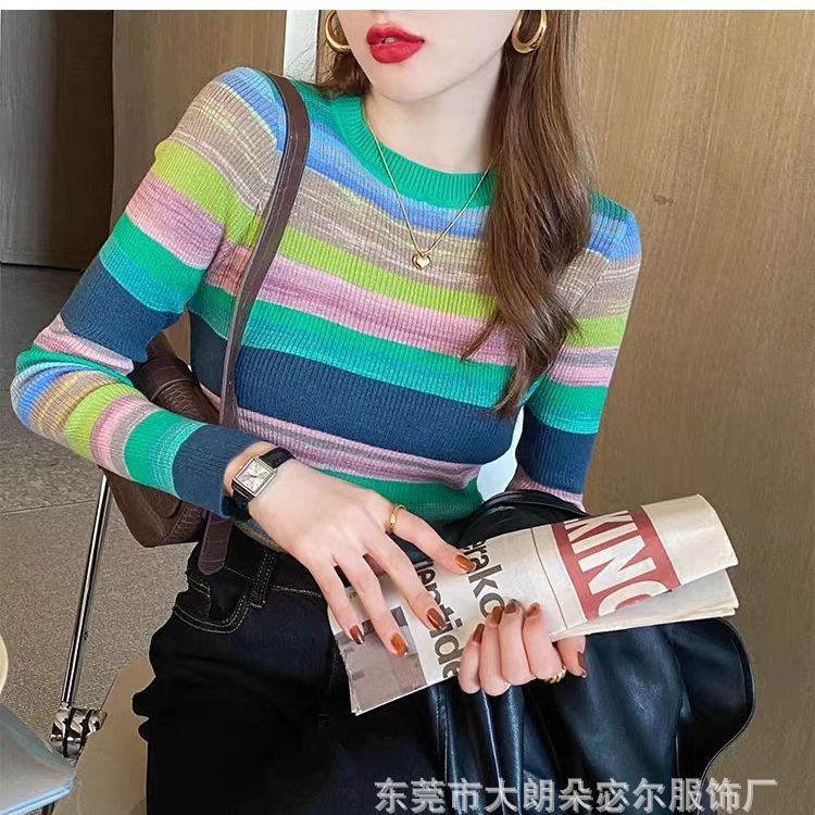 리우아오 초가을 여성 니트웨어 2023 스웨터 가을 이너웨어 베이스 셔츠 레인보우 스트라이프 일본 및 한국 캐주얼 스타일스토어 가기