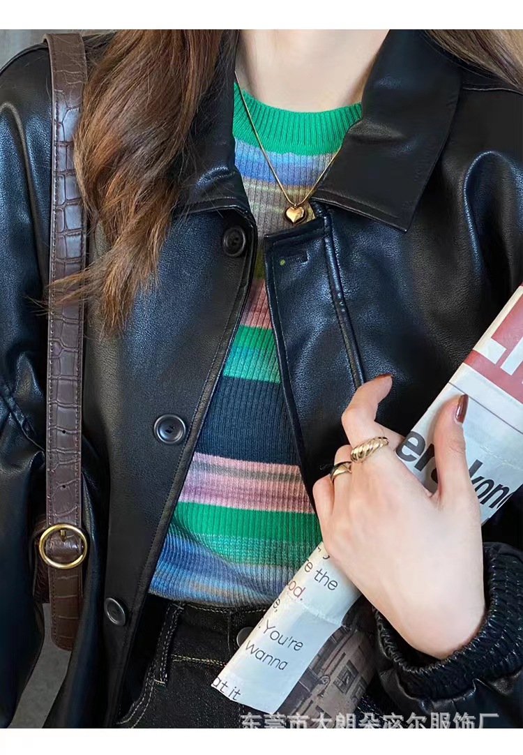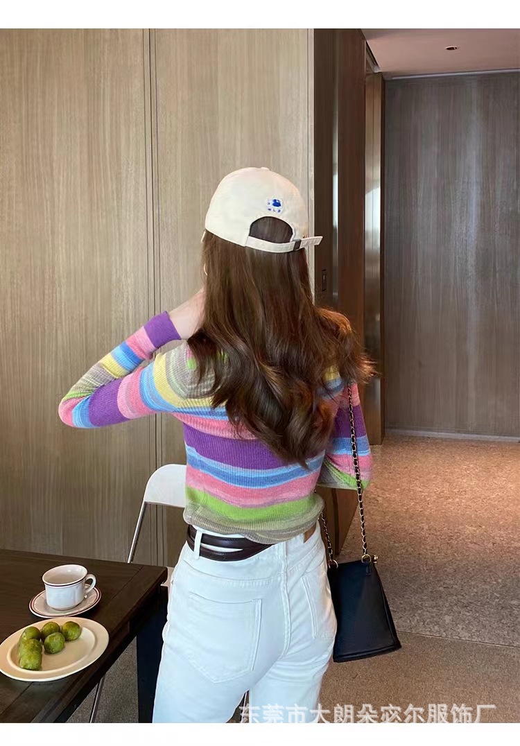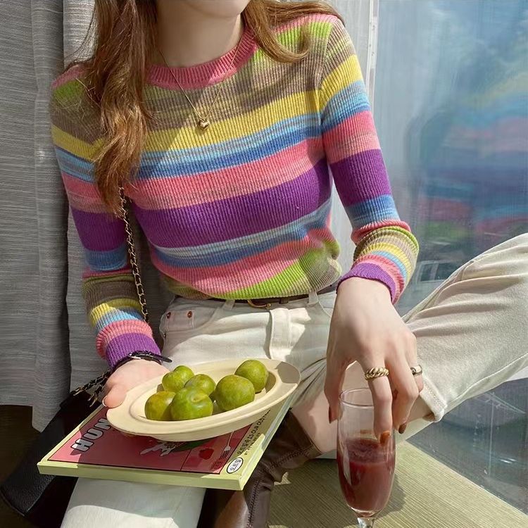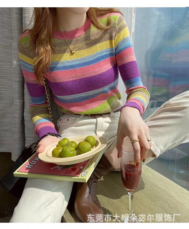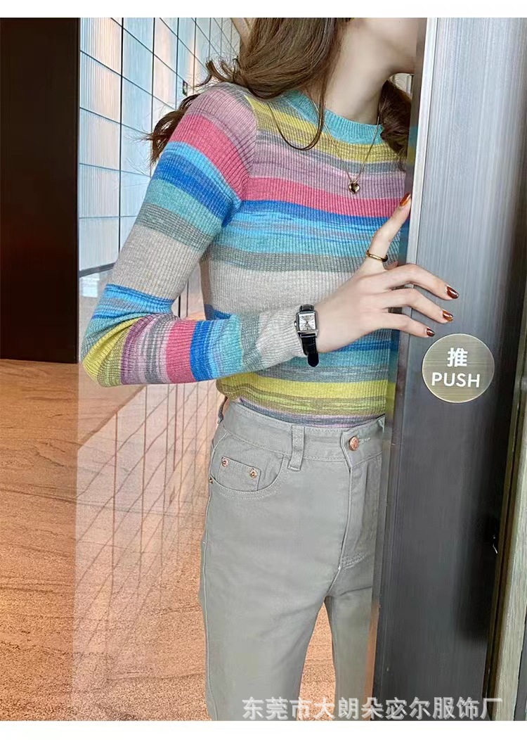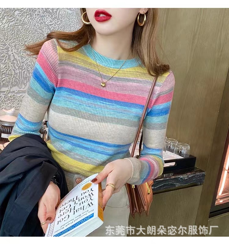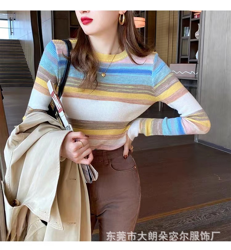 리우아오 초가을 여성 니트웨어 2023 스웨터 가을 이너웨어 베이스 셔츠 레인보우 스트라이프 일본 및 한국 캐주얼 스타일스토어 가기