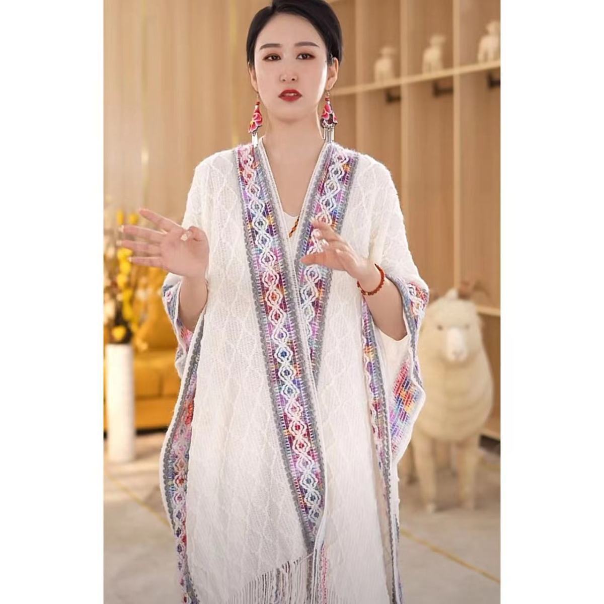 Miss He Da의 에스닉 스타일 다채로운 물결 모양의 숄 겉옷을 입고 니트웨어 윈난 여행 사진 망토를 입고