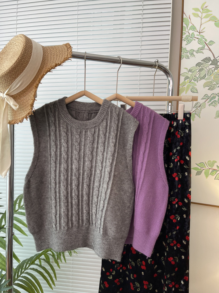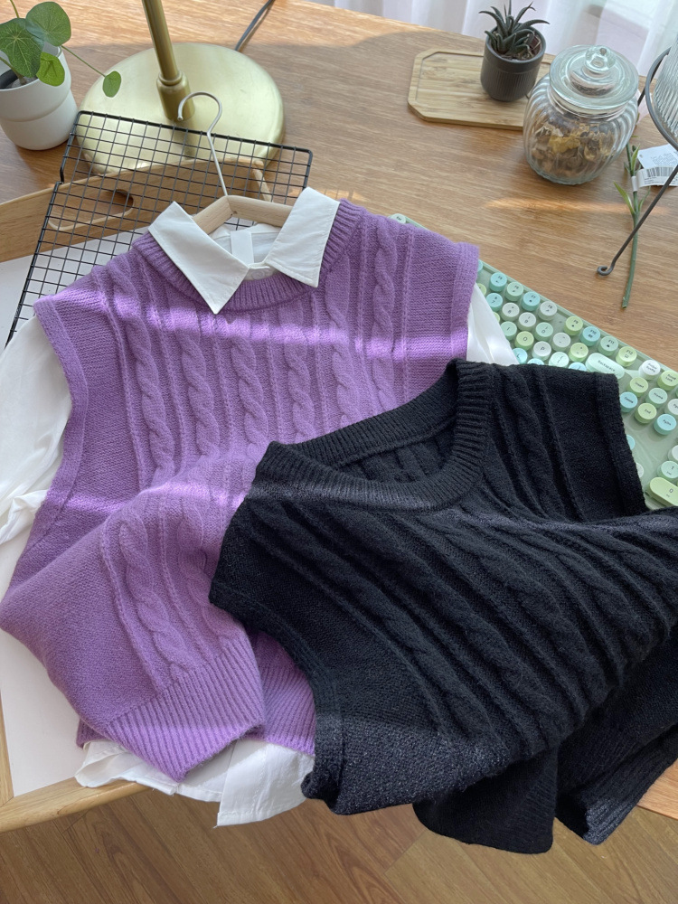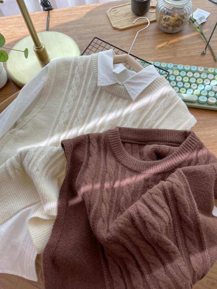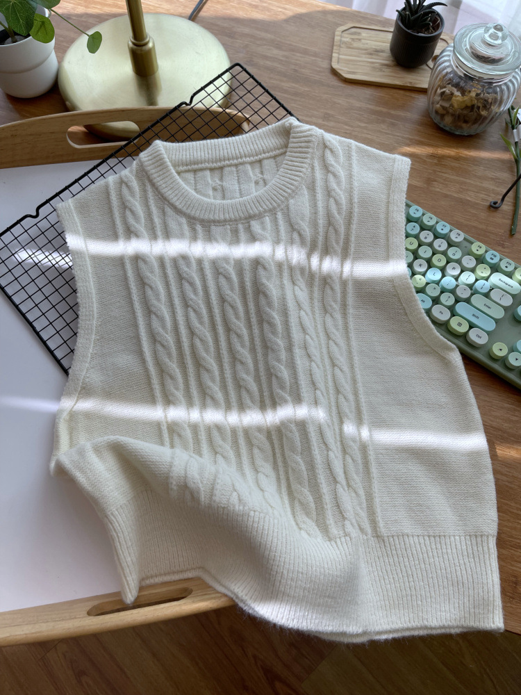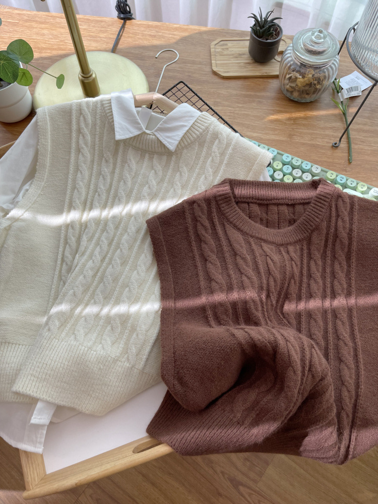 OOTD 가을 새로운 한국 스타일 레트로 게으른 스타일 단색 트위스트 라운드 넥 풀오버 민소매 니트 조끼 여성용스토어 가기