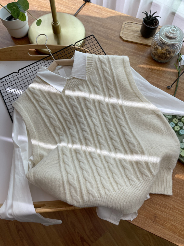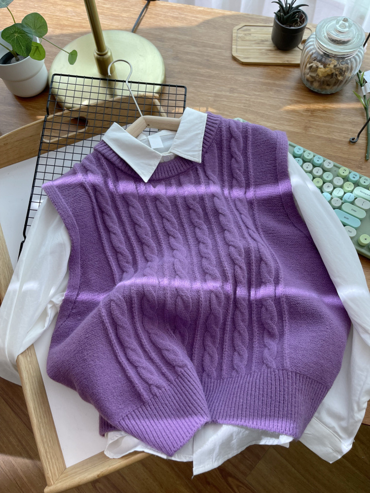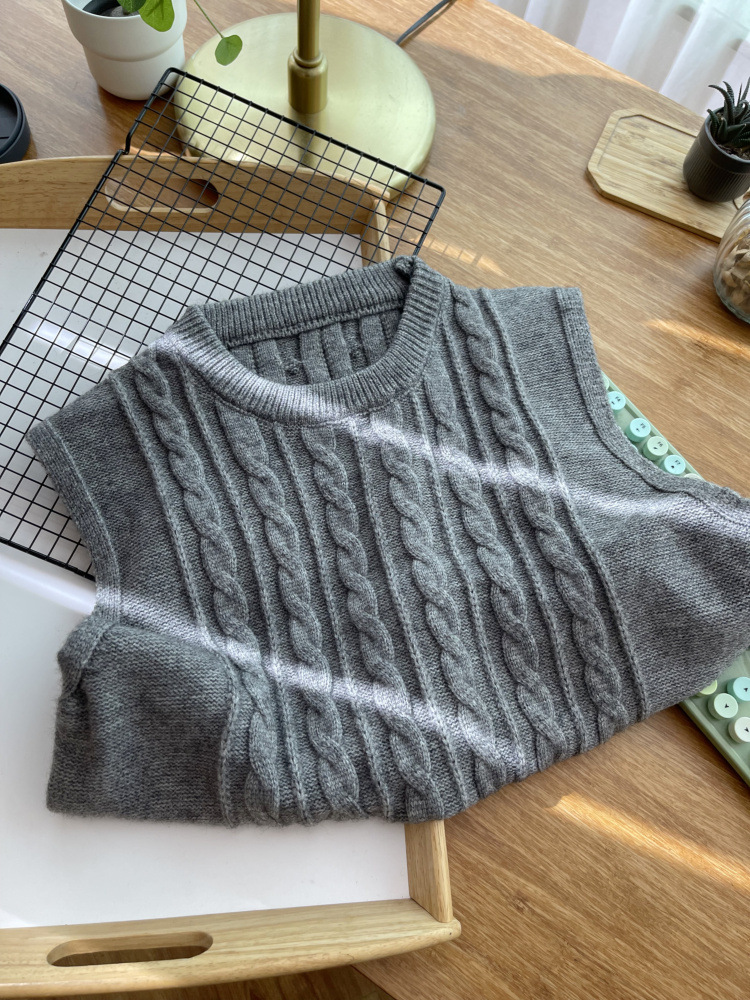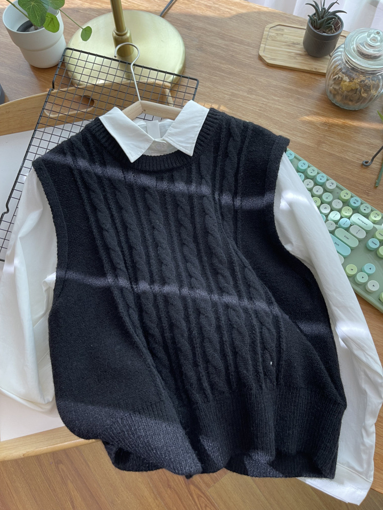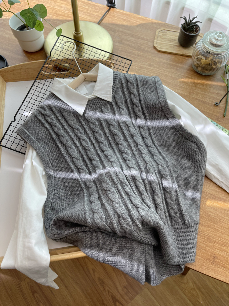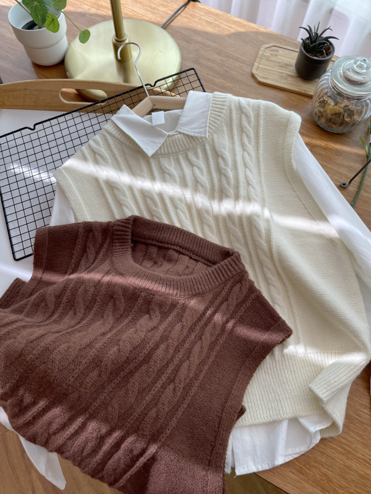 OOTD 가을 새로운 한국 스타일 레트로 게으른 스타일 단색 트위스트 라운드 넥 풀오버 민소매 니트 조끼 여성용스토어 가기