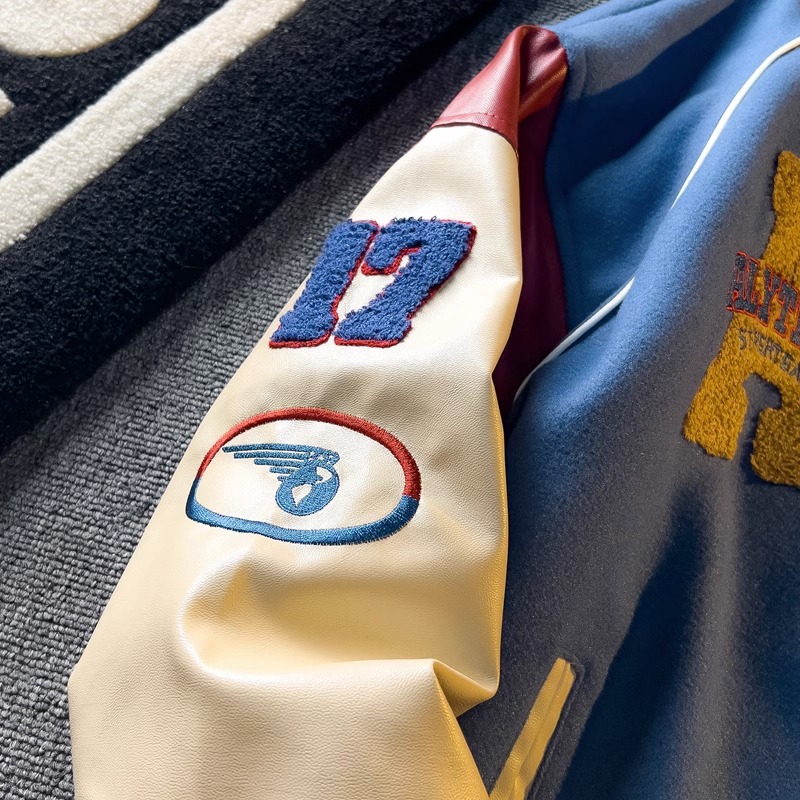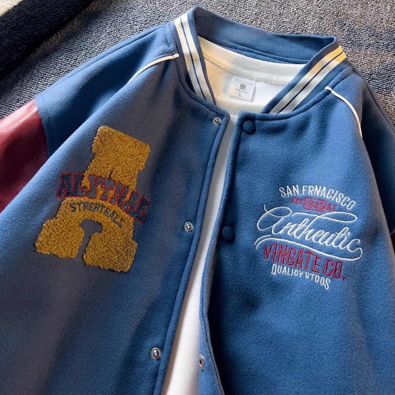 봄과 가을 대비 색상 미국 스타일 수 놓은 가죽 슬리브 코트 남자의 한국 스타일 유행 야구 세트 가을 캐주얼 학생 재킷스토어 가기