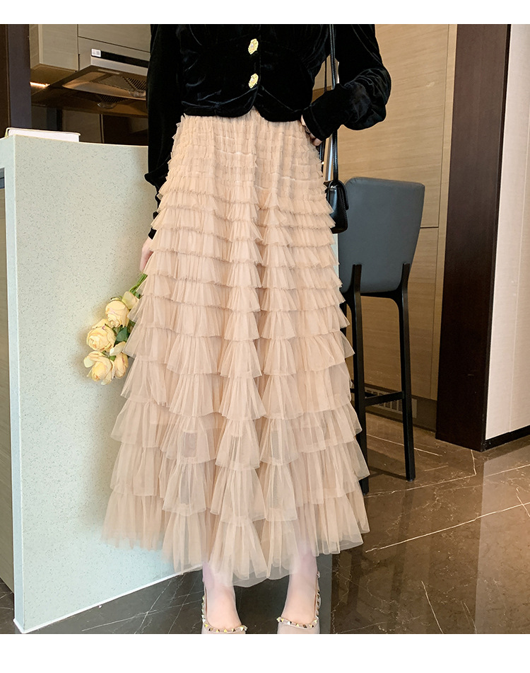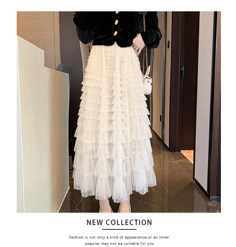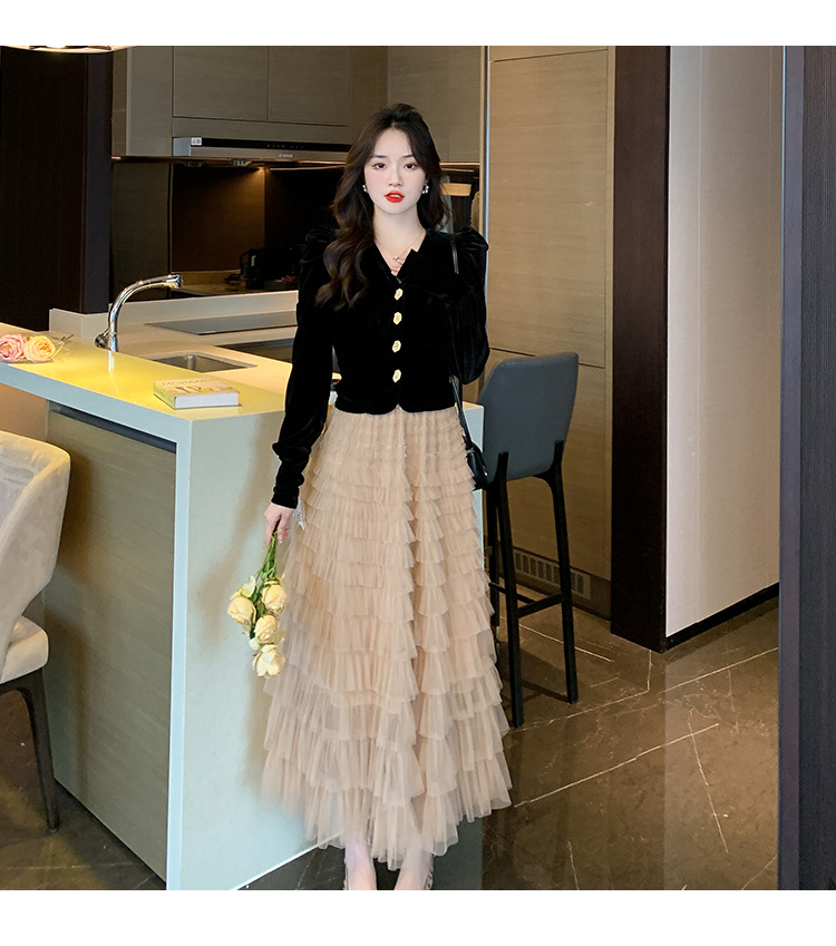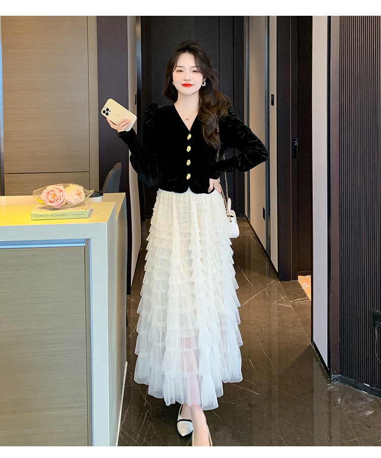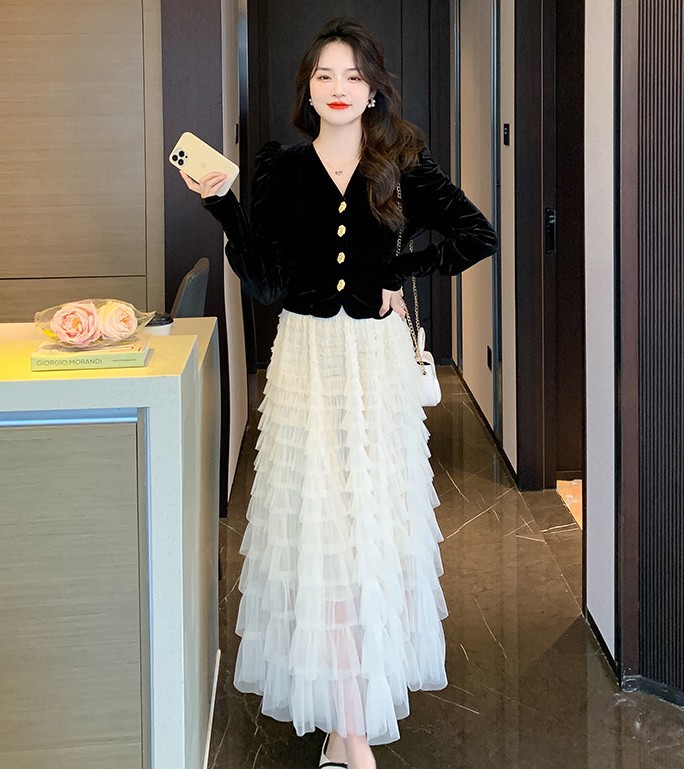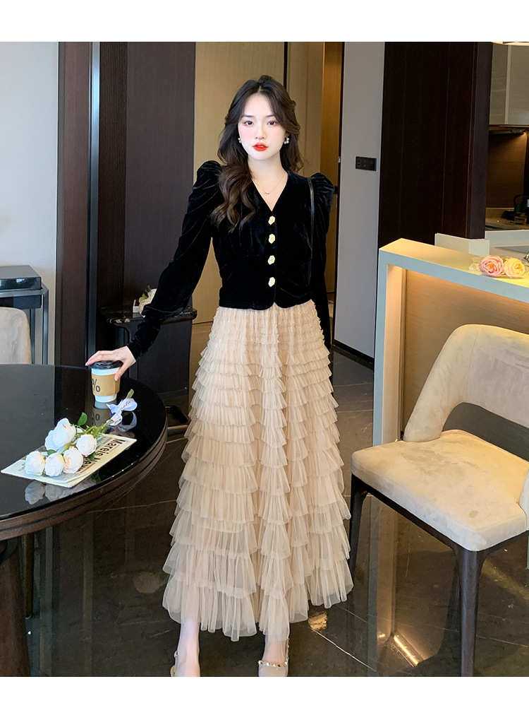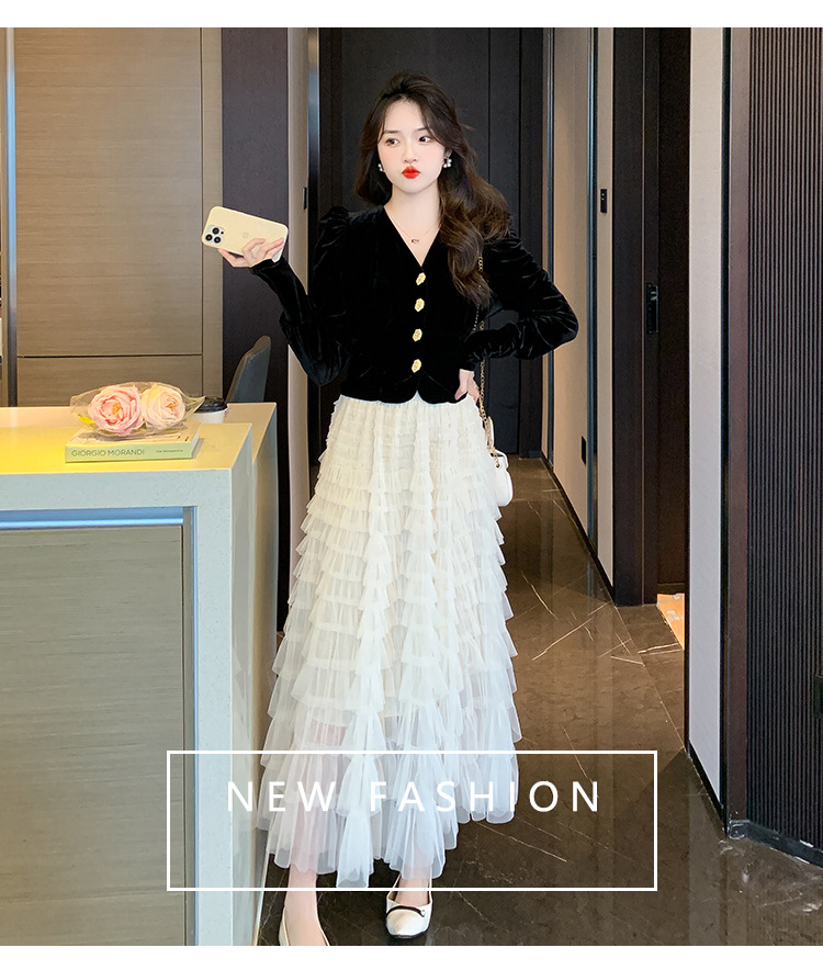 프랑스 V-넥 벨벳 탑 Melaleuca 스커트 투피스 세트 여성의 가을과 겨울 달콤한 쿨 스타일 메쉬 케이크 롱 스커트 세트