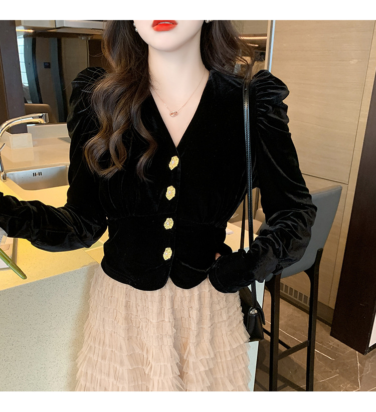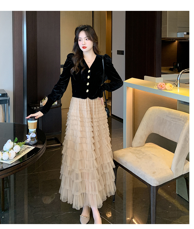 프랑스 V-넥 벨벳 탑 Melaleuca 스커트 투피스 세트 여성의 가을과 겨울 달콤한 쿨 스타일 메쉬 케이크 롱 스커트 세트스토어 가기