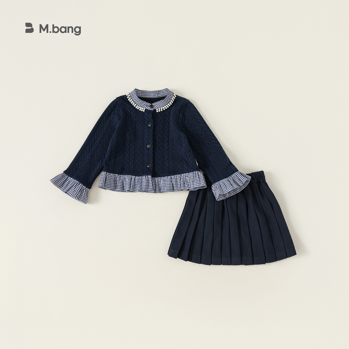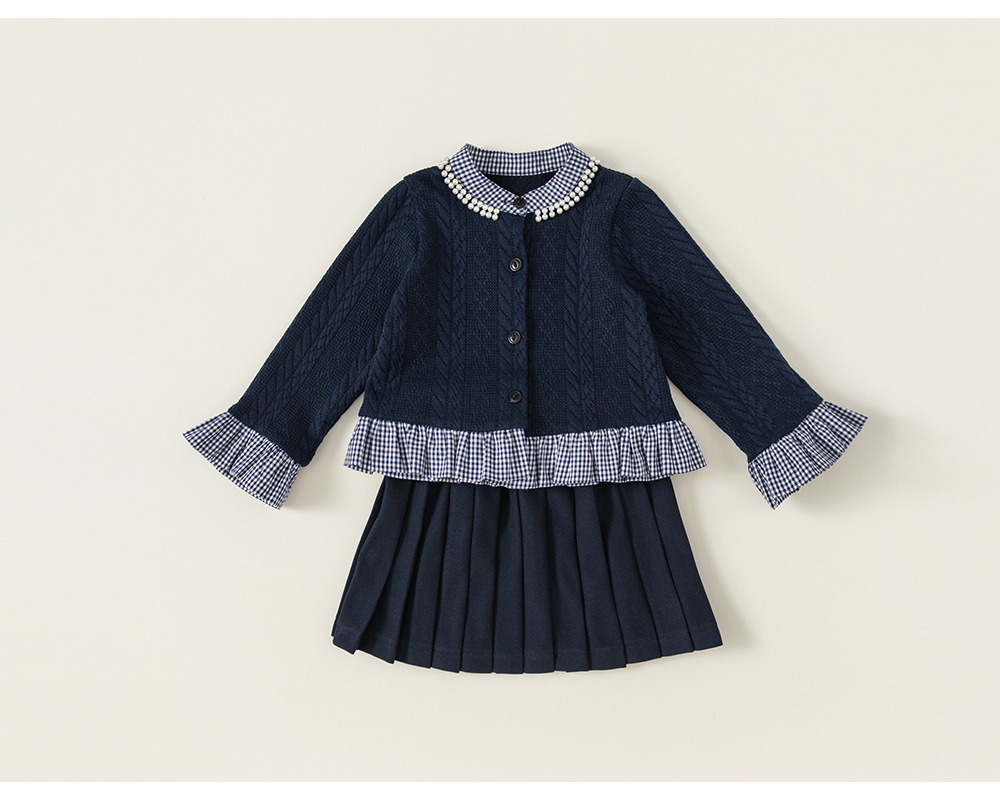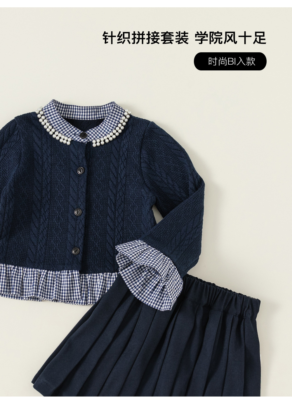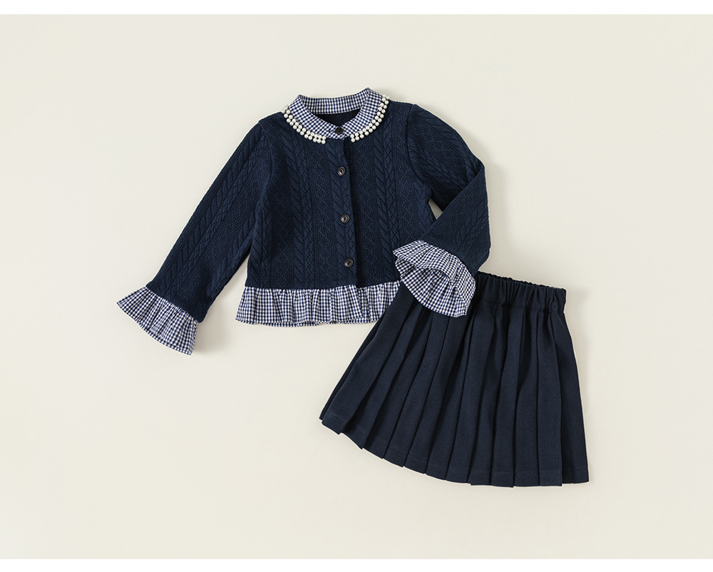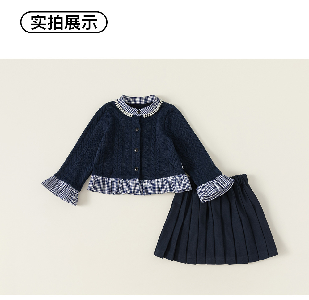 방선택 아동복 봄가을 여아복 세트, 컬리지 스타일 아동 러플 소매 니트 가디건 플리츠 스커트 투피스 세트