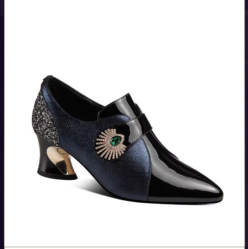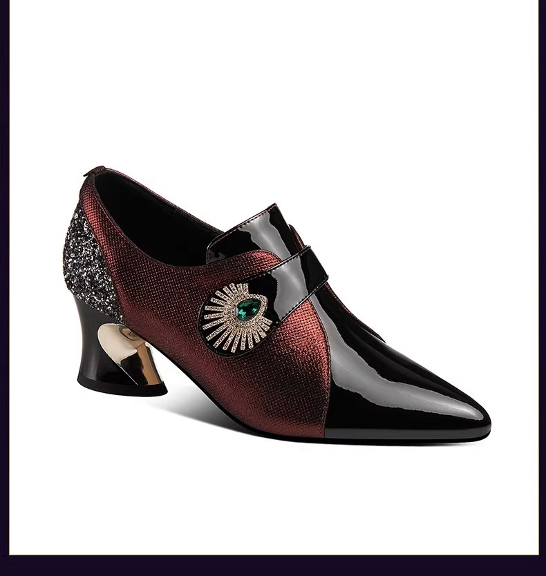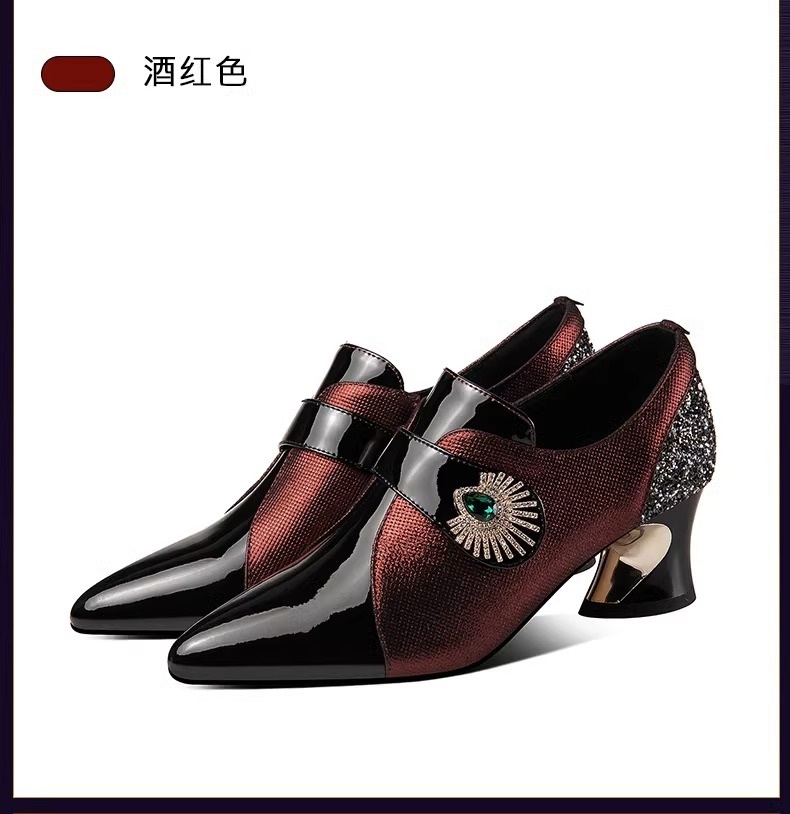 새로운 봄과 가을 라인 석 부드러운 가죽 미들 힐 깊은 입 싱글 레이어 신발 여성용 두꺼운 힐 컬러 매칭 뾰족한 발가락 여성용 가죽 신발 사이드 지퍼 어머니 신발