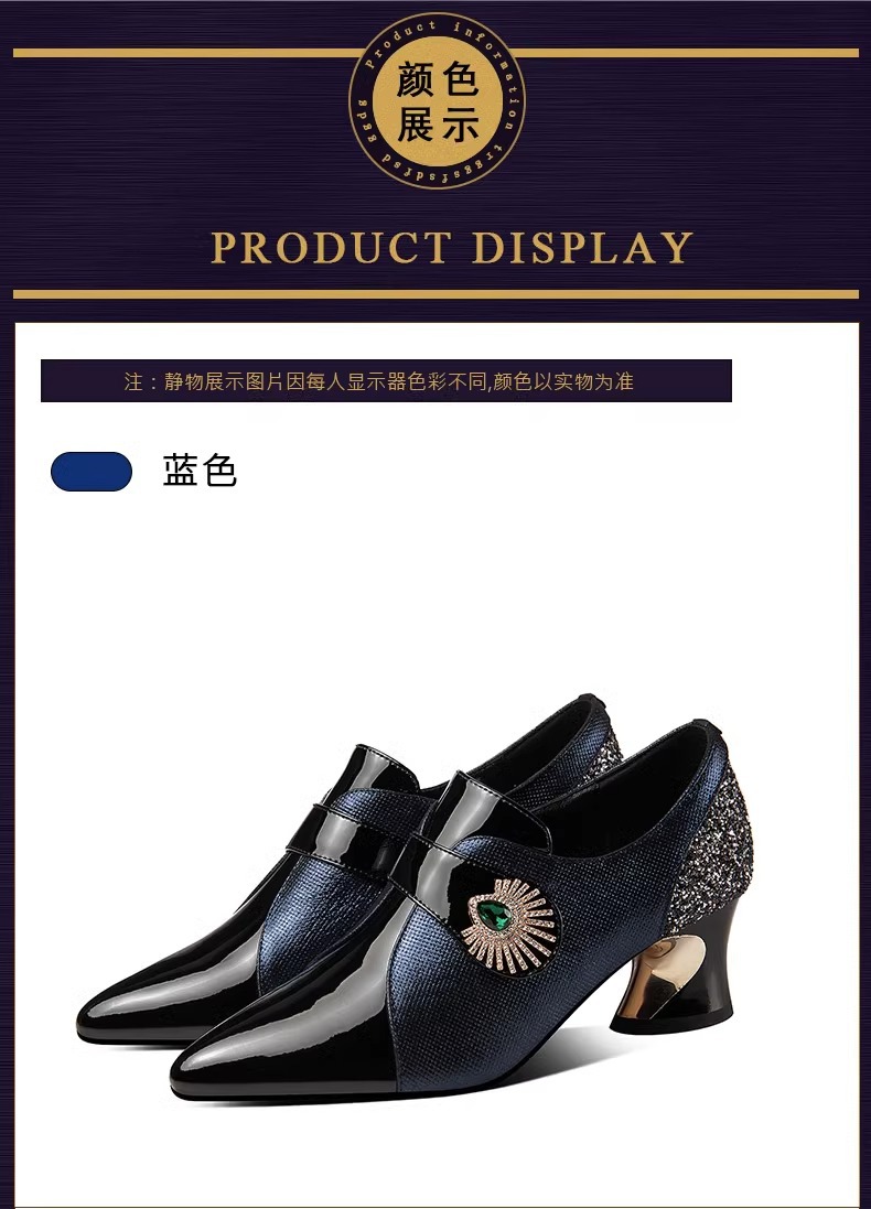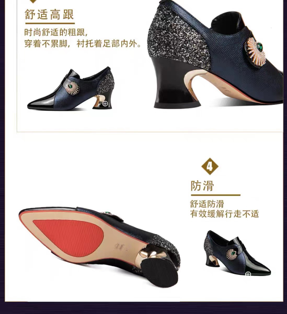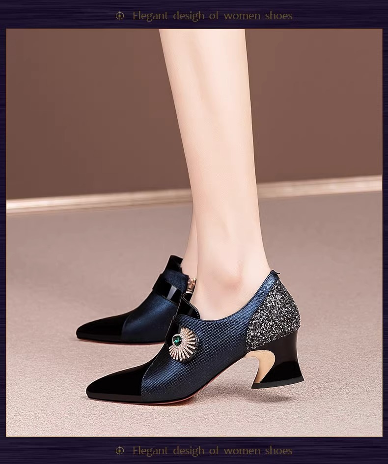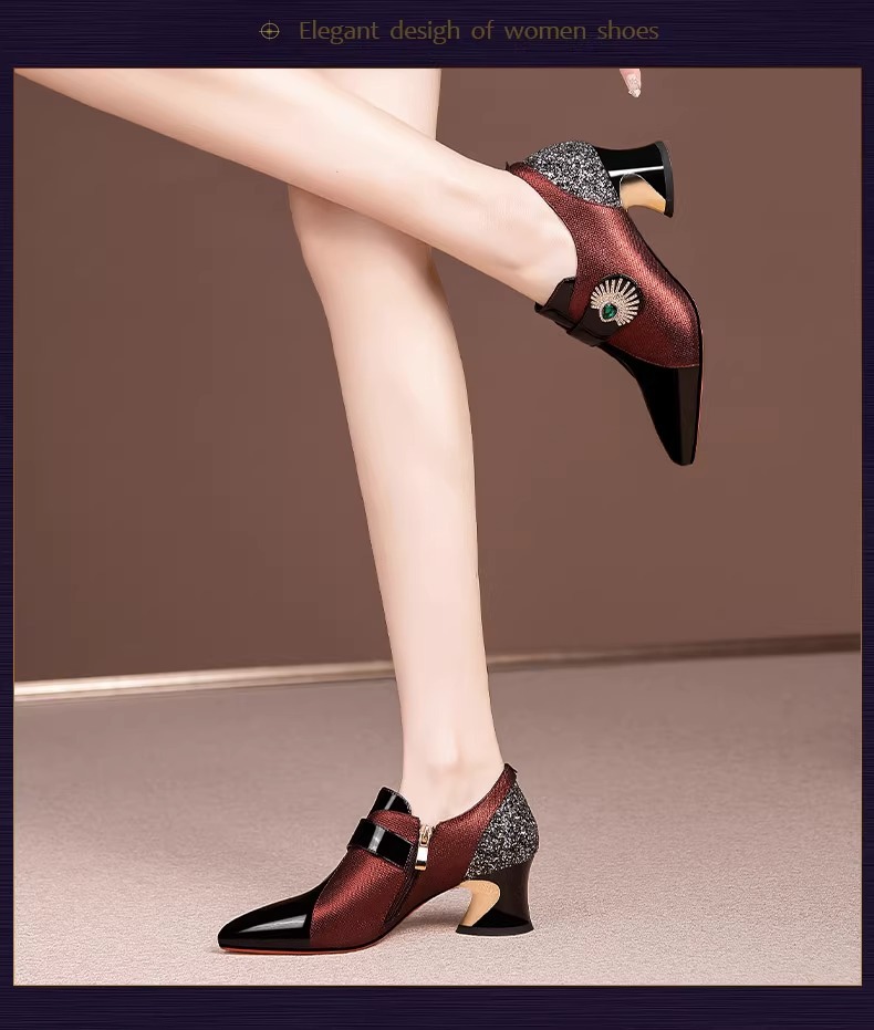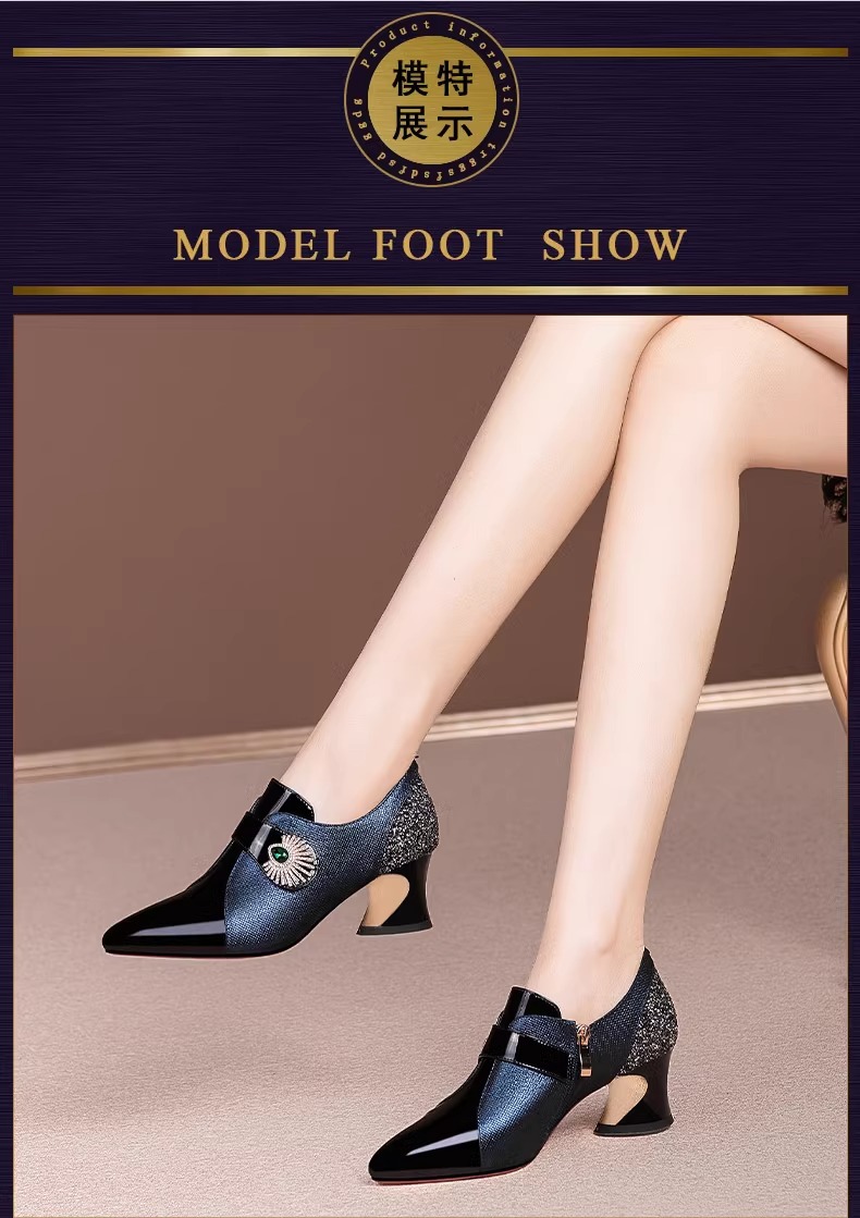 새로운 봄과 가을 라인 석 부드러운 가죽 미들 힐 깊은 입 싱글 레이어 신발 여성용 두꺼운 힐 컬러 매칭 뾰족한 발가락 여성용 가죽 신발 사이드 지퍼 어머니 신발스토어 가기