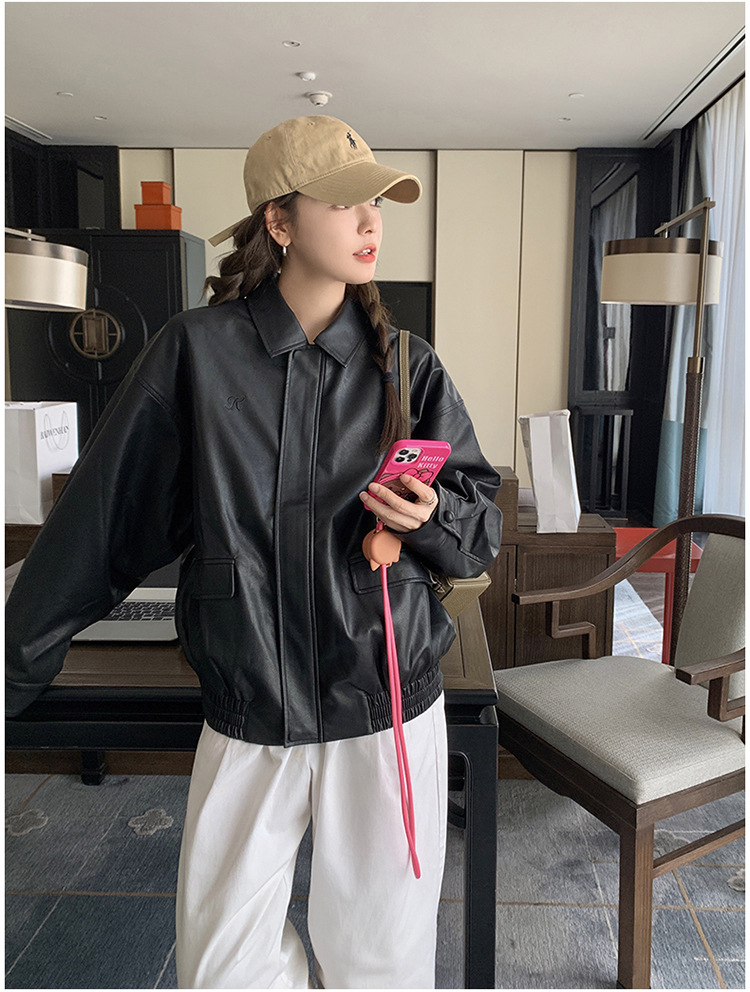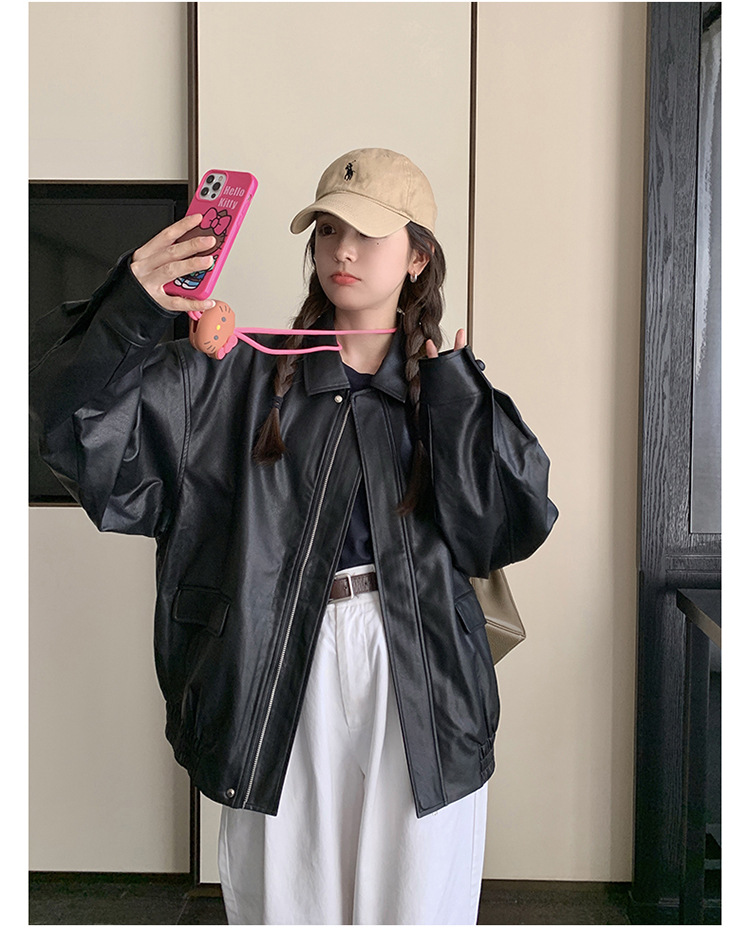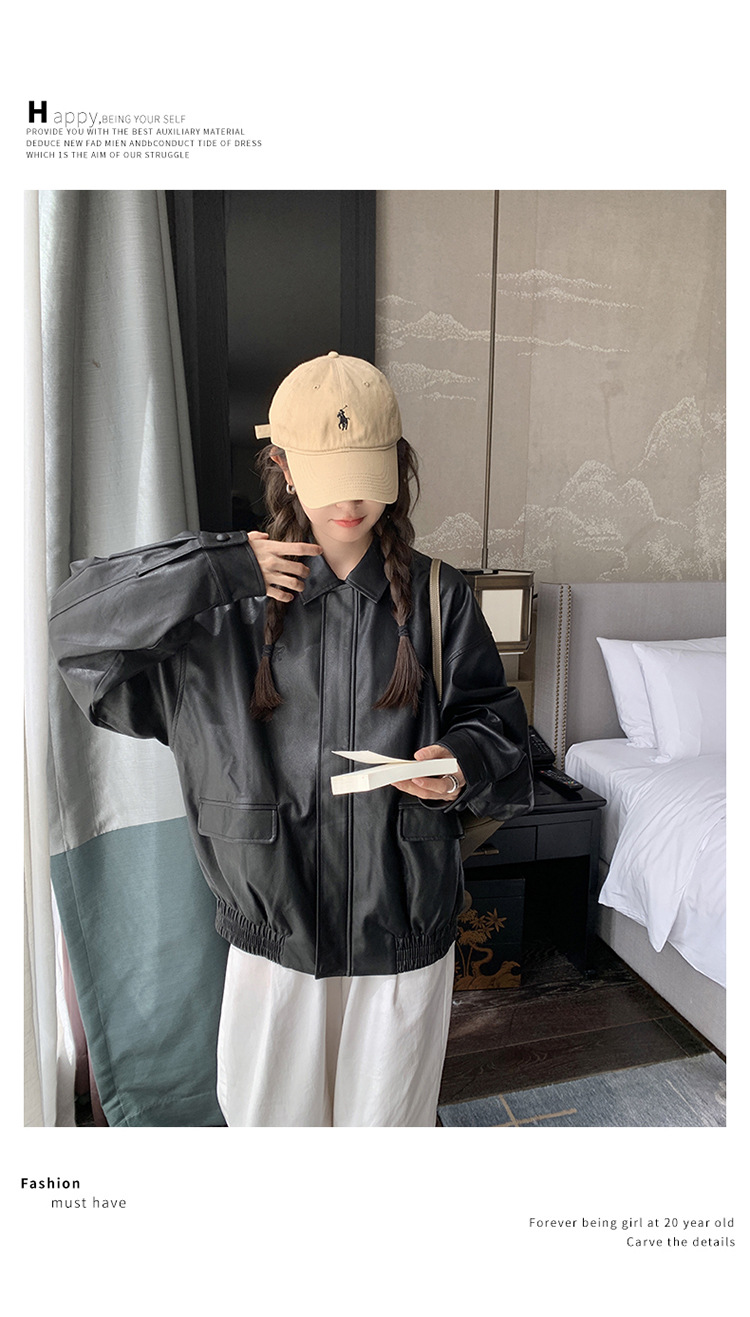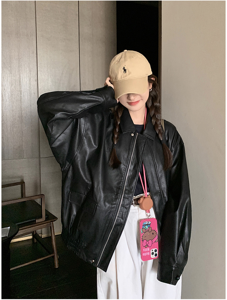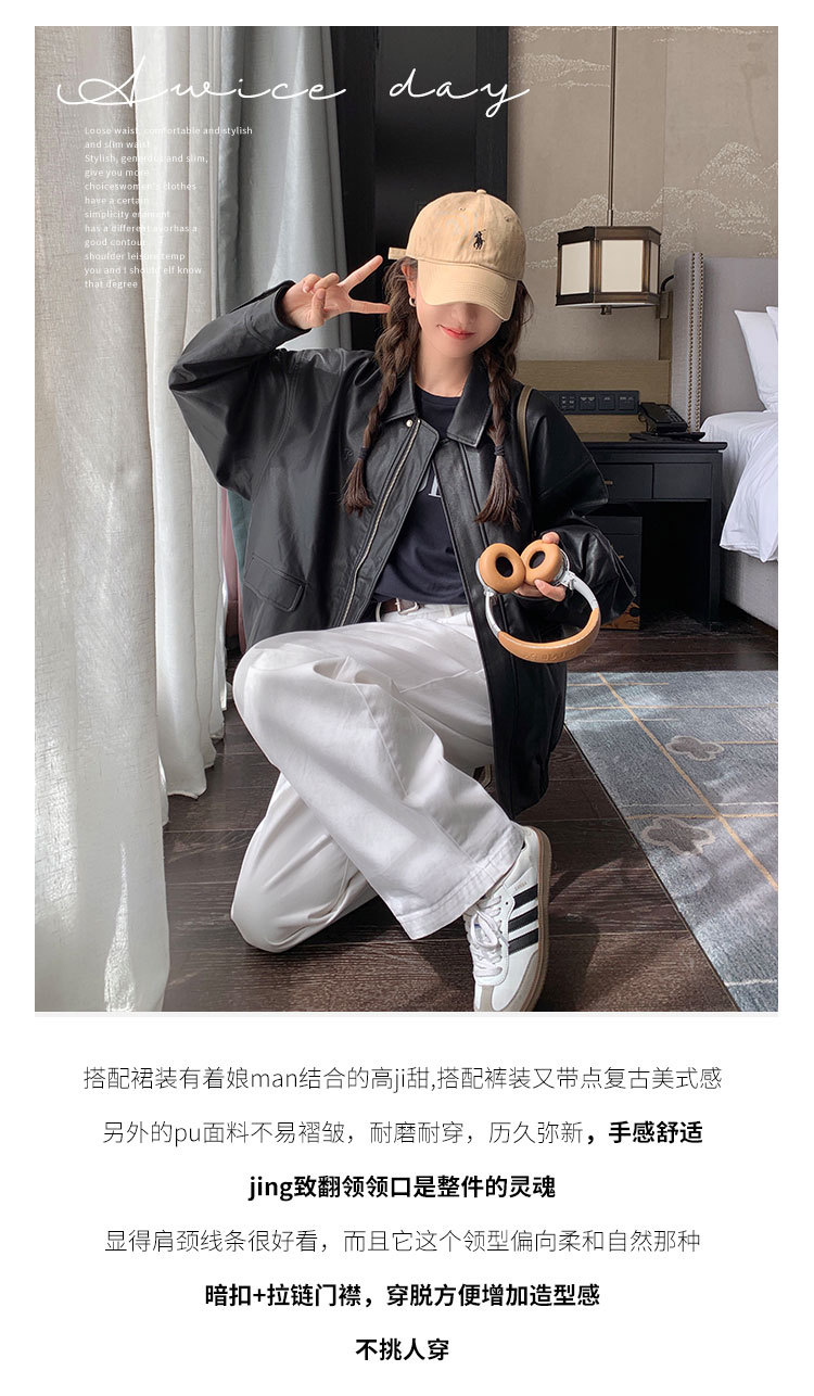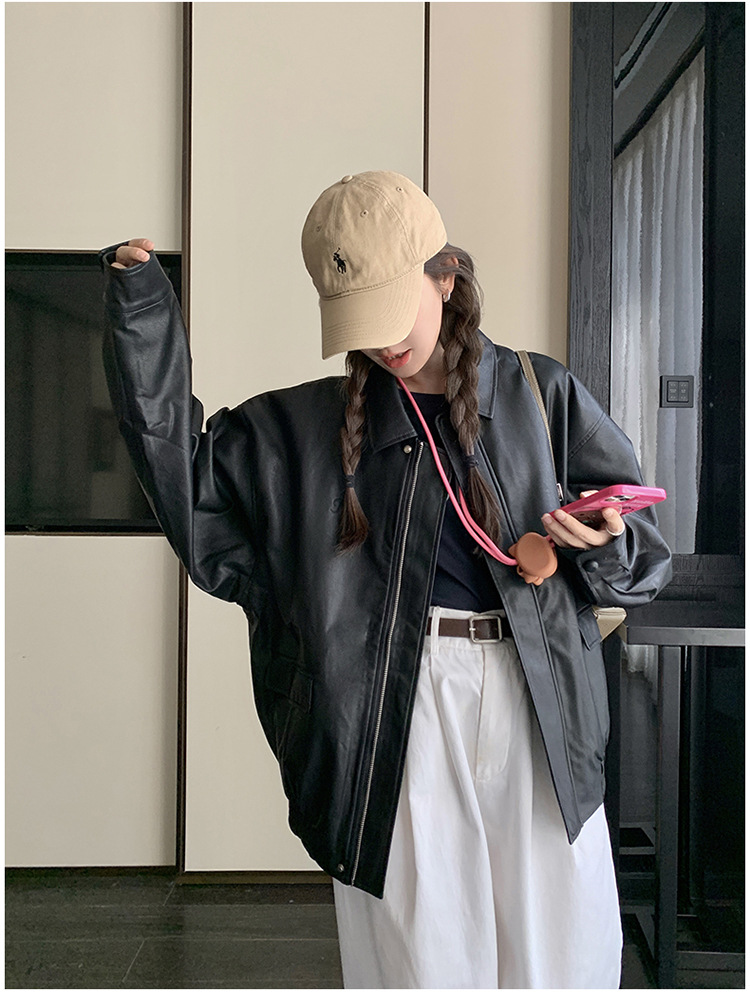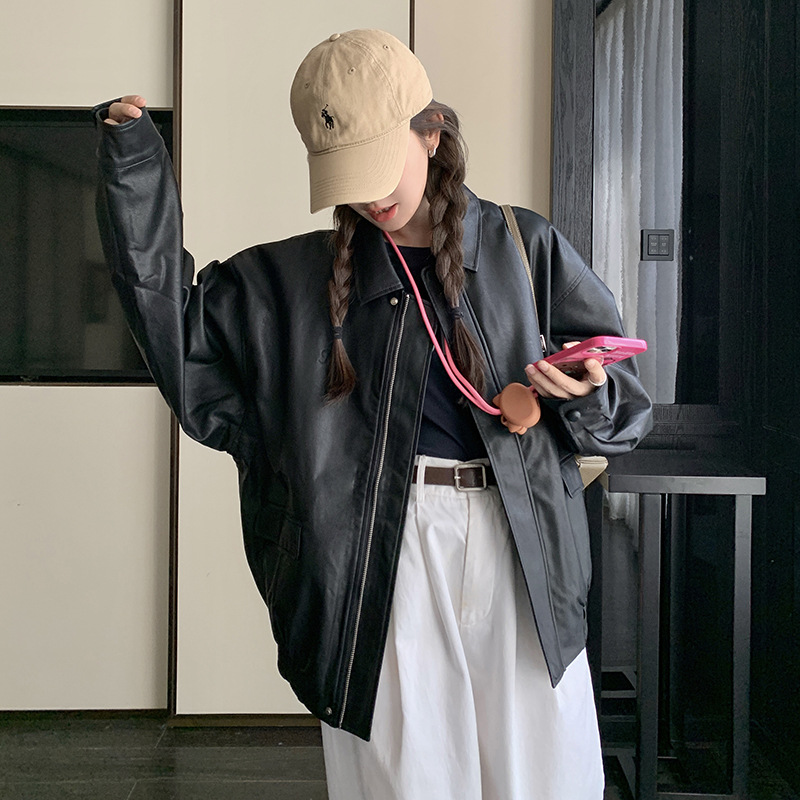 아메리칸 스타일 레트로 스위트 쿨 홍콩 스타일 느슨한 캐주얼 PU 가죽 오토바이 재킷 여성용 2023 봄과 가을 쁘띠 가죽 자켓스토어 가기