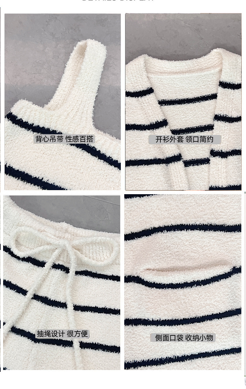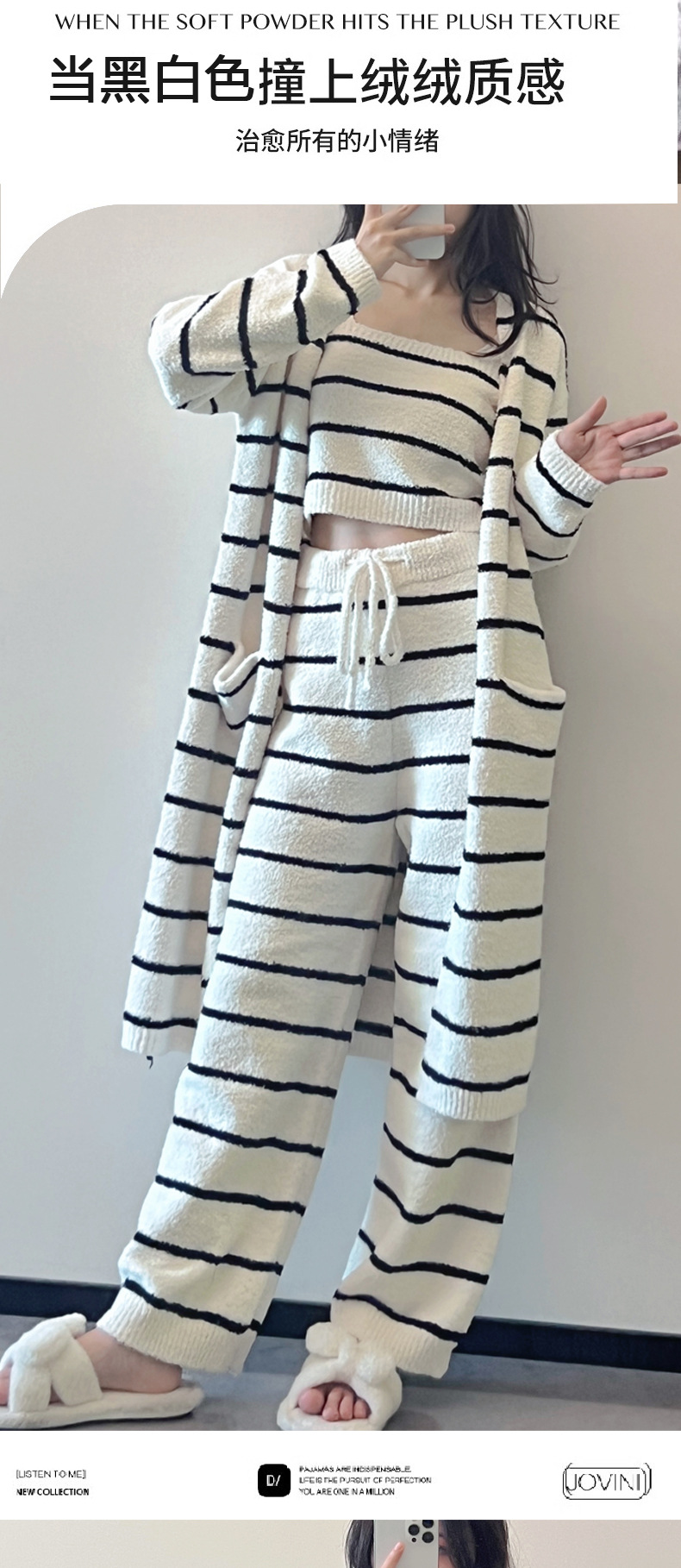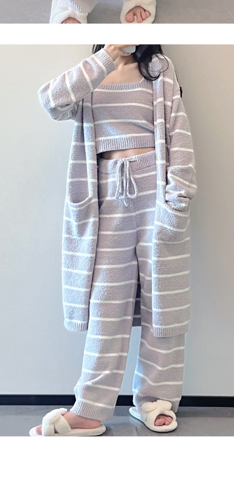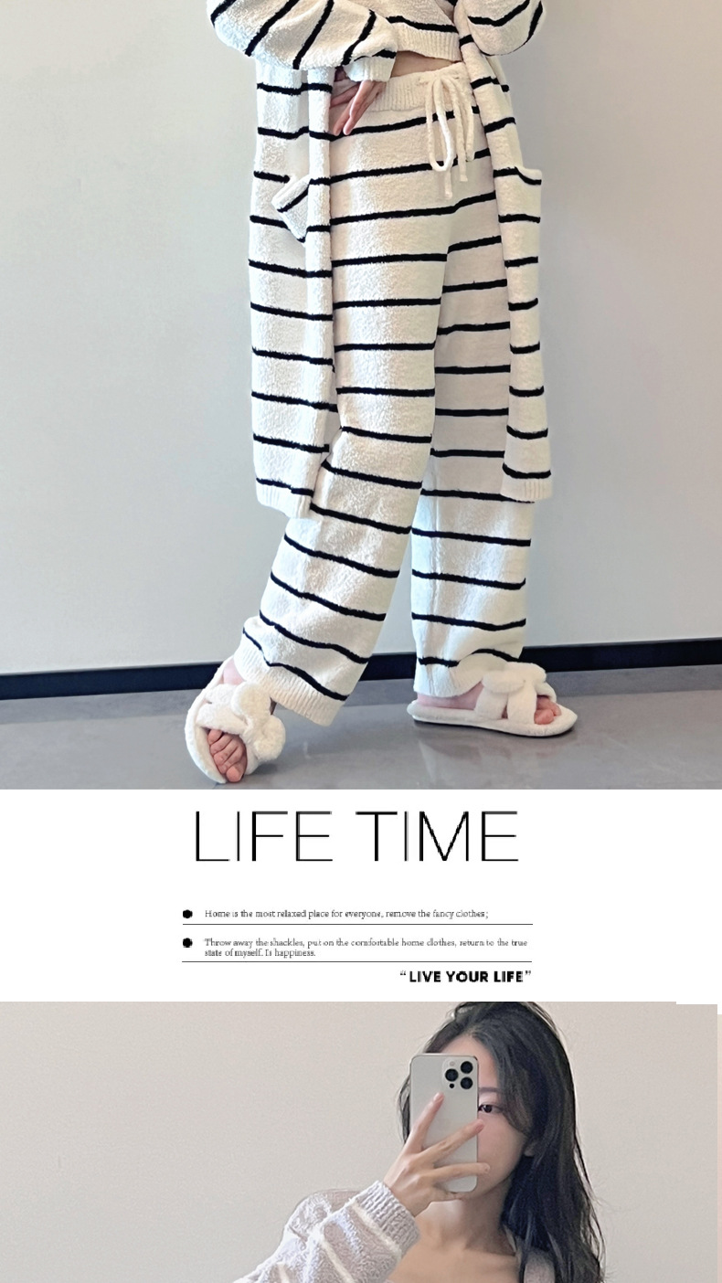 스트라이프 하프 벨벳 잠옷 여성 월간 의류 3 종 세트 따뜻한 두꺼운 카디건 부드러운 겨울 의류 가정 의류스토어 가기