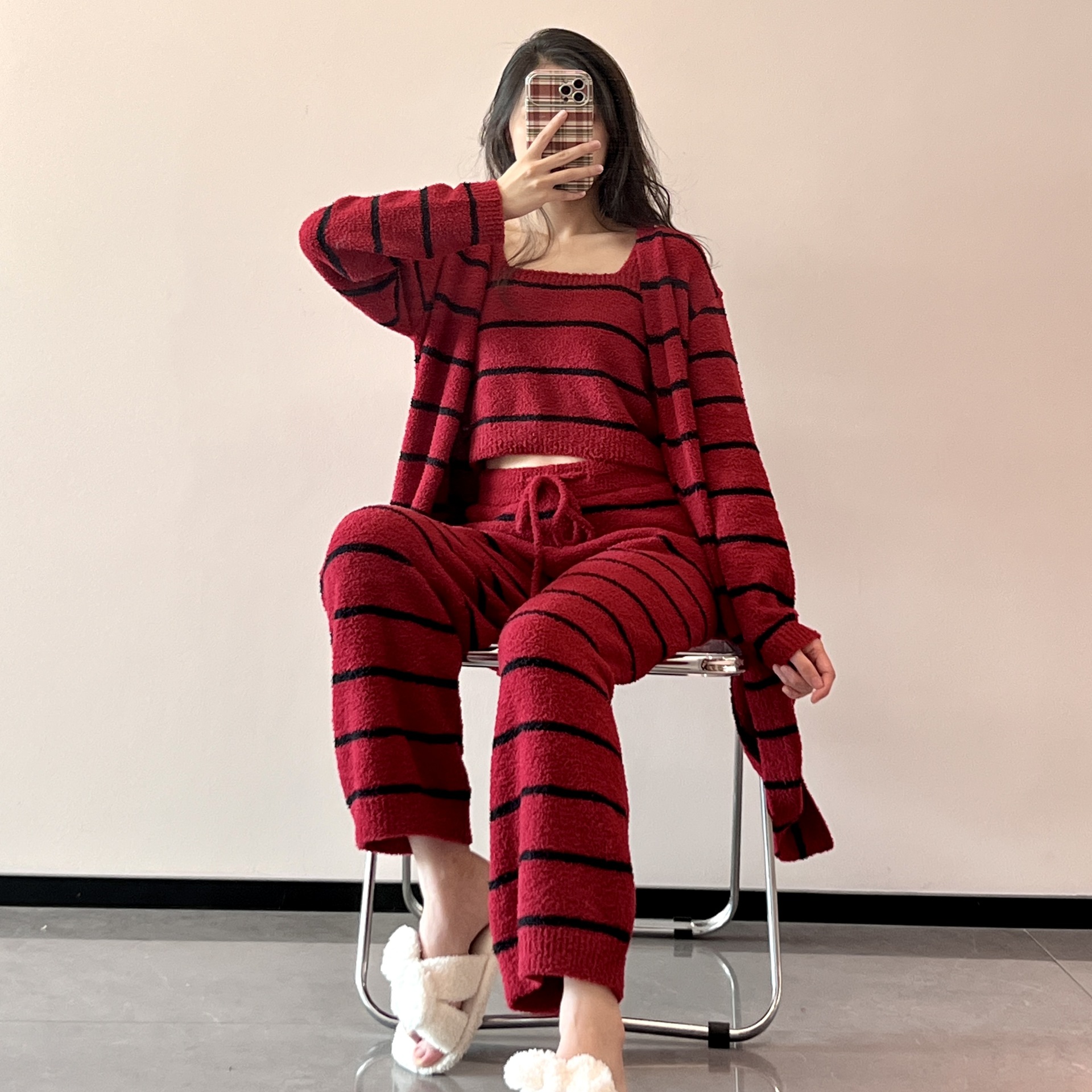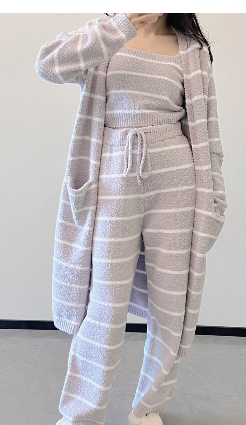 스트라이프 하프 벨벳 잠옷 여성 월간 의류 3 종 세트 따뜻한 두꺼운 카디건 부드러운 겨울 의류 가정 의류