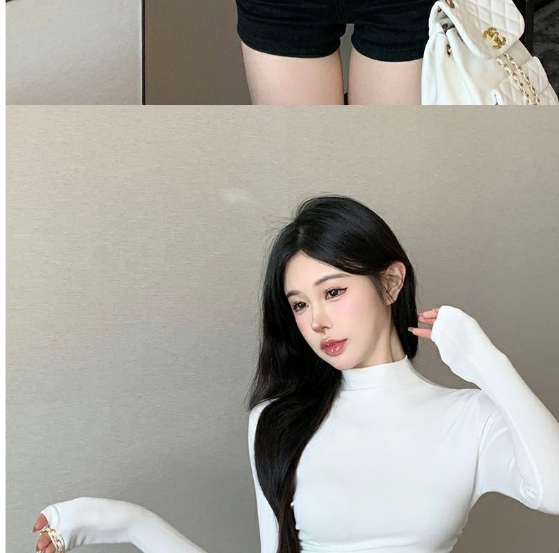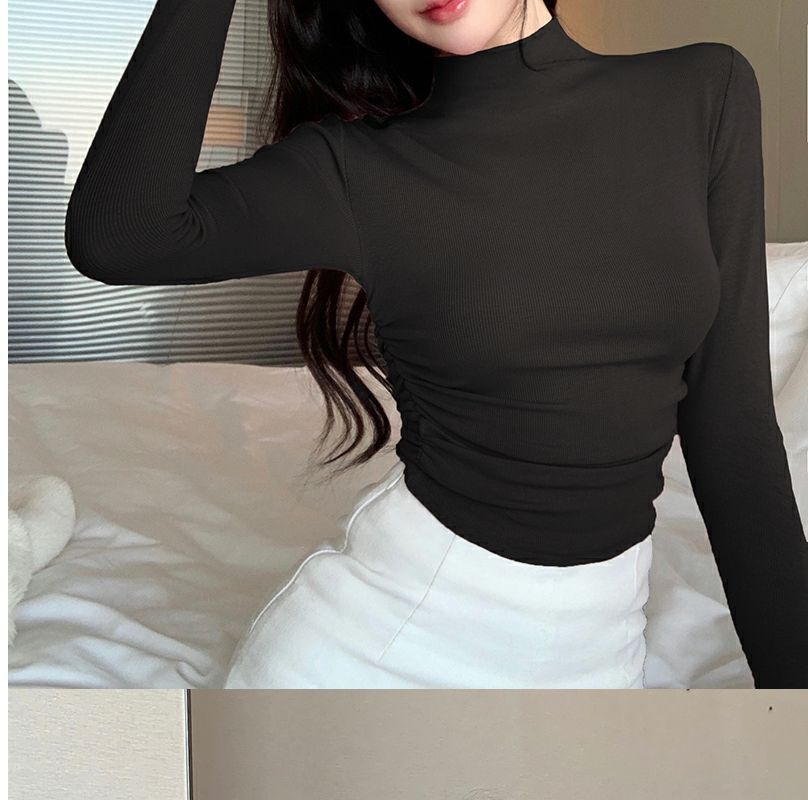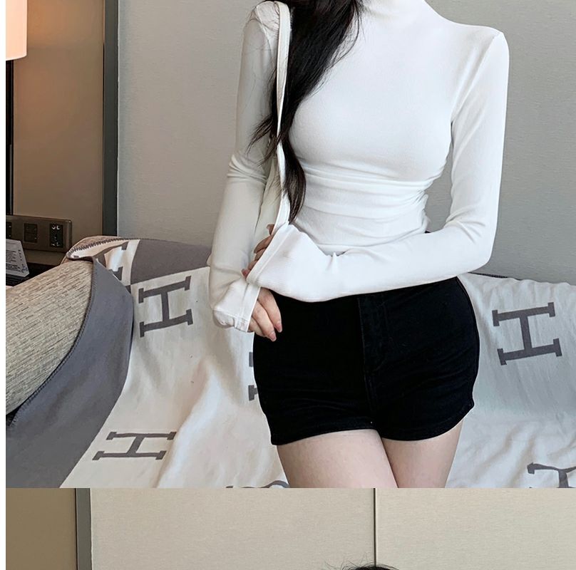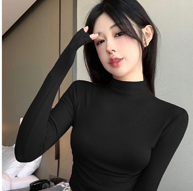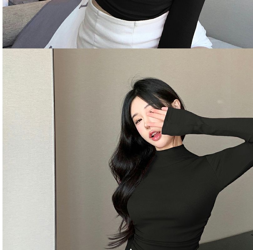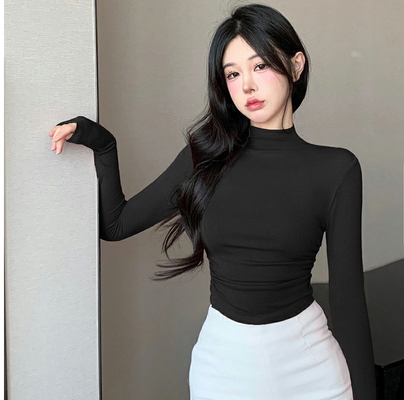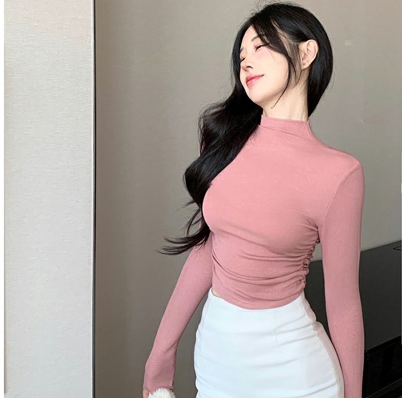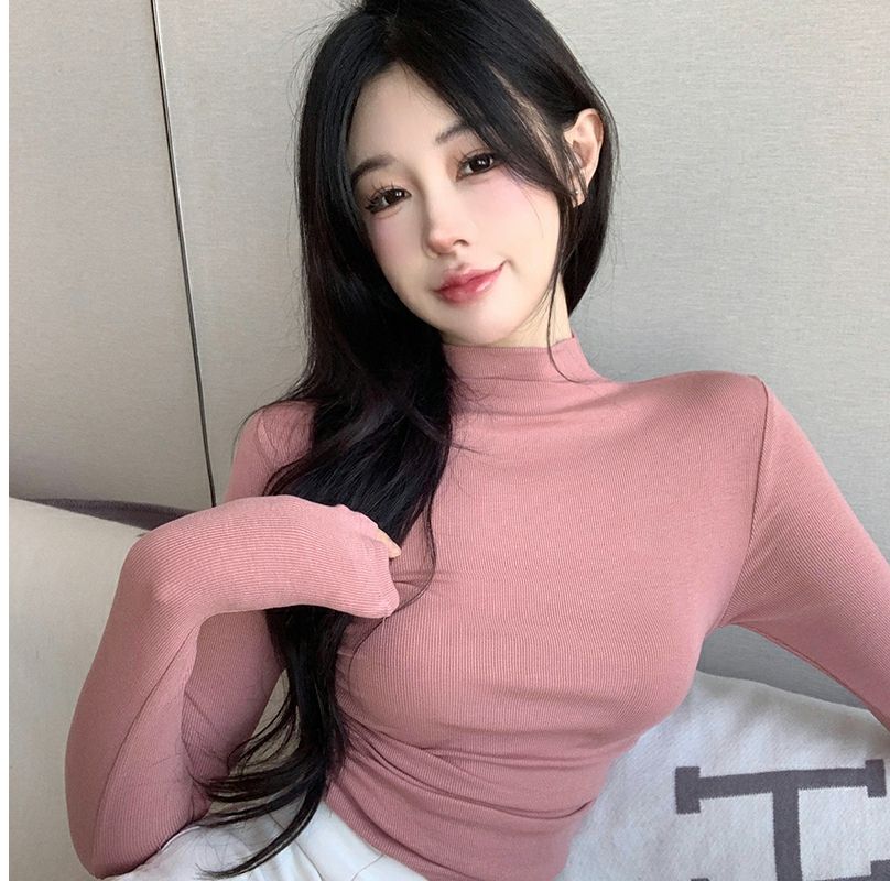 여성용 하프 터틀넥 셔츠, 봄 스타일, 타이트하고 슬림한 오른쪽 어깨 긴팔 티셔츠, 짧은 스타일, 핫걸 탑스토어 가기