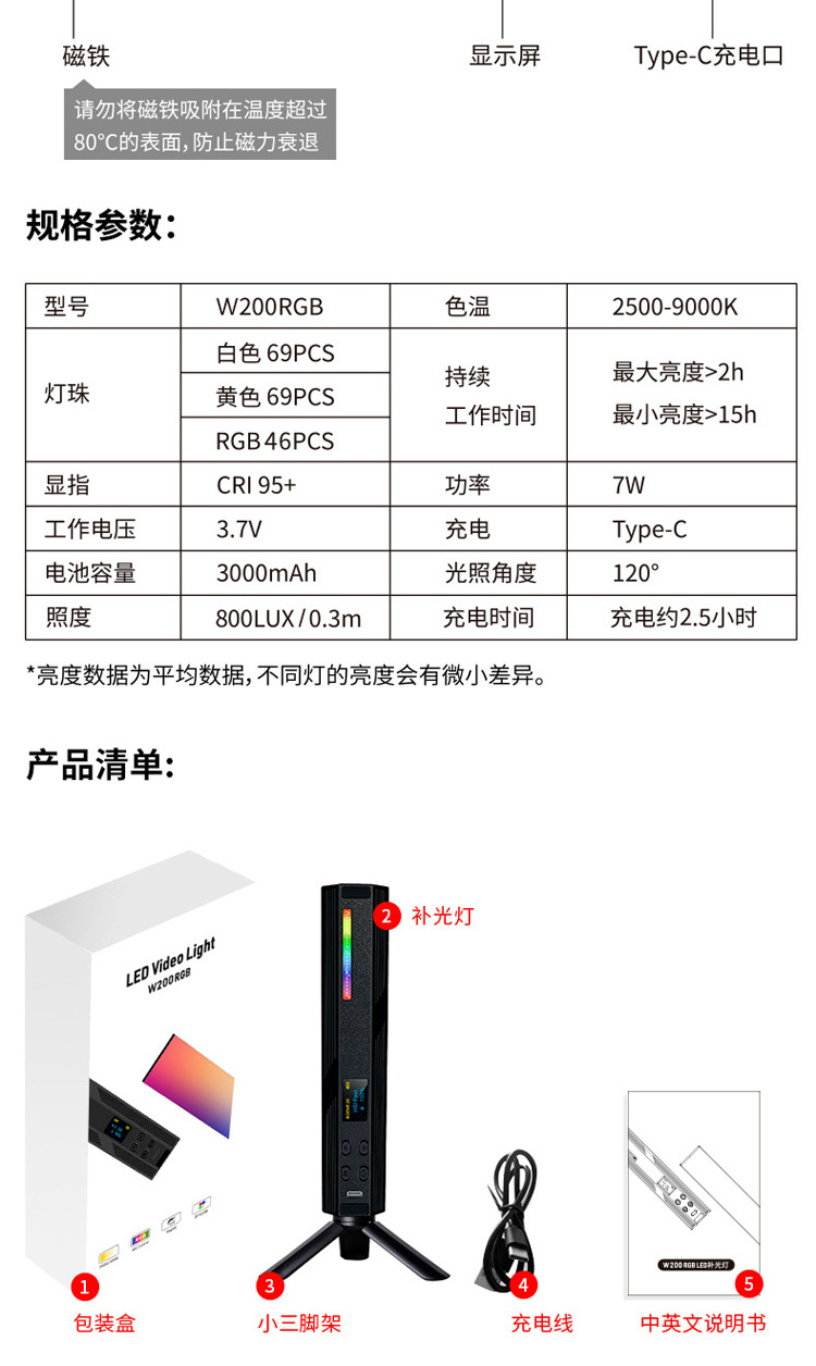 풀 컬러 핸드 헬드 라이트 보충 W200RGB 라이브 사진 LED 분위기등 야외 휴대용 마그네틱 라이트 보충 라이트