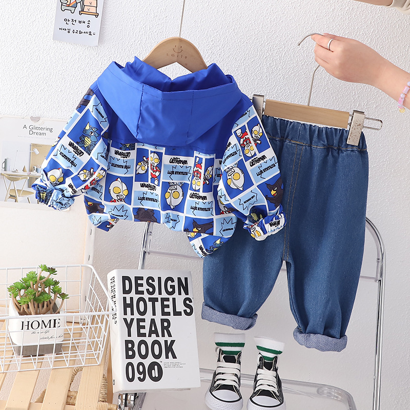 소년 세트 신상품 잘 생긴 유행 긴팔 후드 재킷 청바지 투피스 세트 아기 가을 아동복스토어 가기