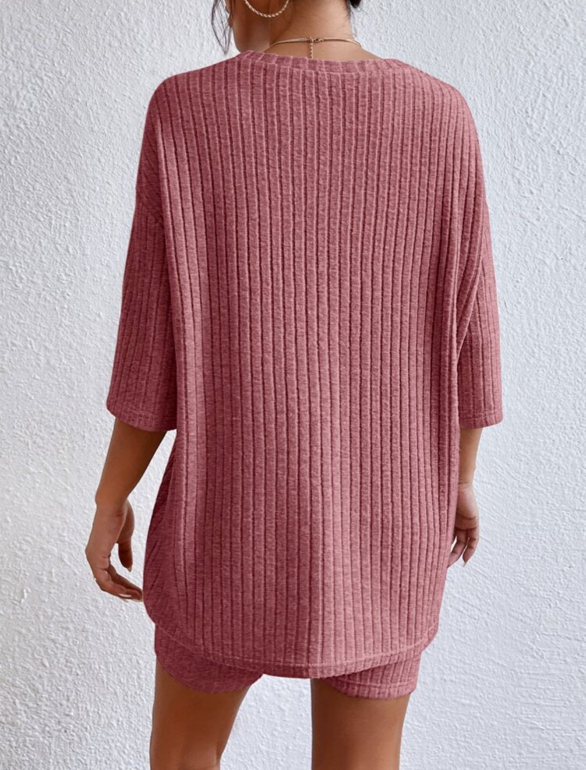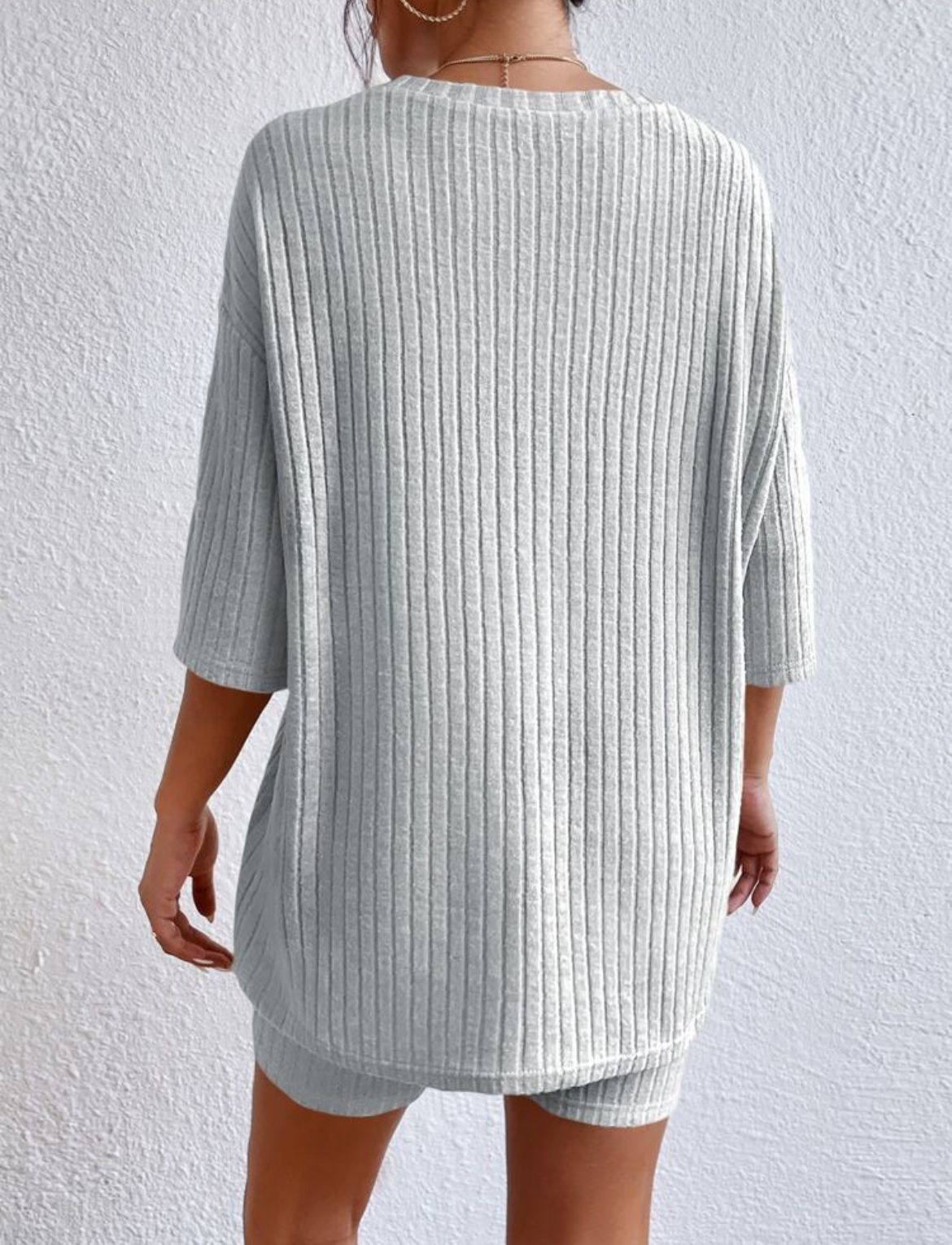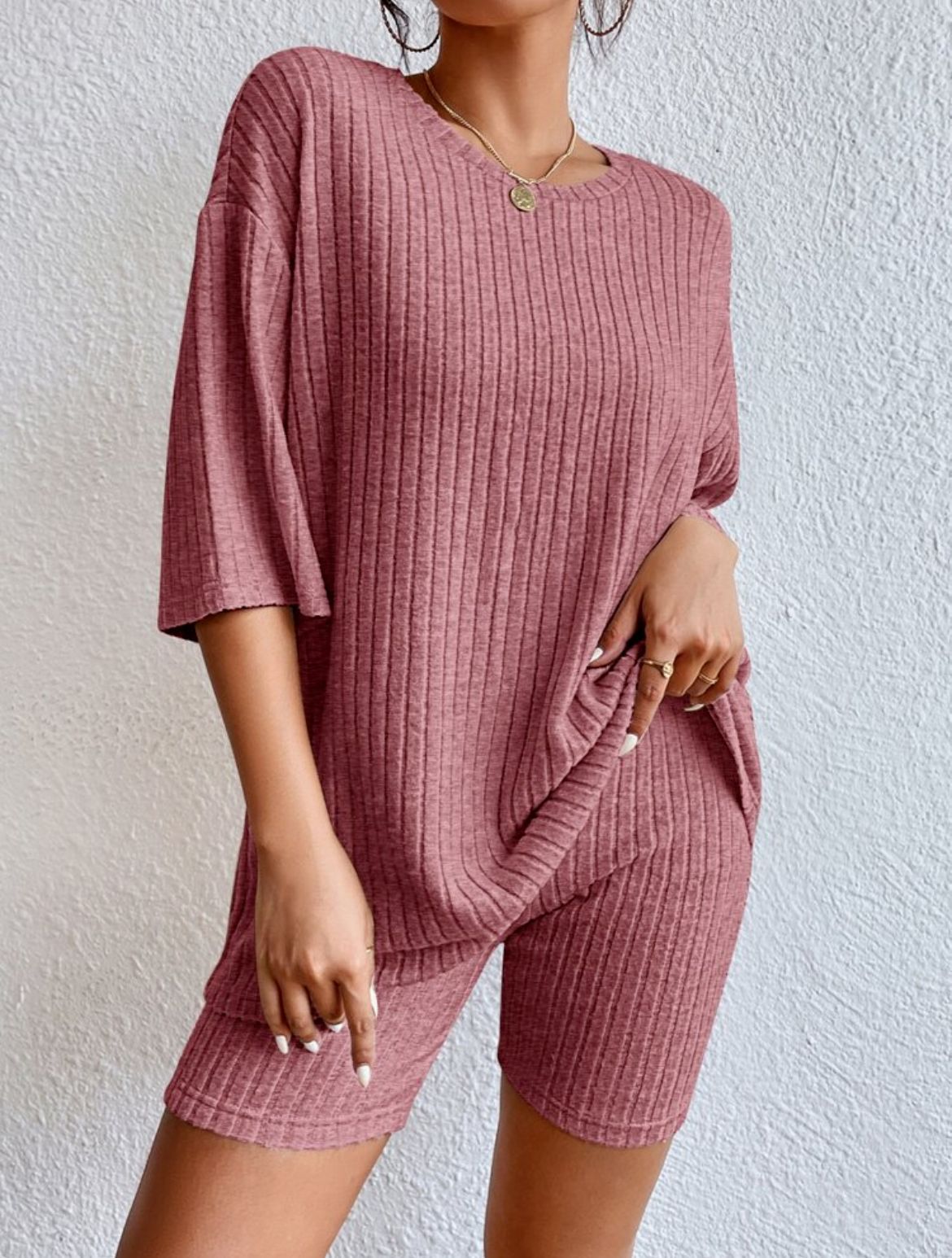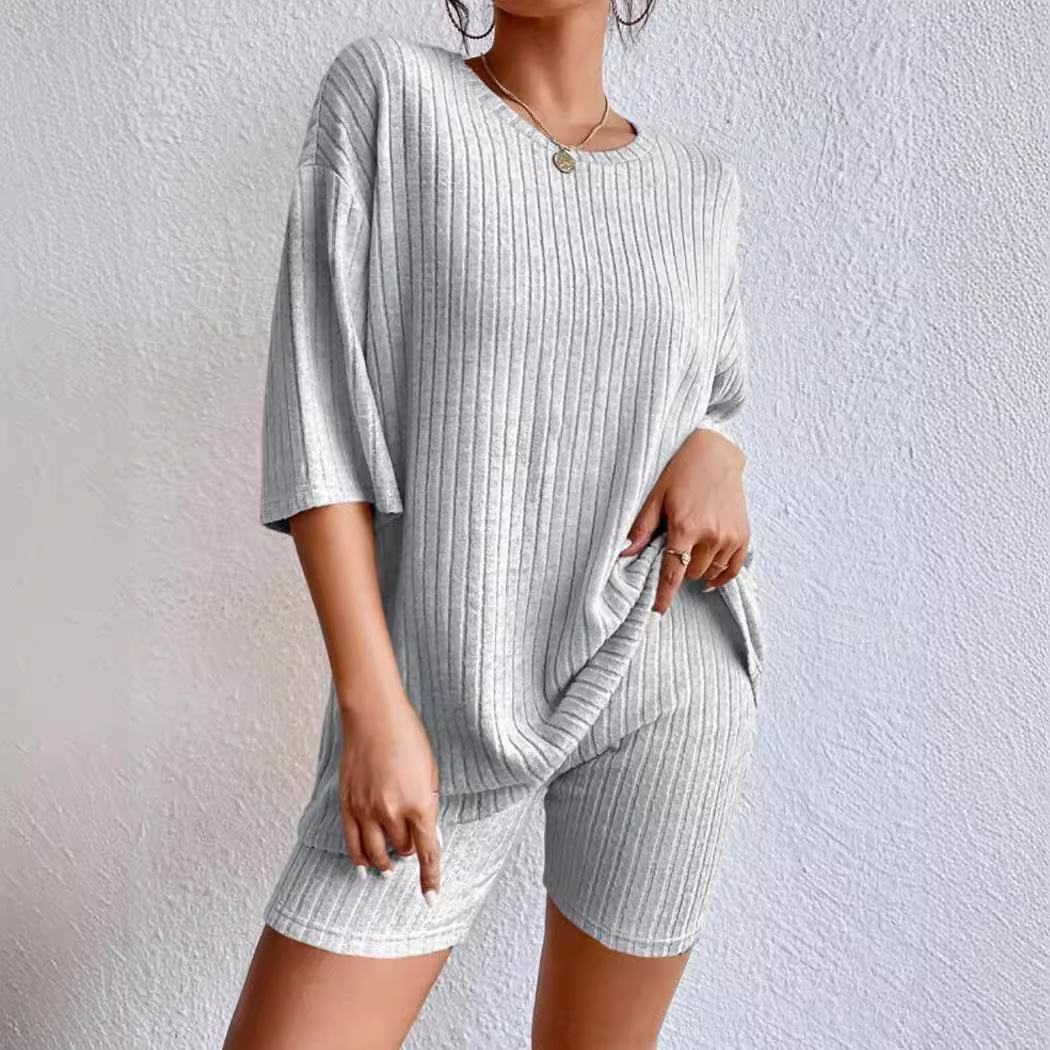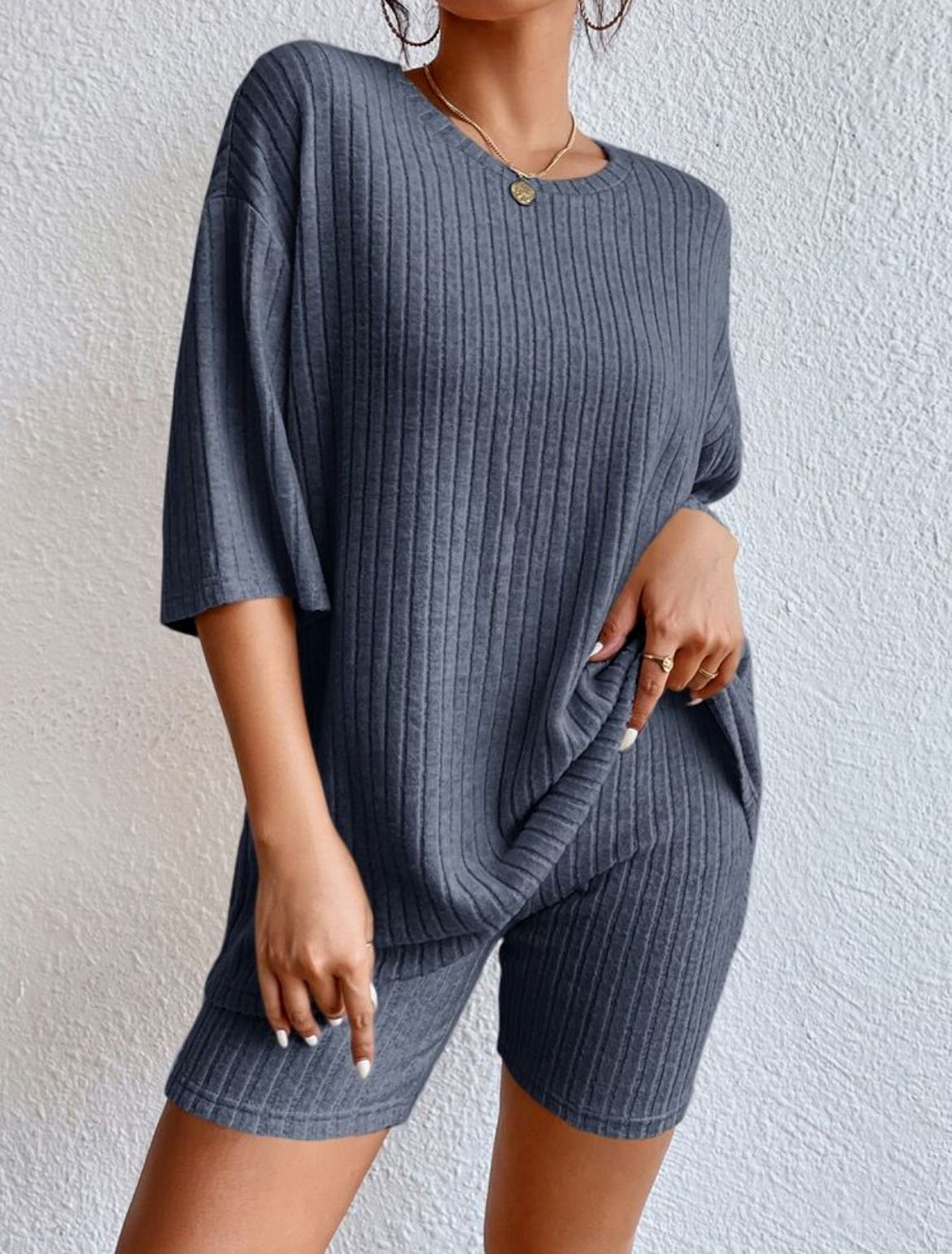 유럽과 미국의 새로운 2023 패션 캐주얼 단색 봄 둥근 목 느슨한 여성 반바지 세트