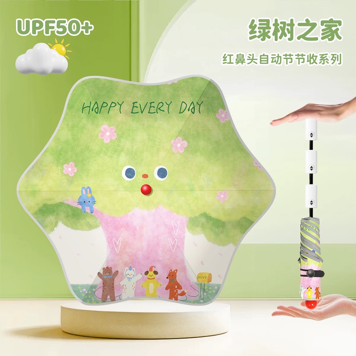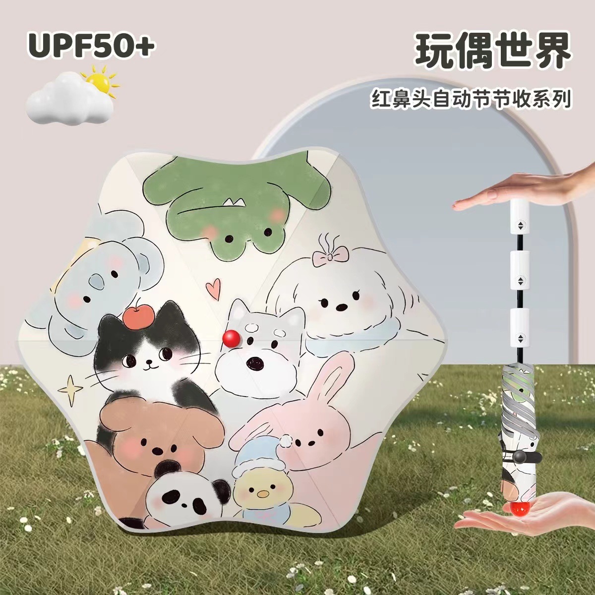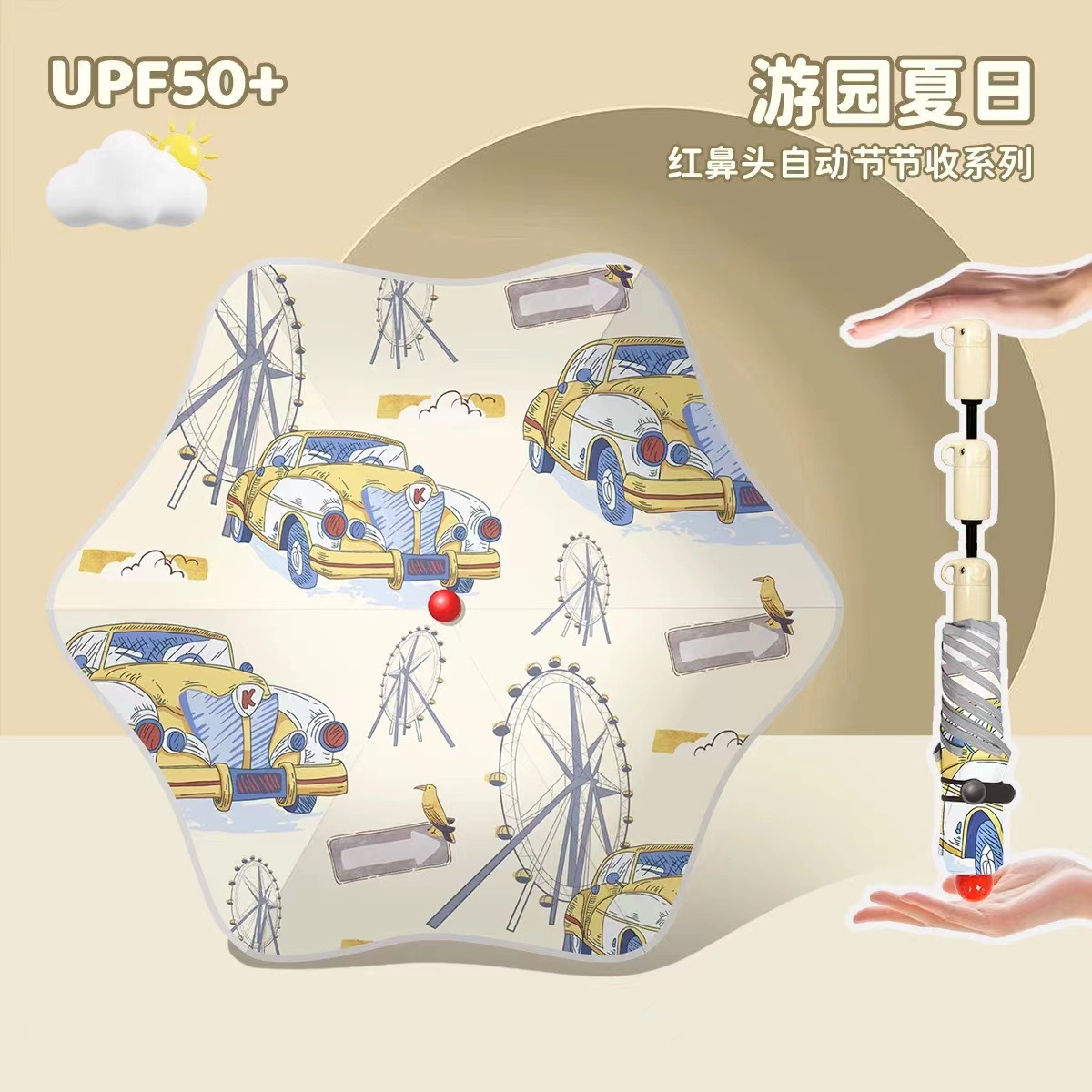 • 우산 가방을 들고 여름 정원을 여행하세요 - 자동 수납(코끼리 손잡이 + 빨간 코 + 둥근 모서리)