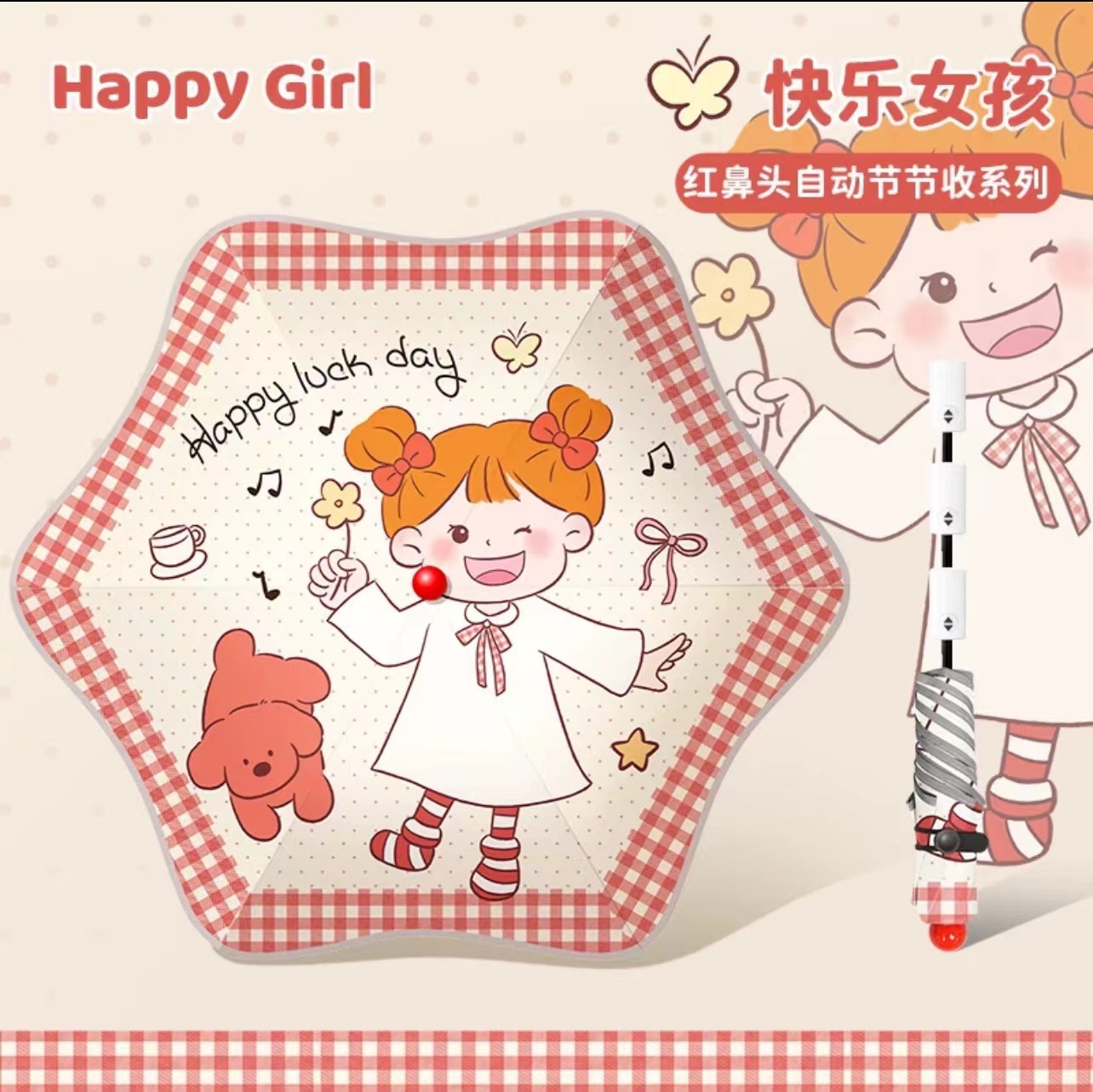 • 우산 가방을 든 행복한 소녀 - 자동으로 접힘(빨간 코 + 반사 스트립 + 둥근 모서리)