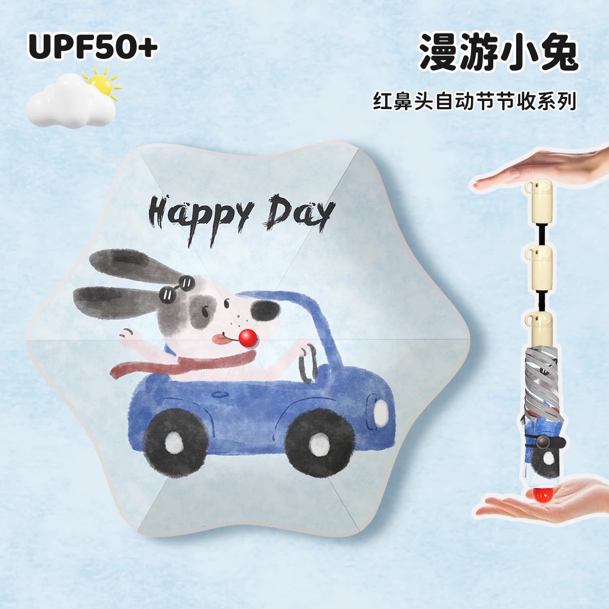 • 우산 가방을 들고 여행하는 토끼 - 자동으로 접힘(코끼리 손잡이 + 빨간 코 + 둥근 모서리)