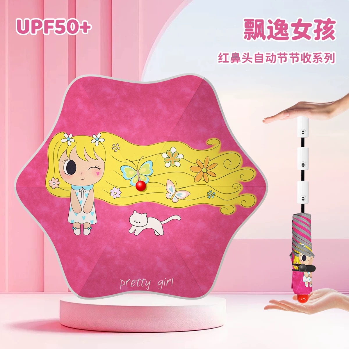 • 우산 가방을 들고 우아한 소녀 - 자동으로 접힘(빨간 코 + 반사 스트립 + 둥근 모서리)