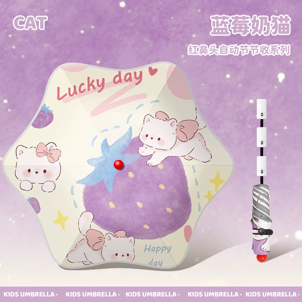 • 우산 가방 블루베리 밀크 고양이 - 자동 수집(빨간 코 + 반사 스트립 + 둥근 모서리)