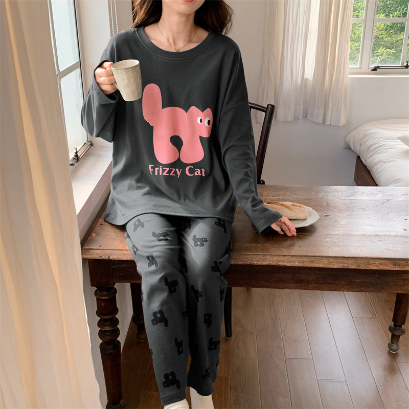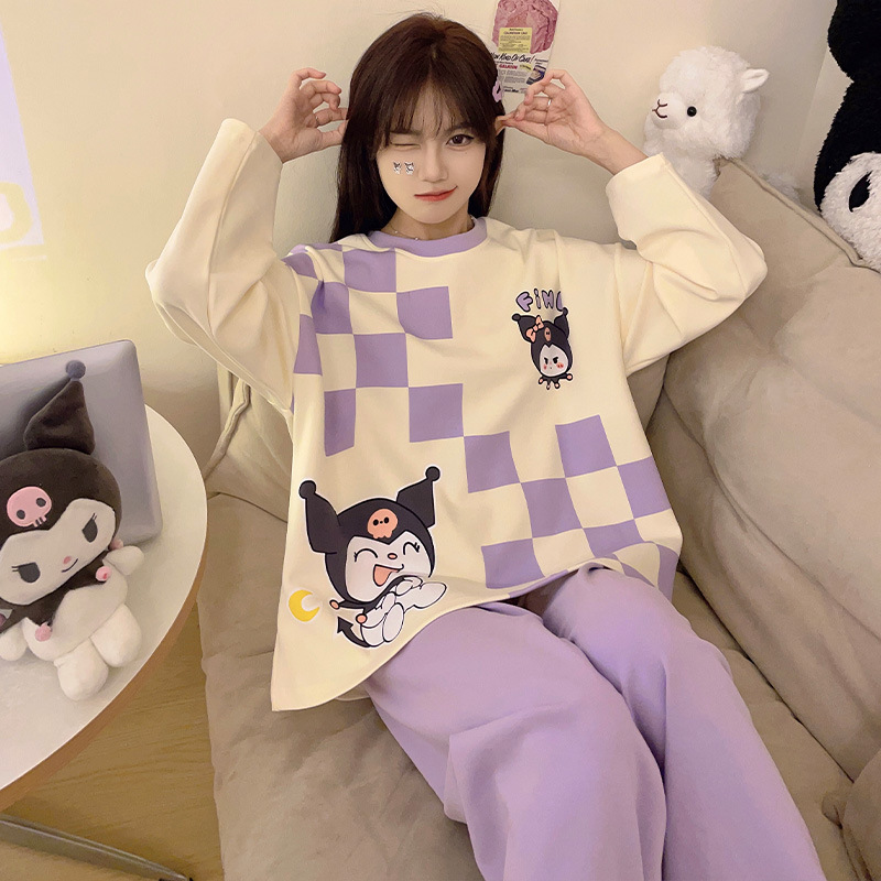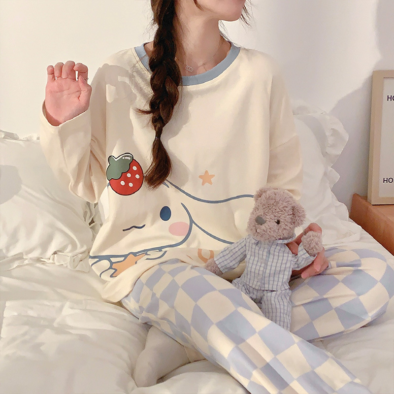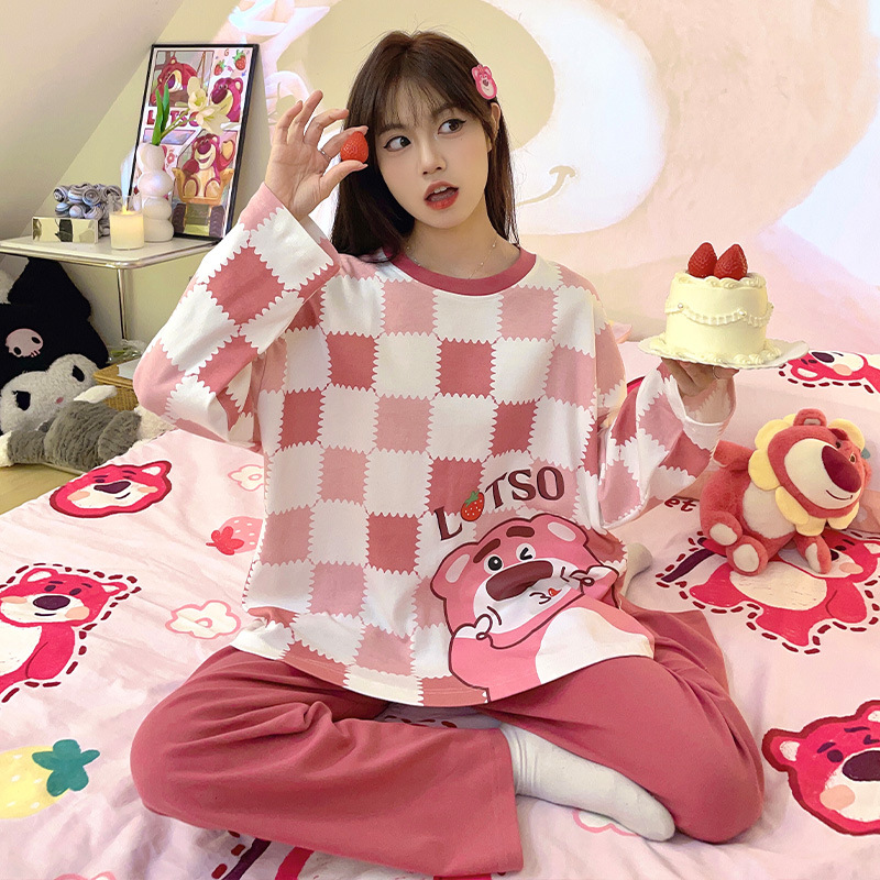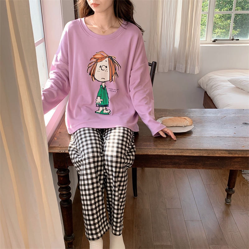 봄과 가을 잠옷 여자의 긴팔 바지 겉옷 세트 귀여운 여자의 가을과 겨울 새로운 만화 격자 무늬스토어 가기