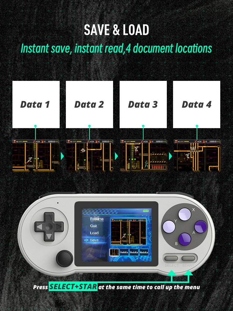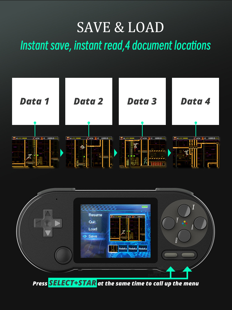 支持游戏存档。玩游戏时,同时按住SELECT+START按键可以保存/退出/重启游戏进度。下次继续玩时,无需重启即可加载保存进度。这是一个非常有用的功能。