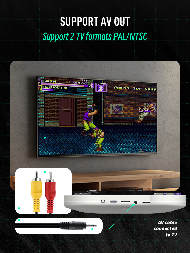十一、支持两种电视制式:PAL/NTSC。掌机采用AV音视频线可以连接电视