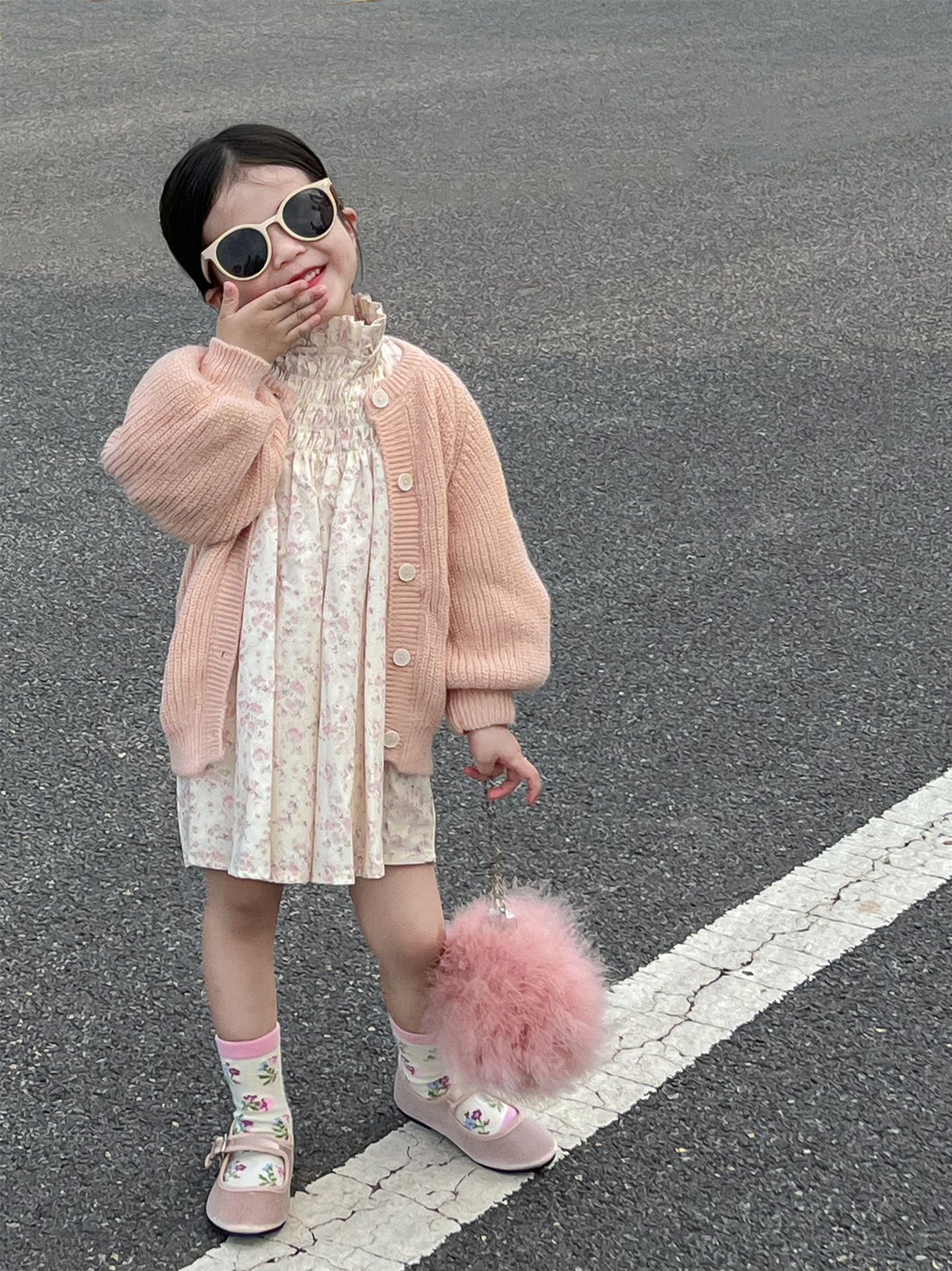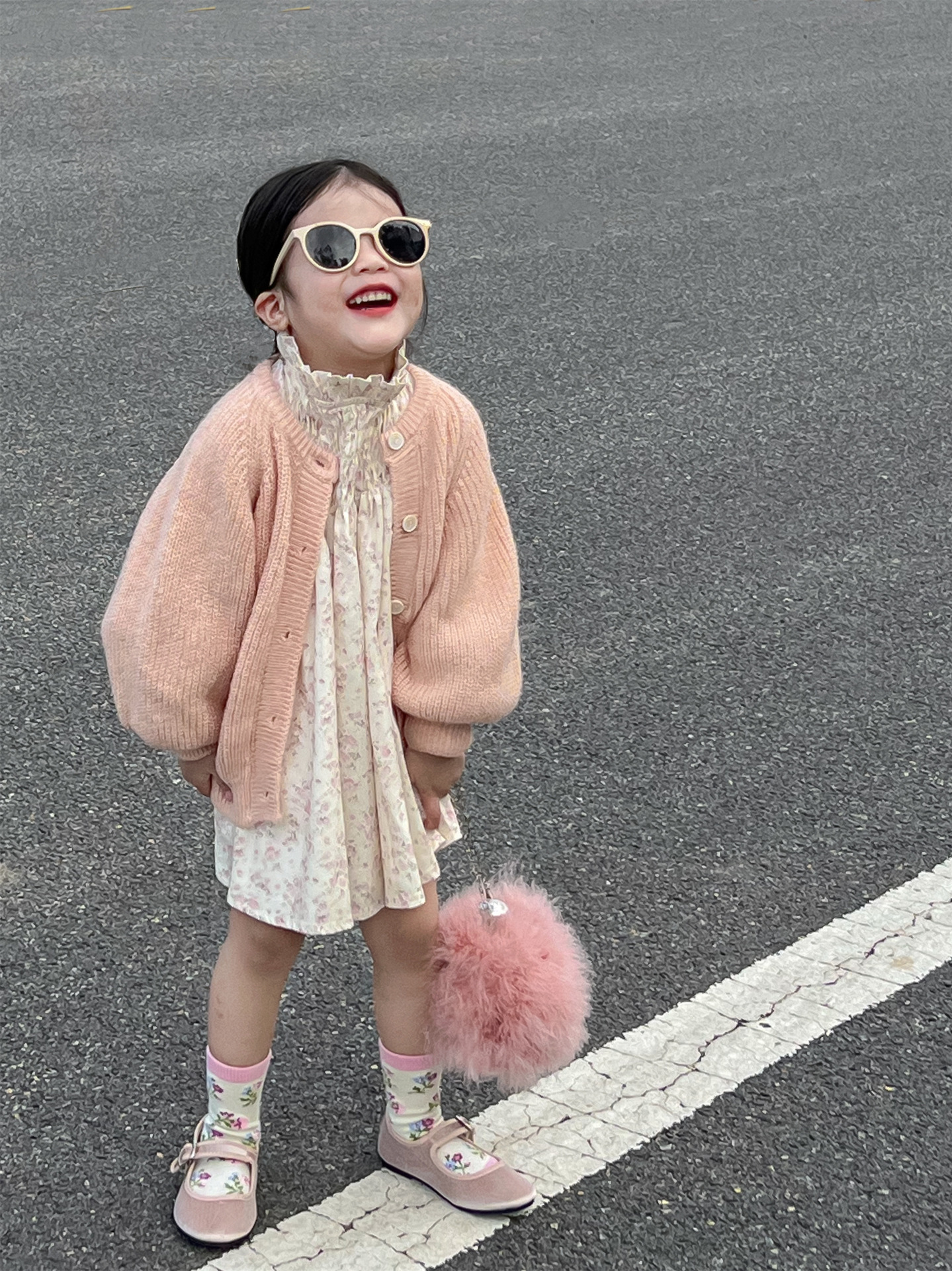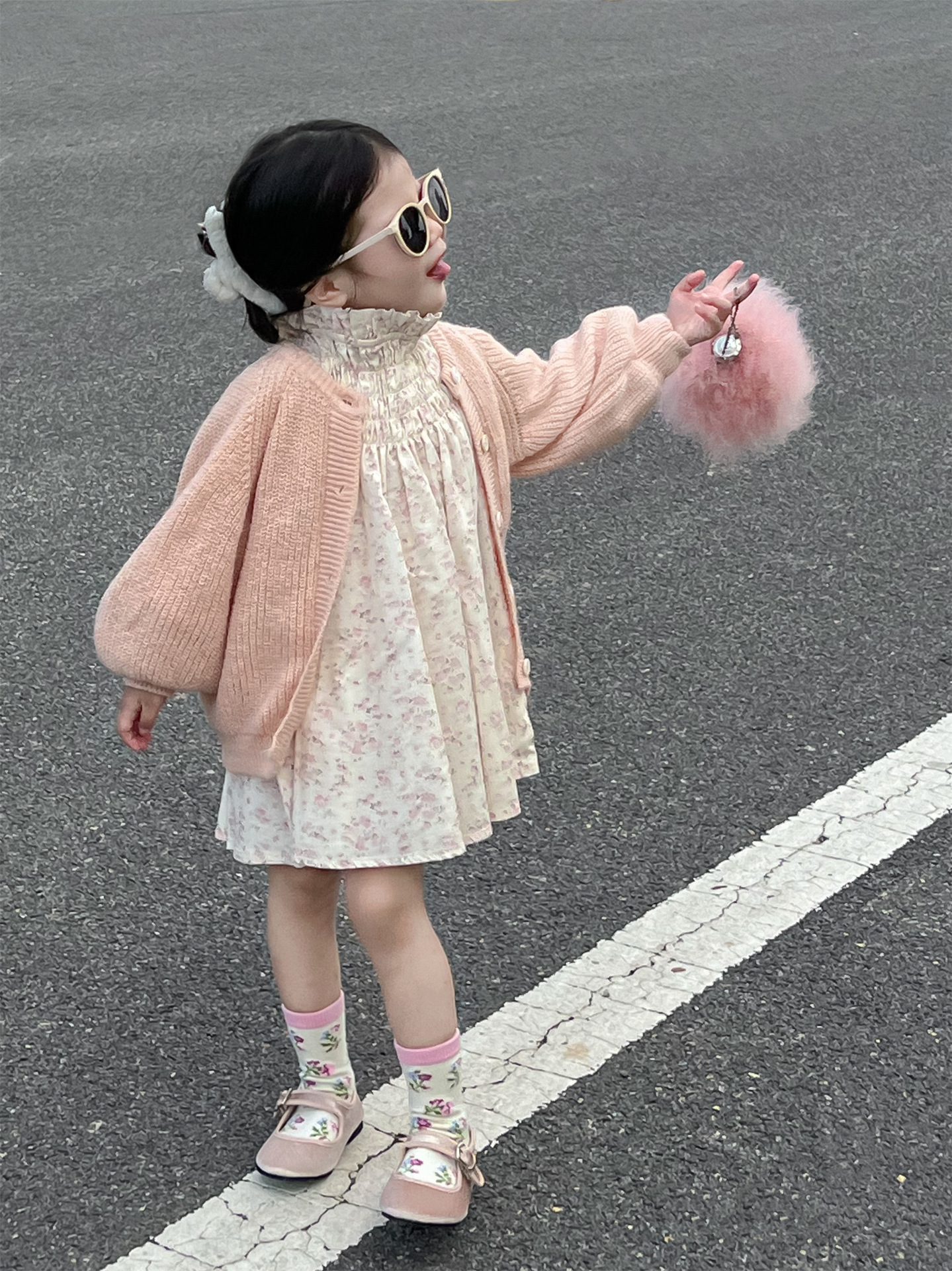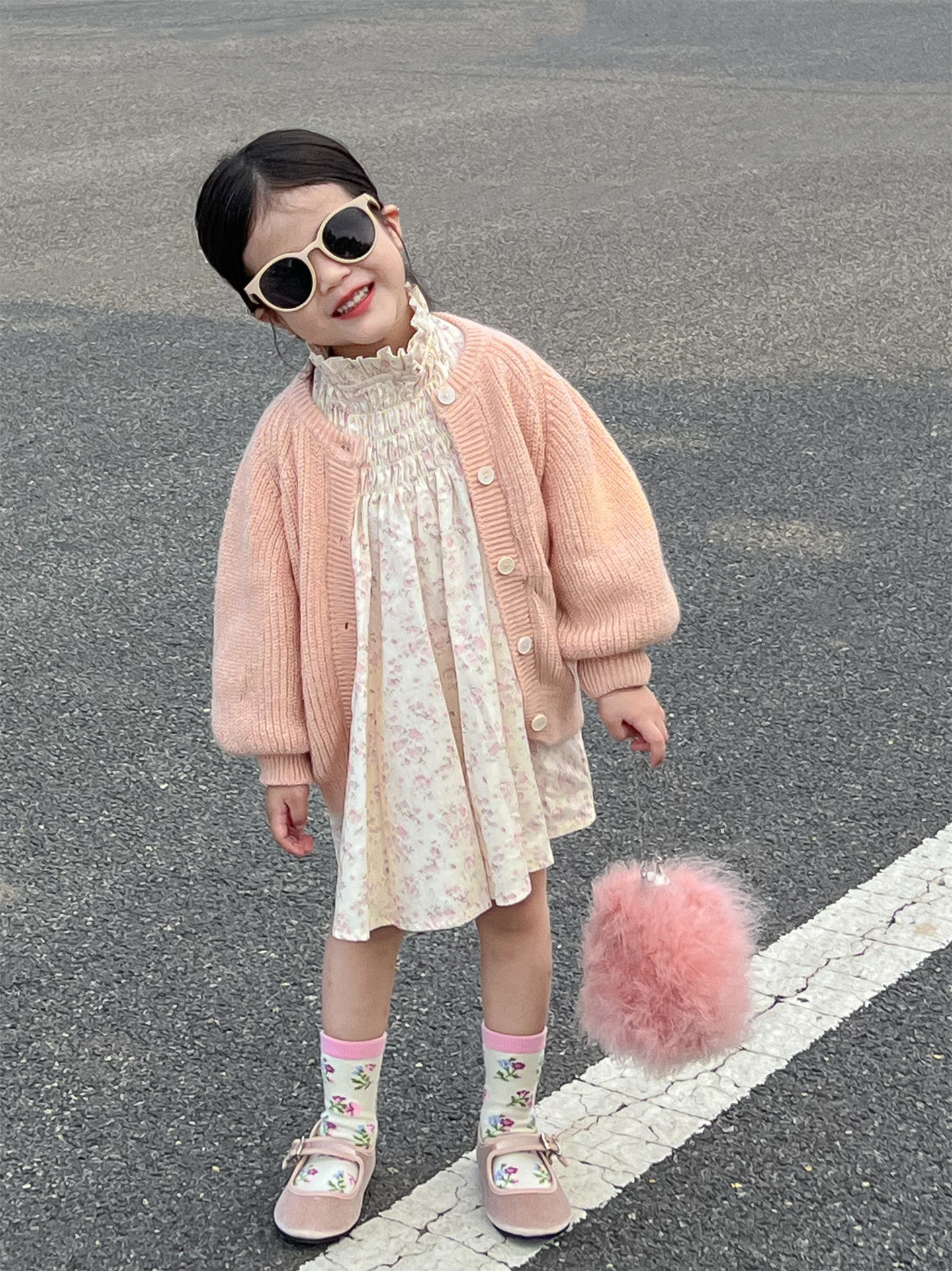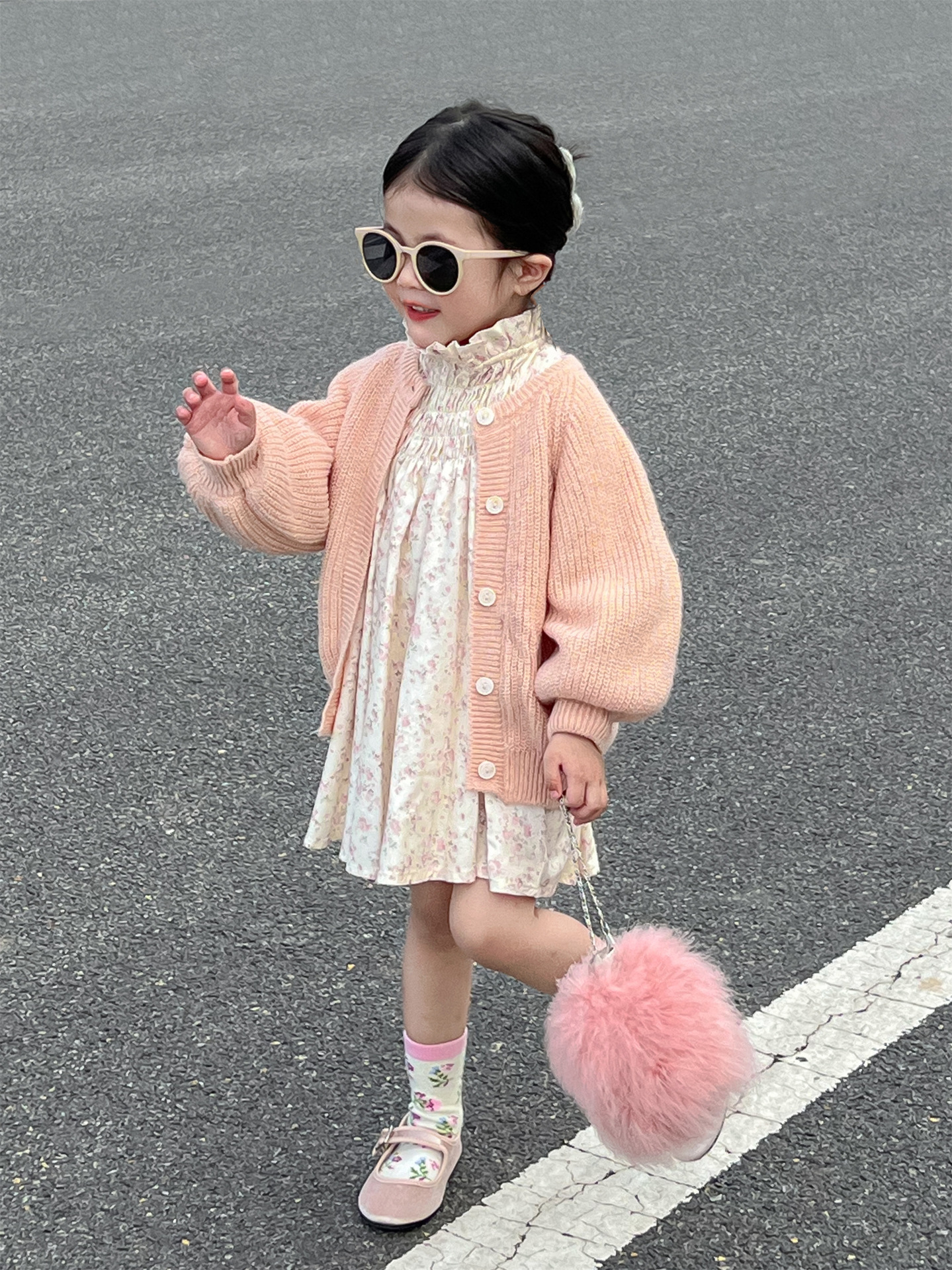 여자 가을 기질 달콤한 핑크 모헤어 스웨터 카디건 + 스탠드 칼라 핑크 꽃 원피스 별도 촬영