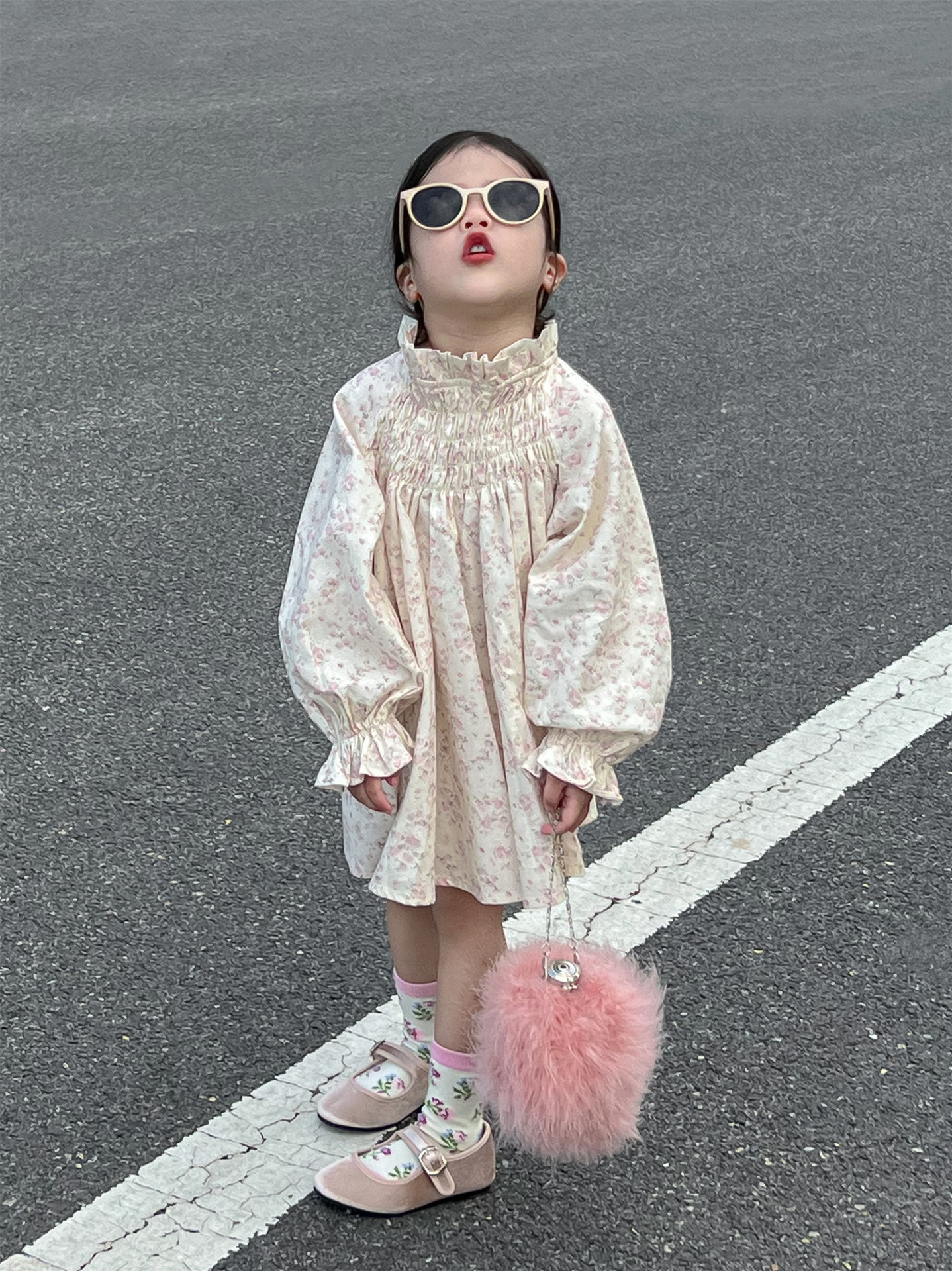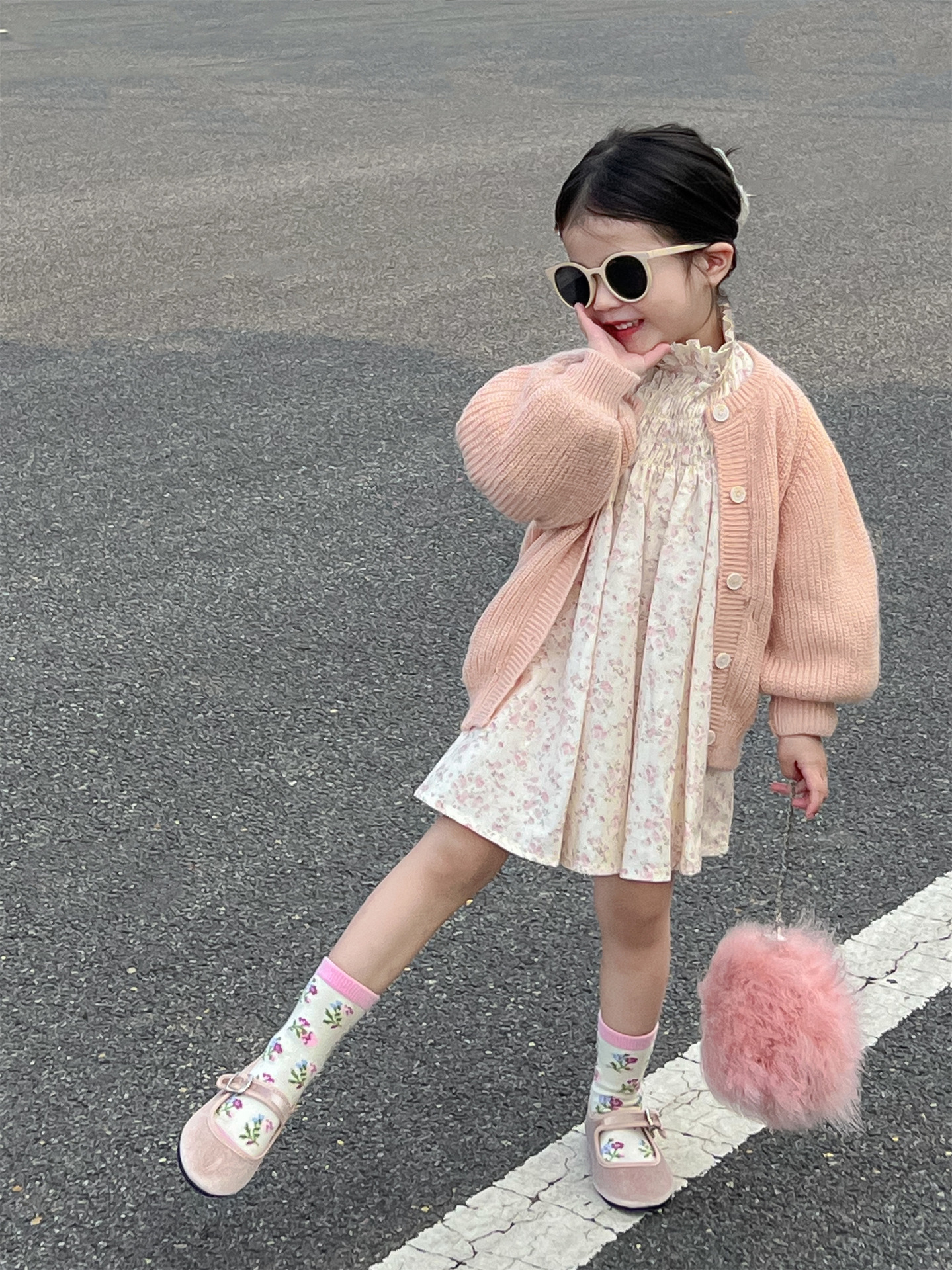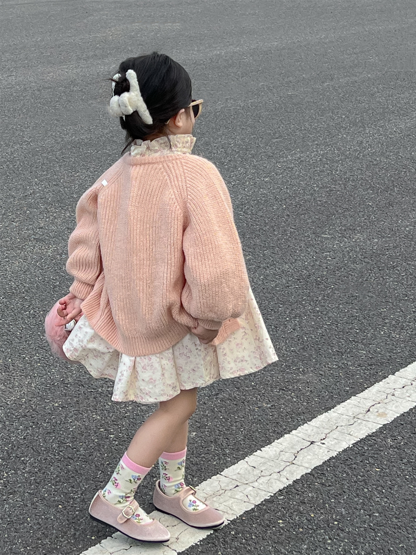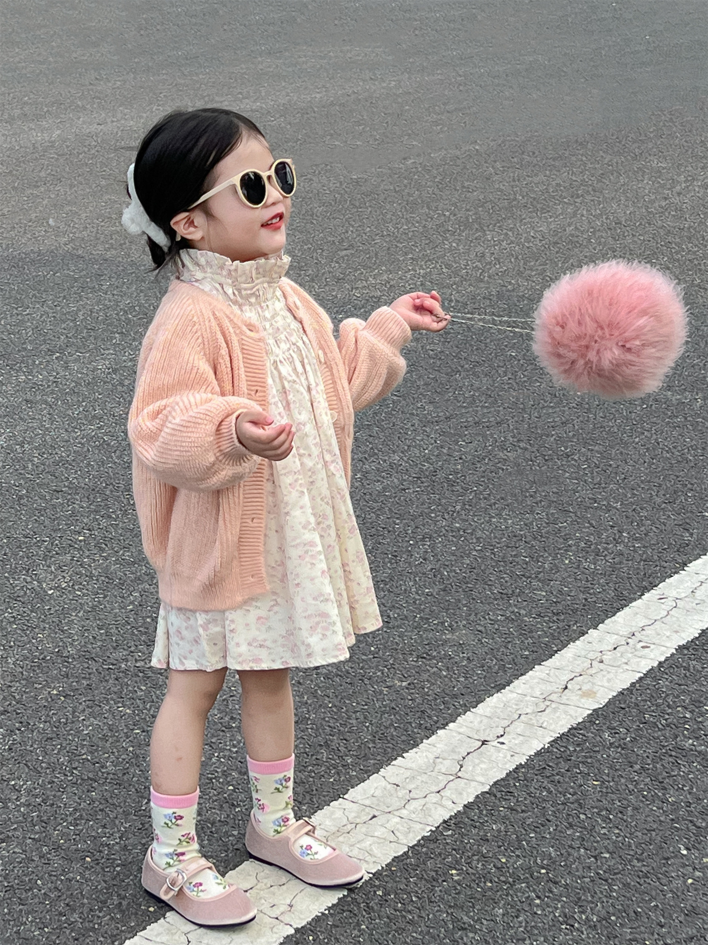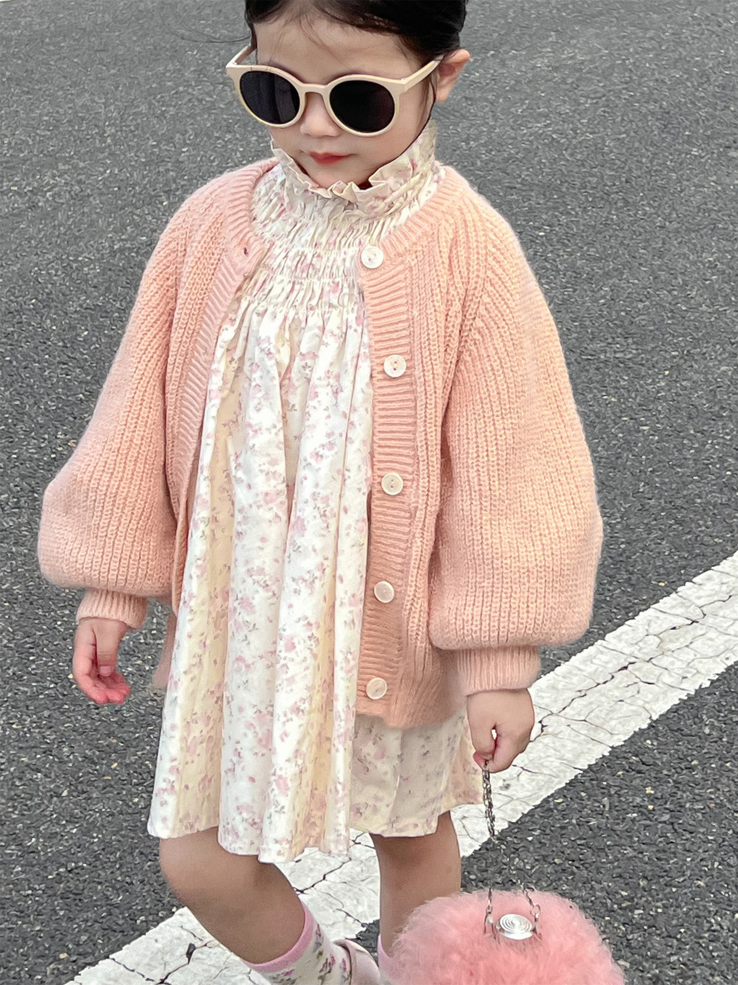 여자 가을 기질 달콤한 핑크 모헤어 스웨터 카디건 + 스탠드 칼라 핑크 꽃 원피스 별도 촬영