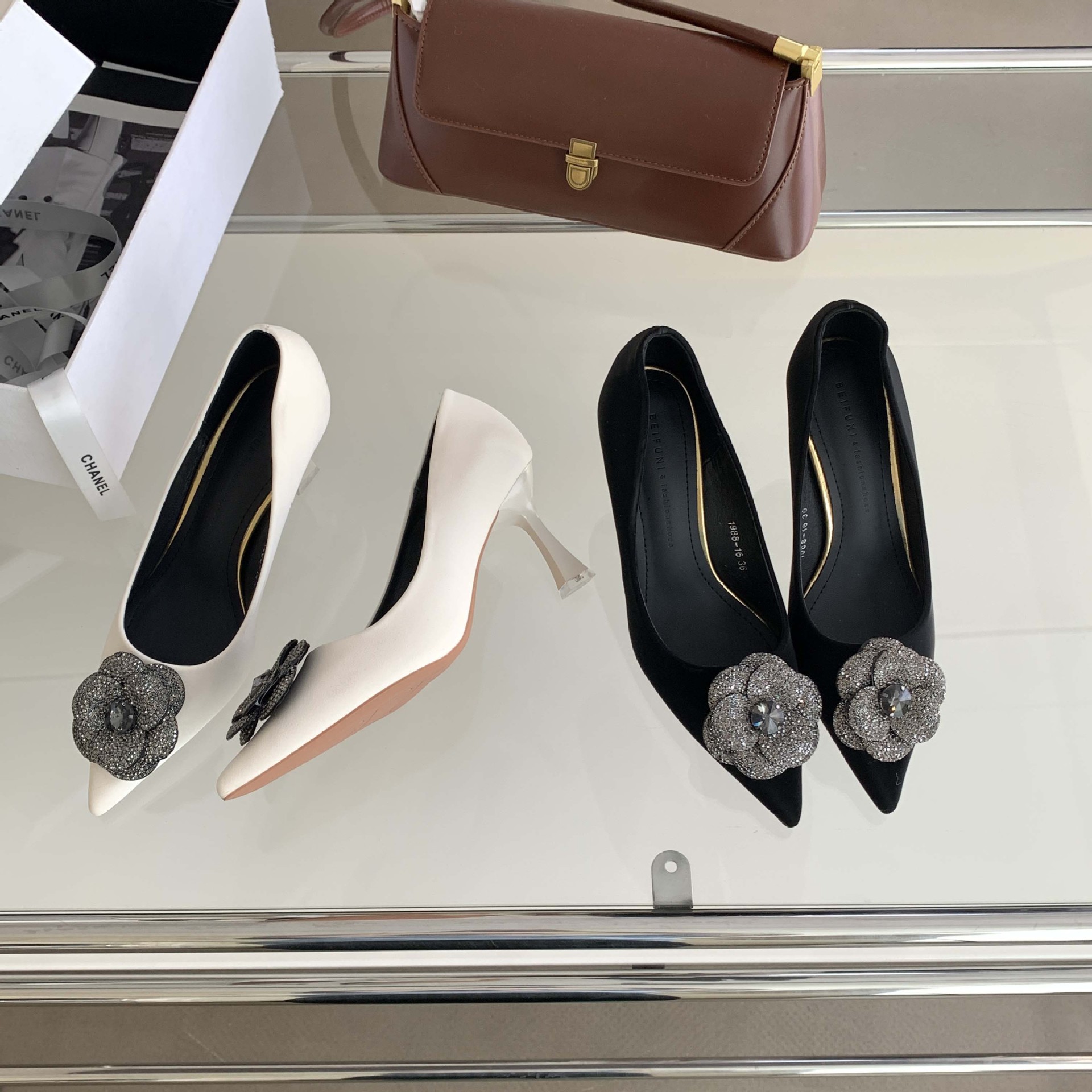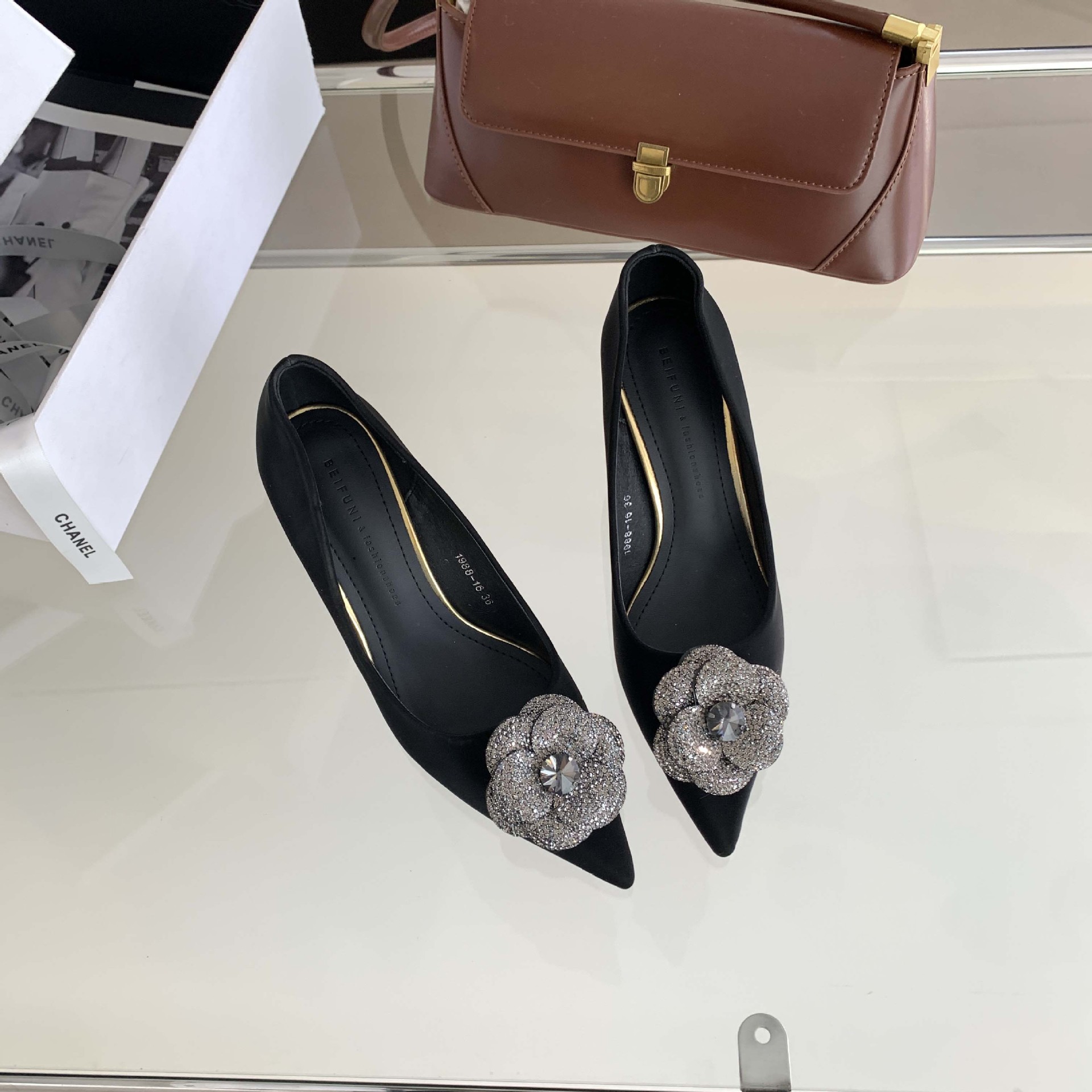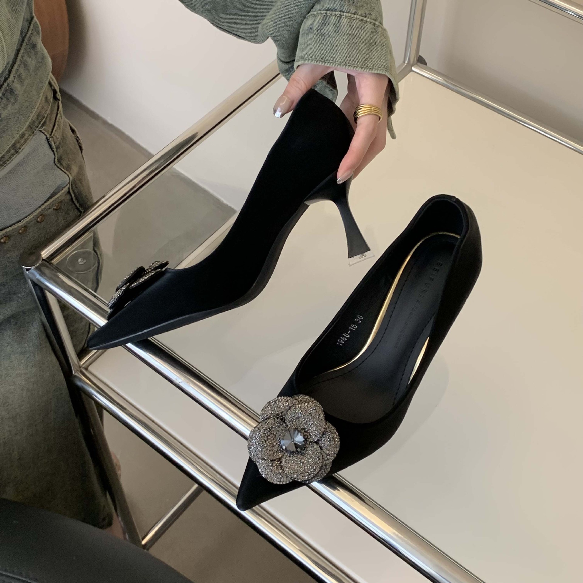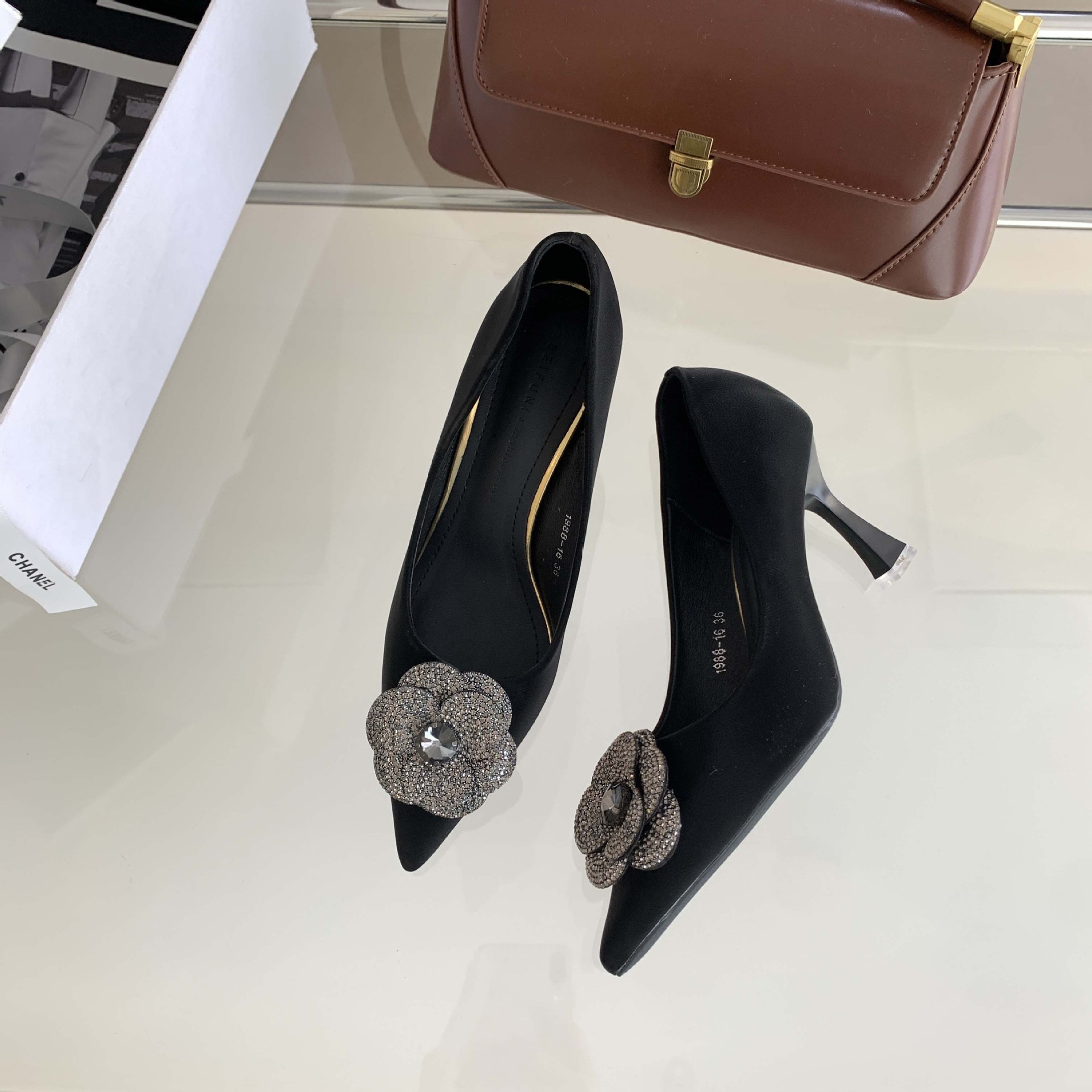 1988-16 프랑스 모조 다이아몬드 스파클링 동백 꽃 뾰족한 하이힐 2023 여성을위한 새로운 기질 부드러운 가죽 신발스토어 가기
