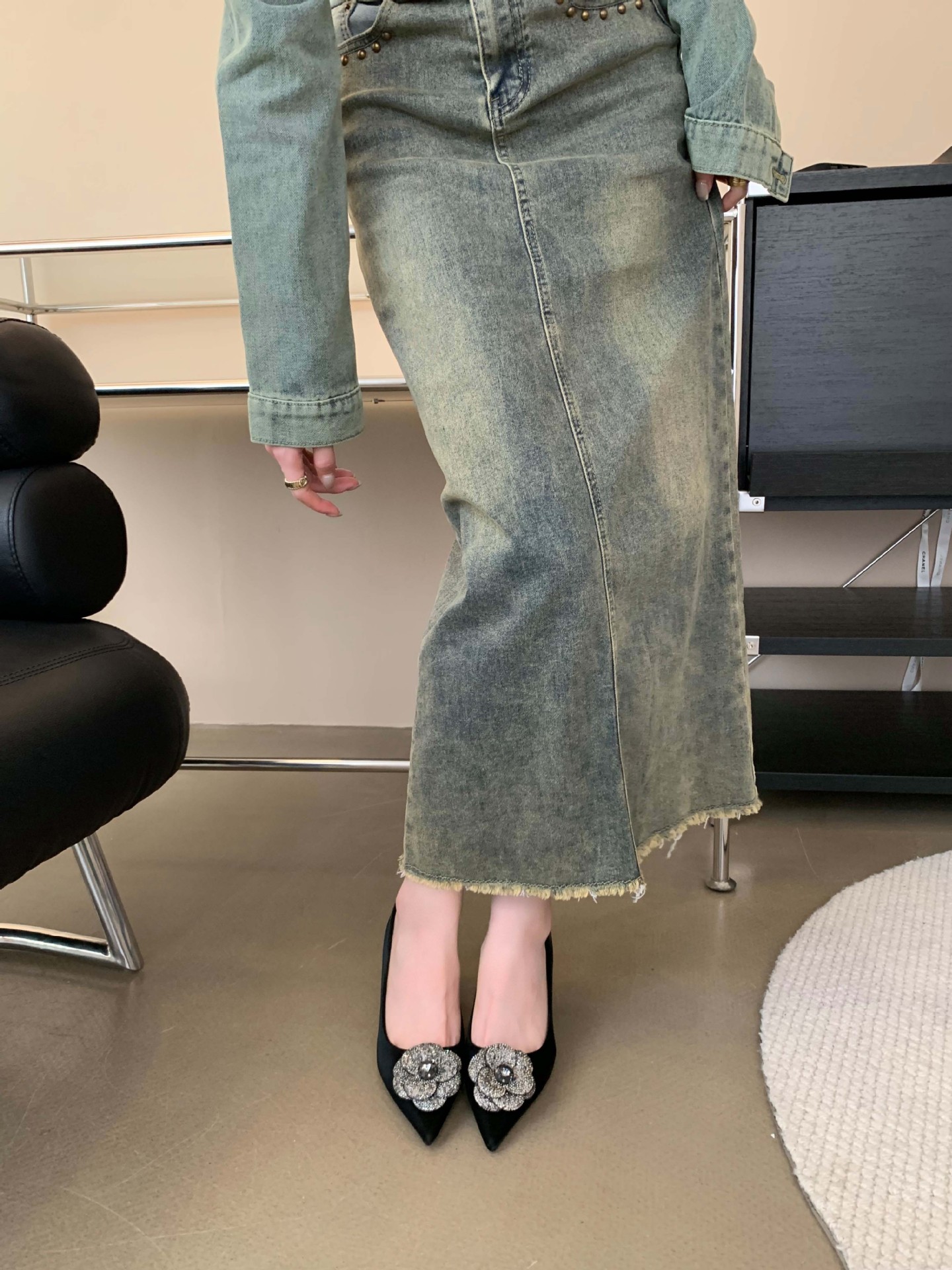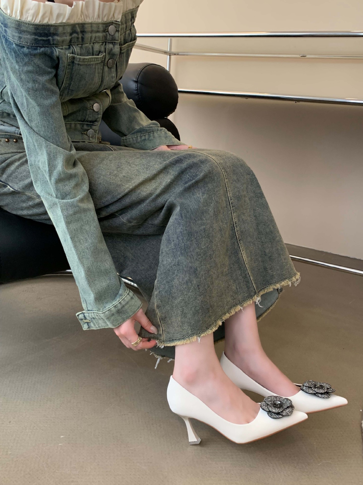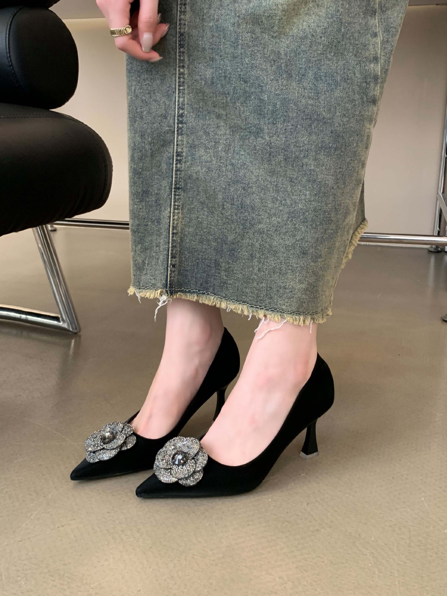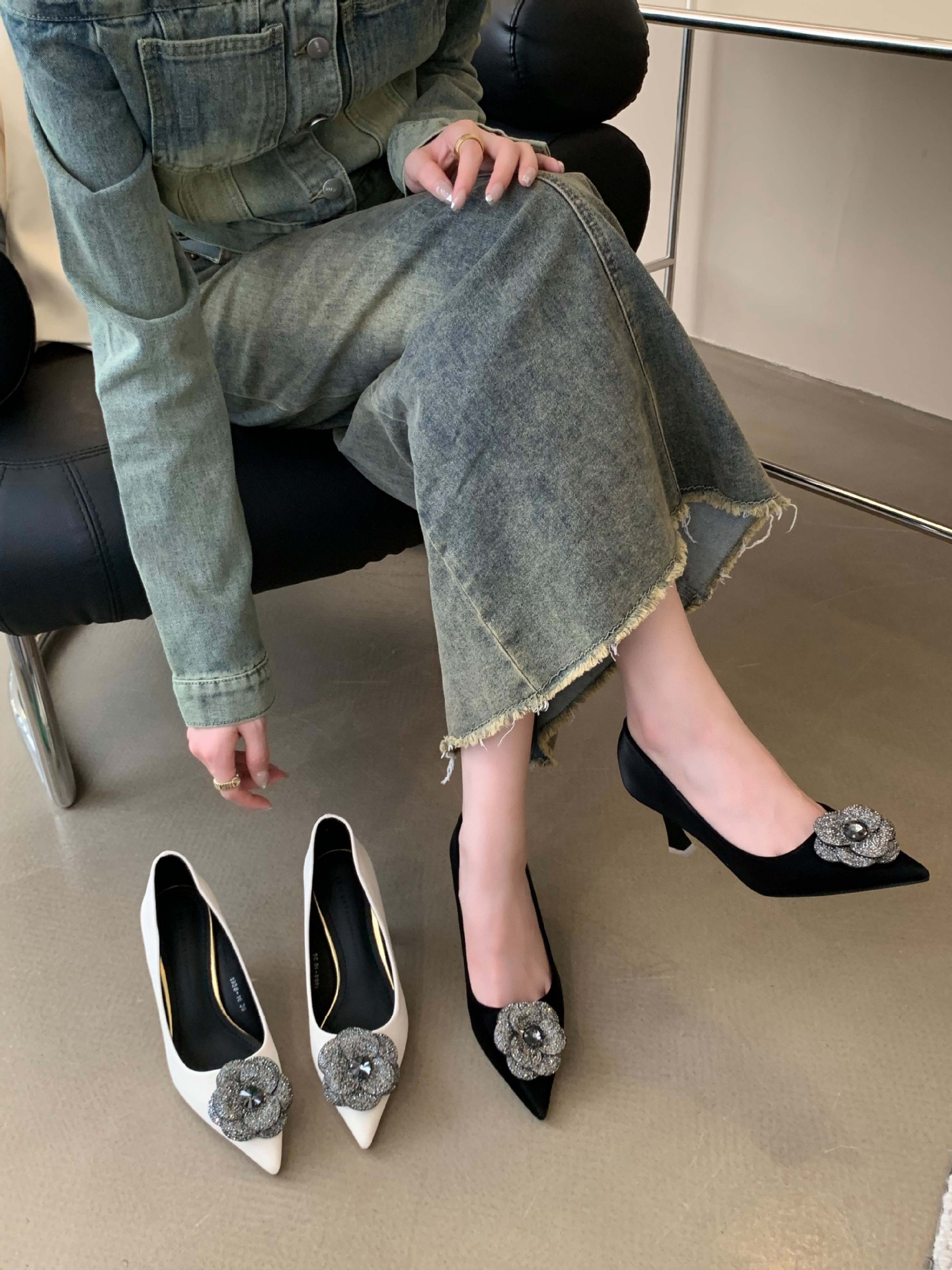 1988-16 프랑스 모조 다이아몬드 스파클링 동백 꽃 뾰족한 하이힐 2023 여성을위한 새로운 기질 부드러운 가죽 신발스토어 가기