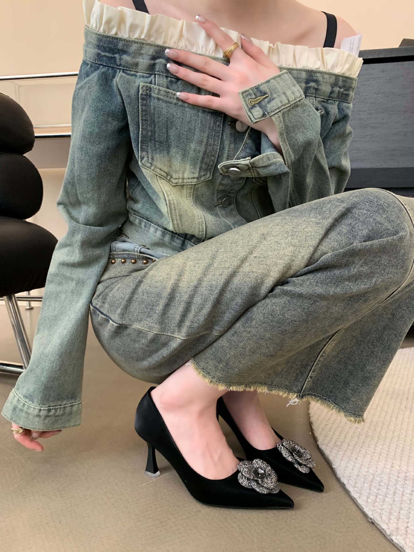 1988-16 프랑스 모조 다이아몬드 스파클링 동백 꽃 뾰족한 하이힐 2023 여성을위한 새로운 기질 부드러운 가죽 신발