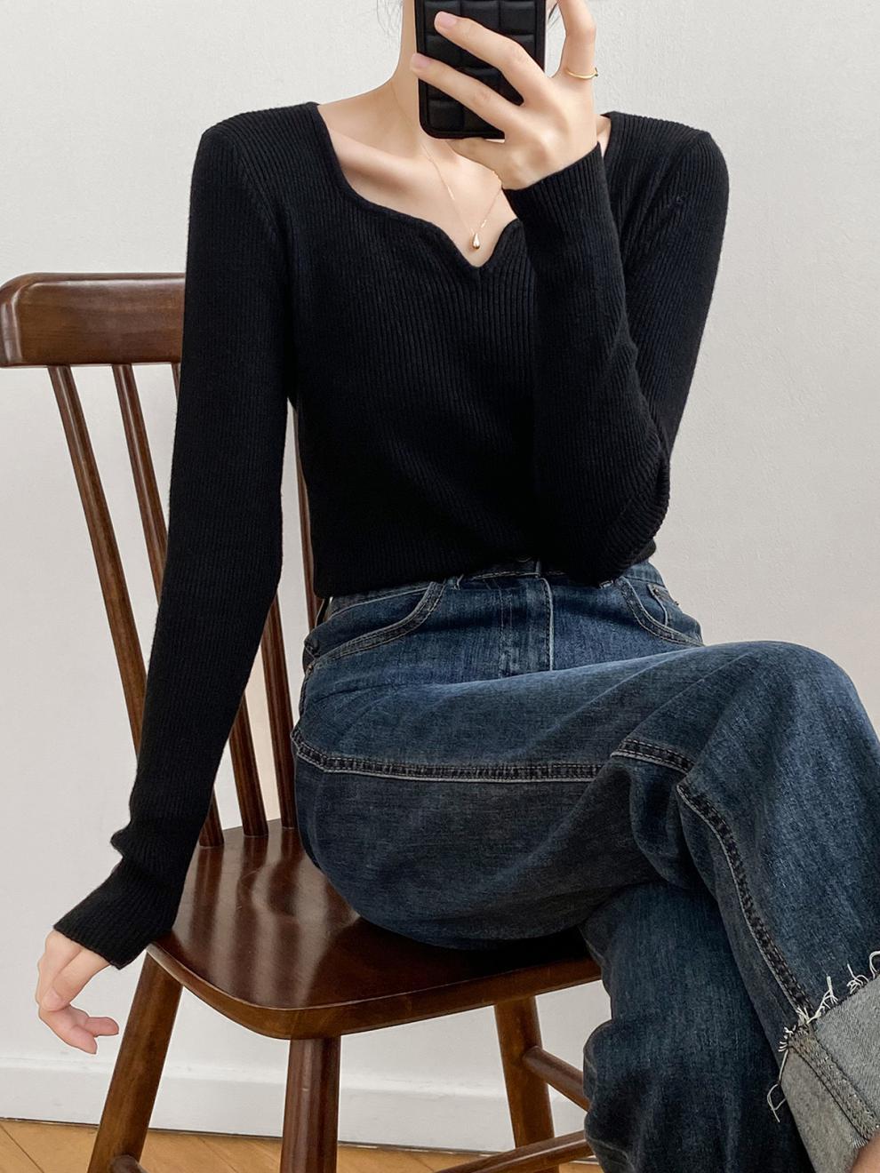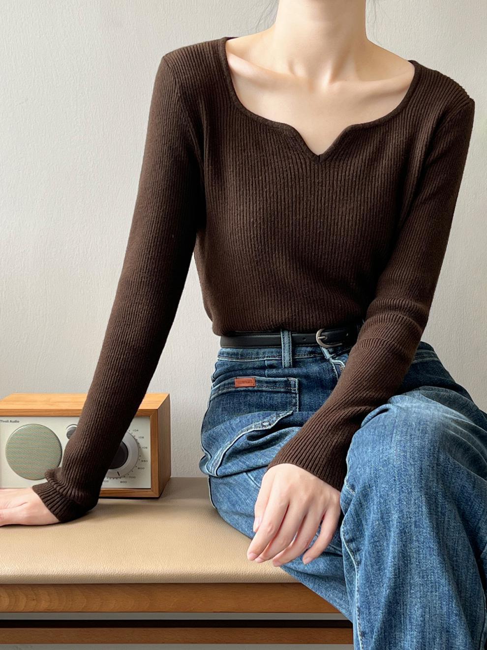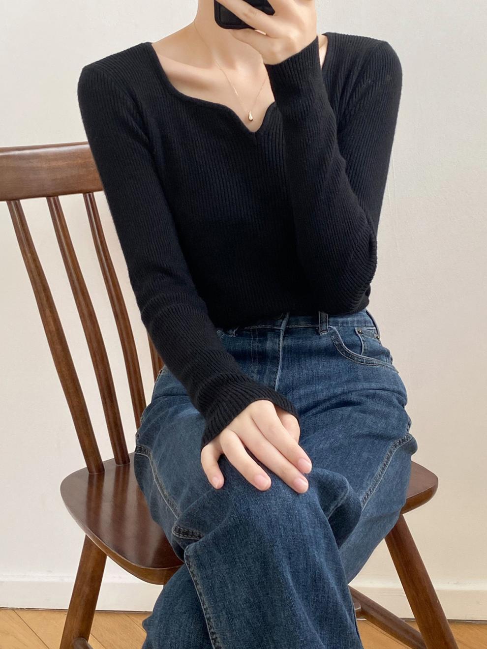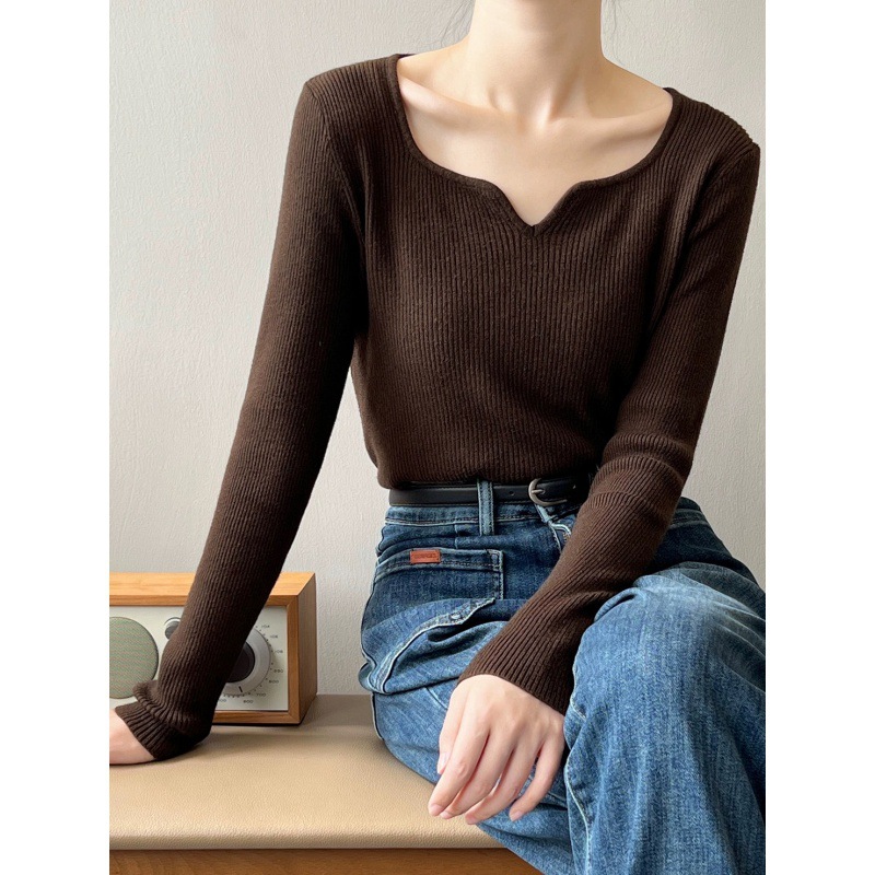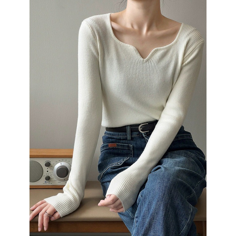 프랑스 복고풍 V-넥 니트 베이스 셔츠 여성용 2023 봄과 가을 새로운 틈새 인테리어 슬림핏 슬리밍 긴팔 탑