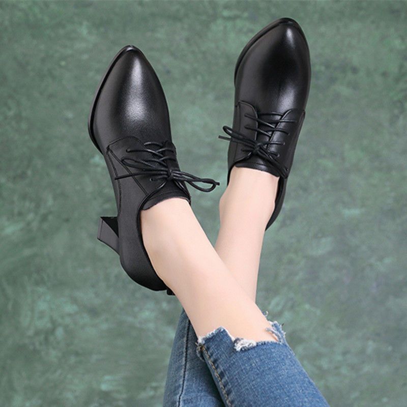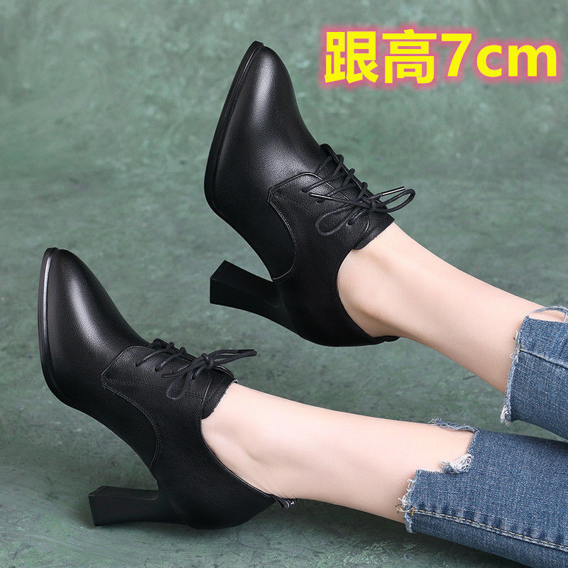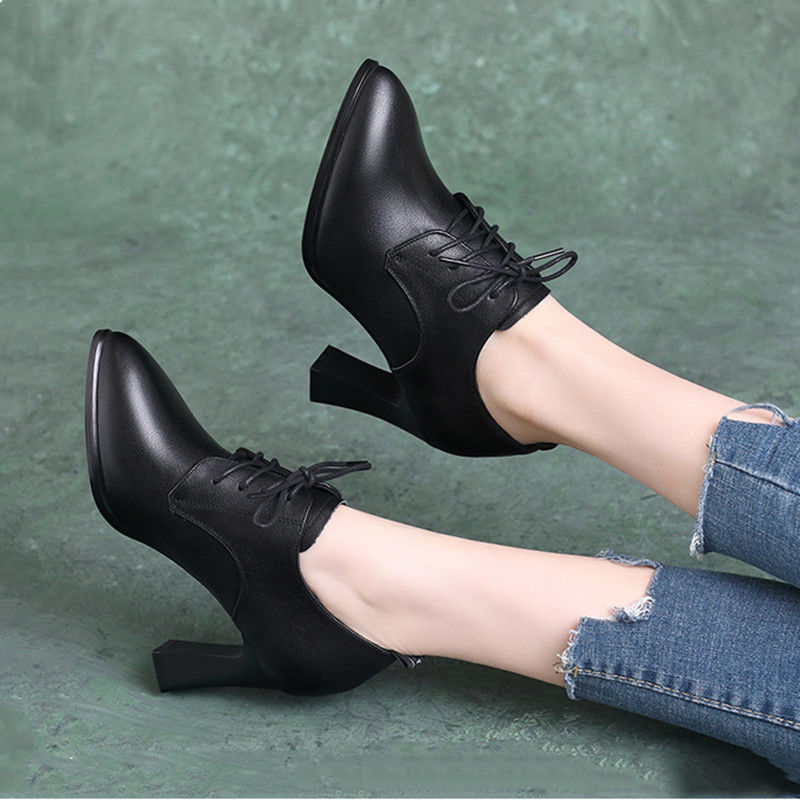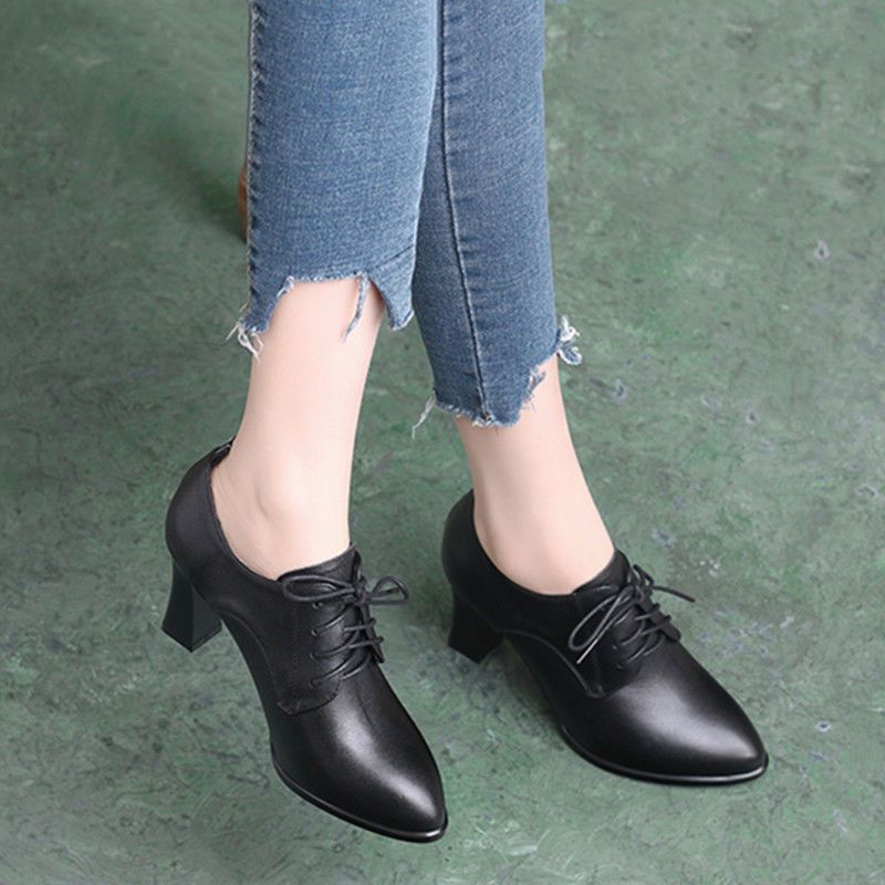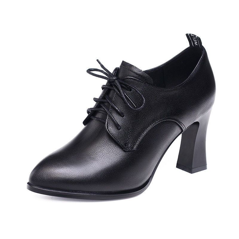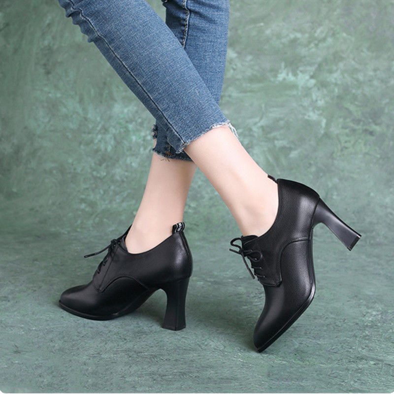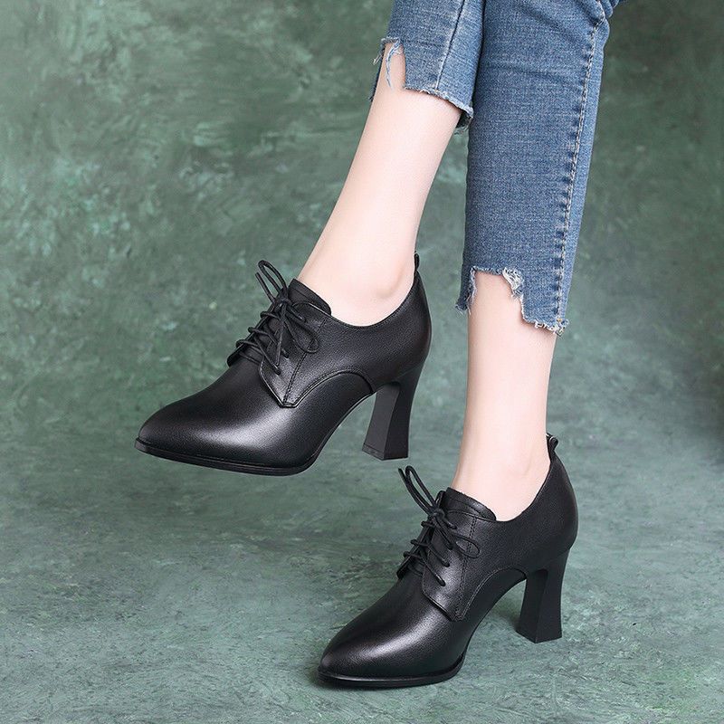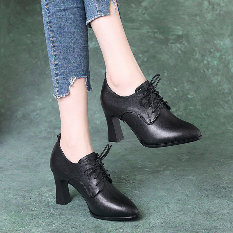 브랜드 싱글 레이어 슈즈 여성용 뾰족한 두꺼운 힐 올 매치 봄 2023 새로운 딥 컷 스몰 가죽 신발 영국식 블랙 하이힐스토어 가기