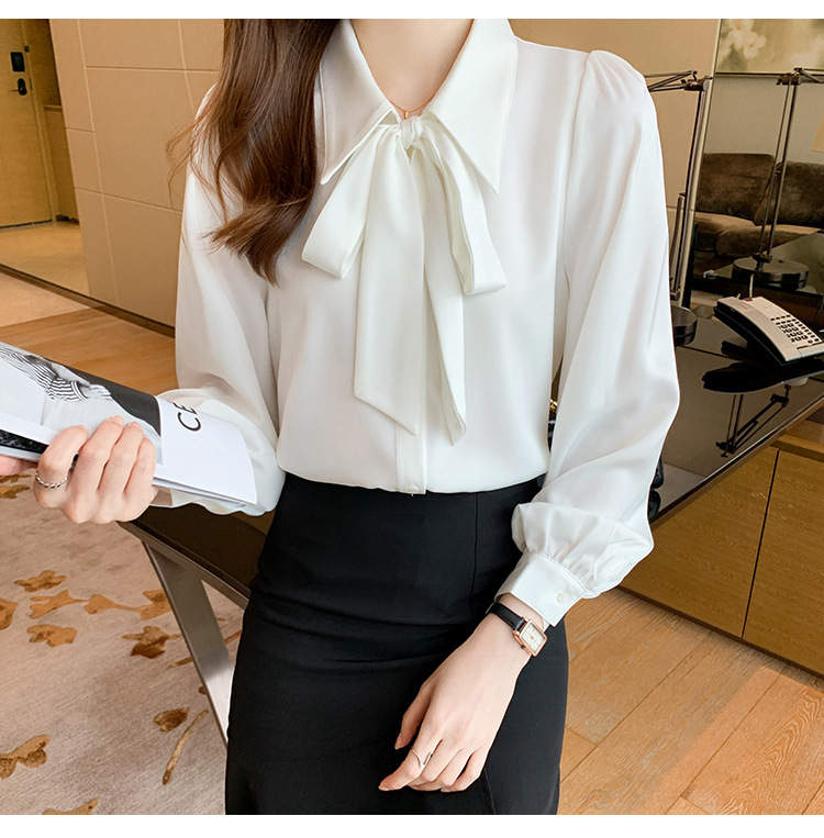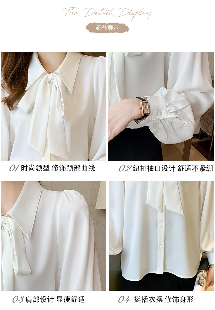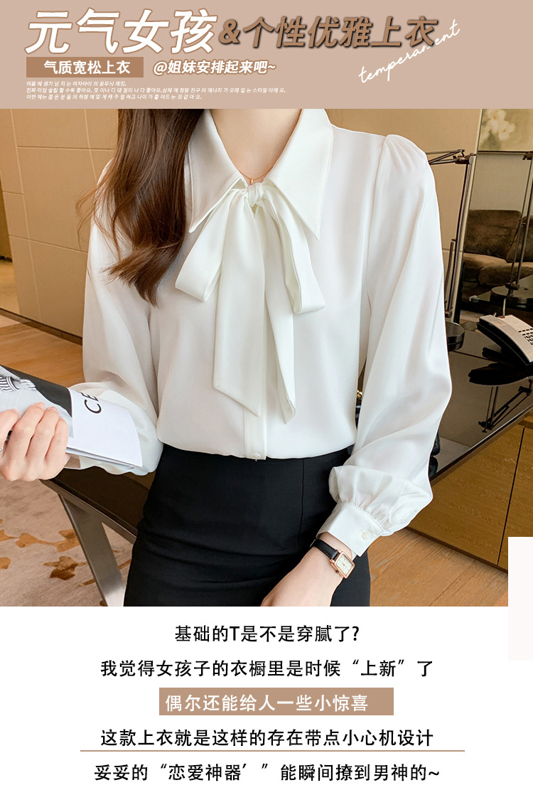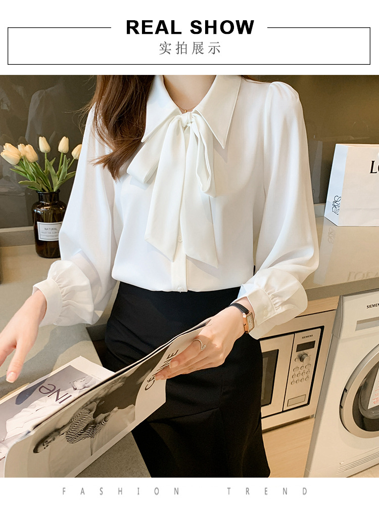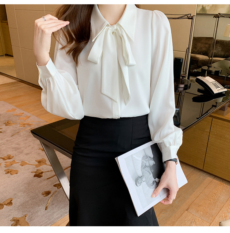 가을 2023 화이트 긴팔 쉬폰 셔츠 여성용 스몰 바디 드레이핑 한국 스타일 리본 탑 젠틀 스타일 셔츠스토어 가기
